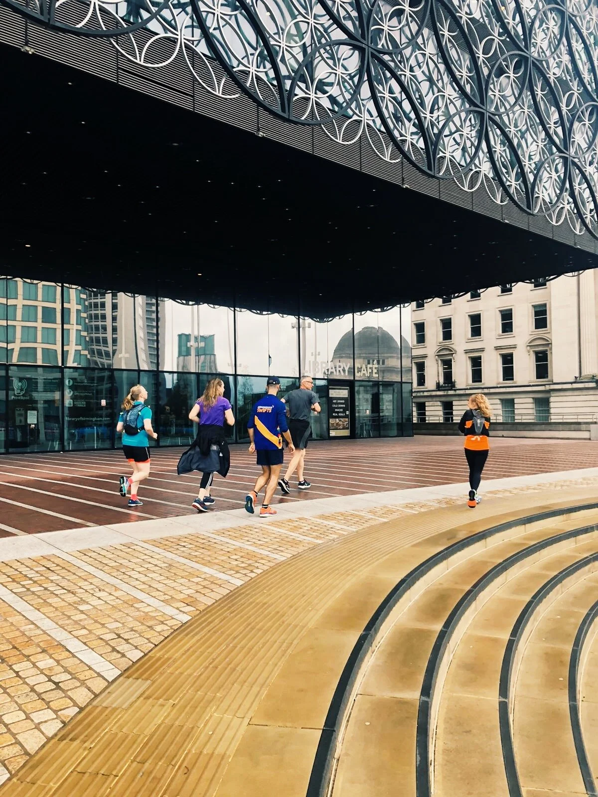 People jogging near a modern building with intricate circular patterns on the facade and large glass windows. The foreground features curved steps and paving.