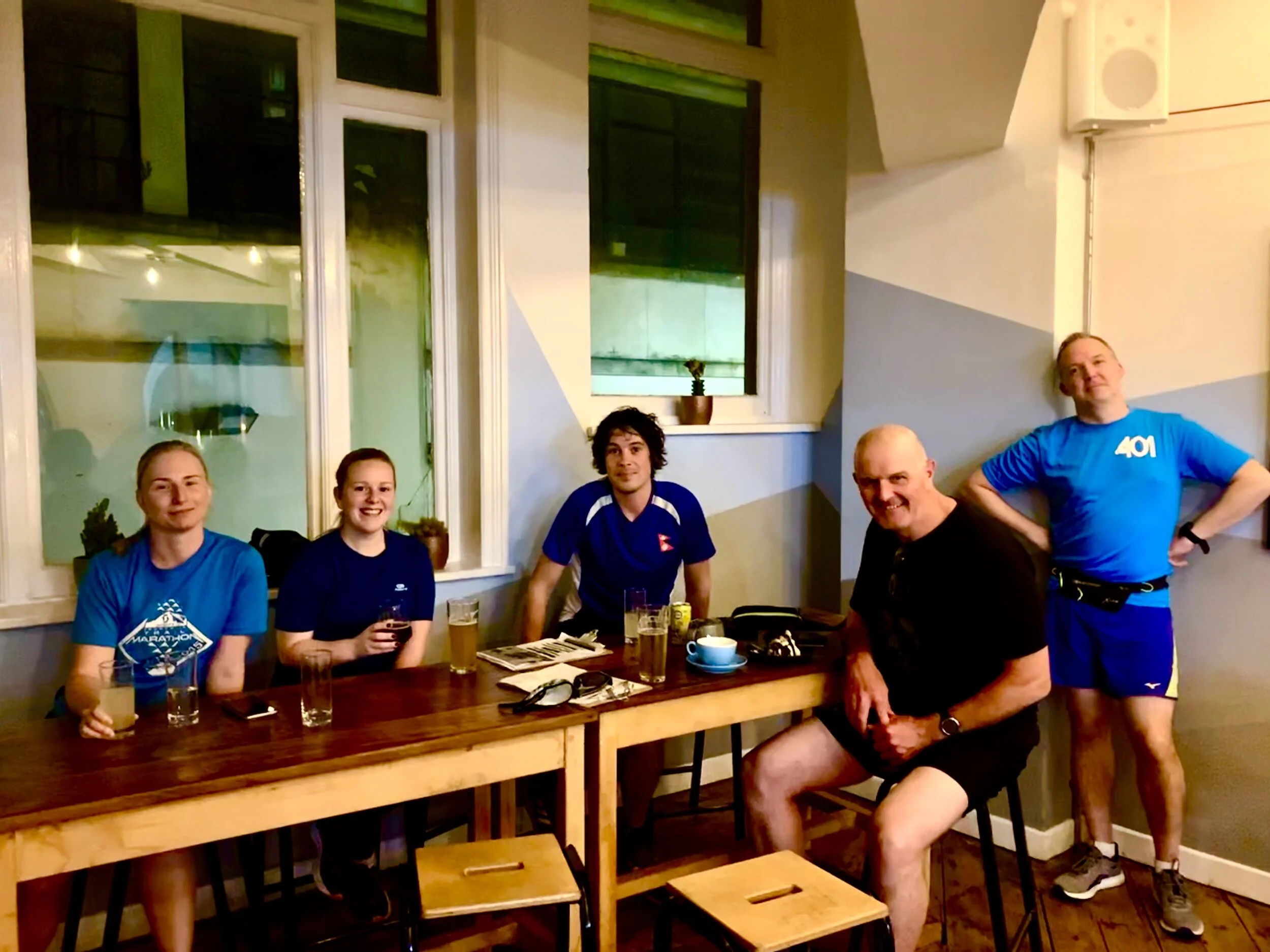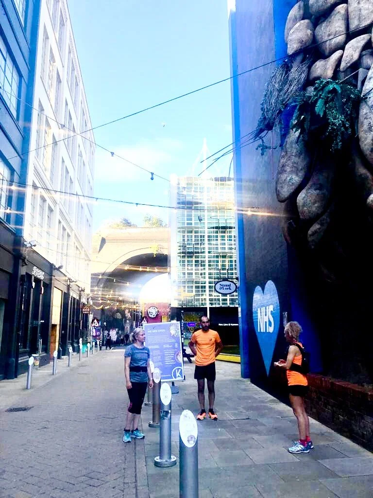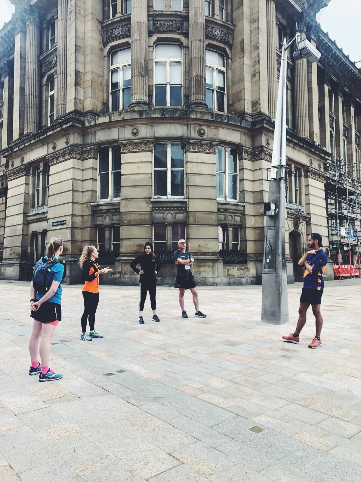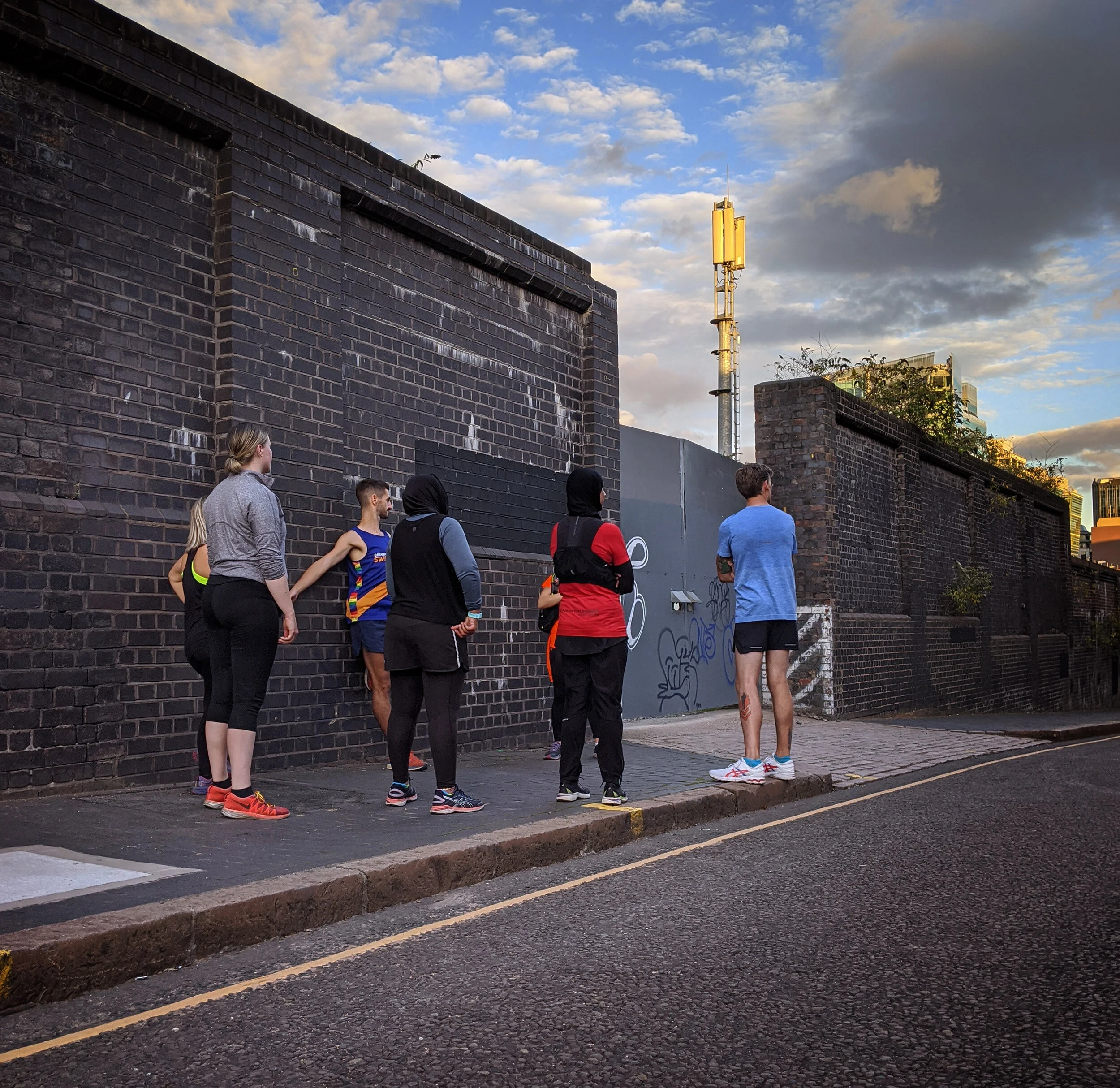 Group of runners standing on a paved area, some in athletic gear, discussing in front of a wall with informational signs about Old Curzon Street Station, under a cloudy sky.