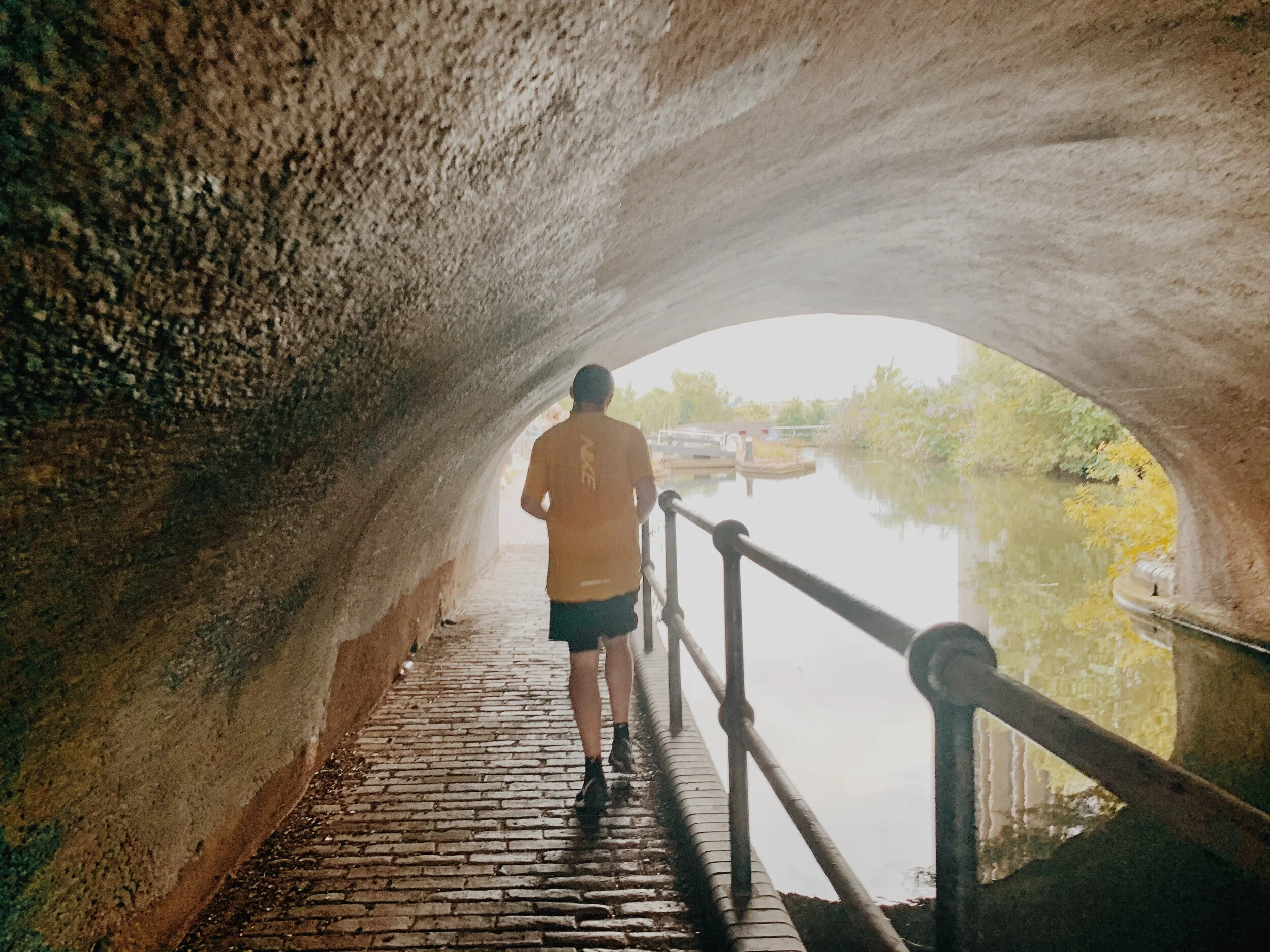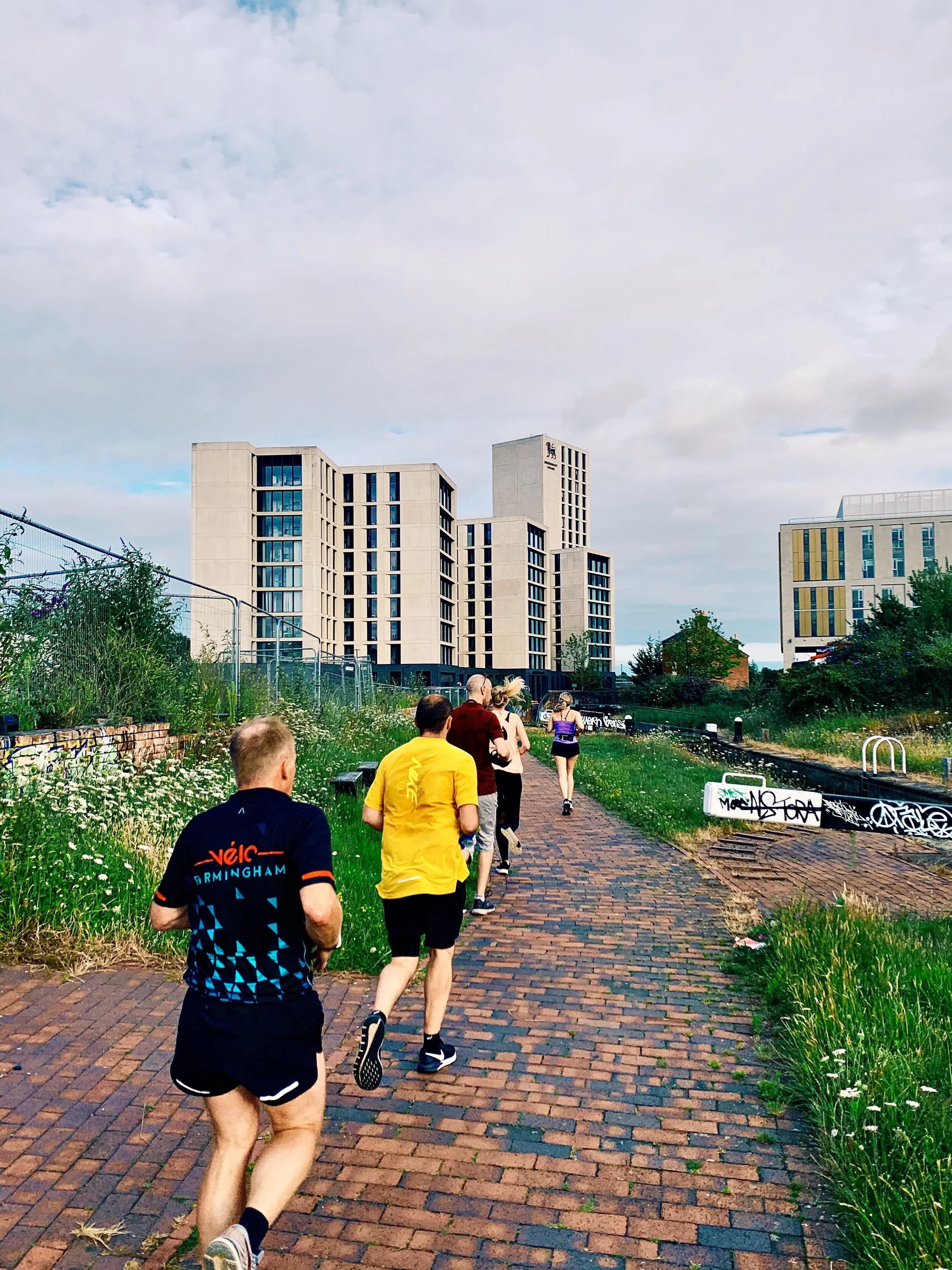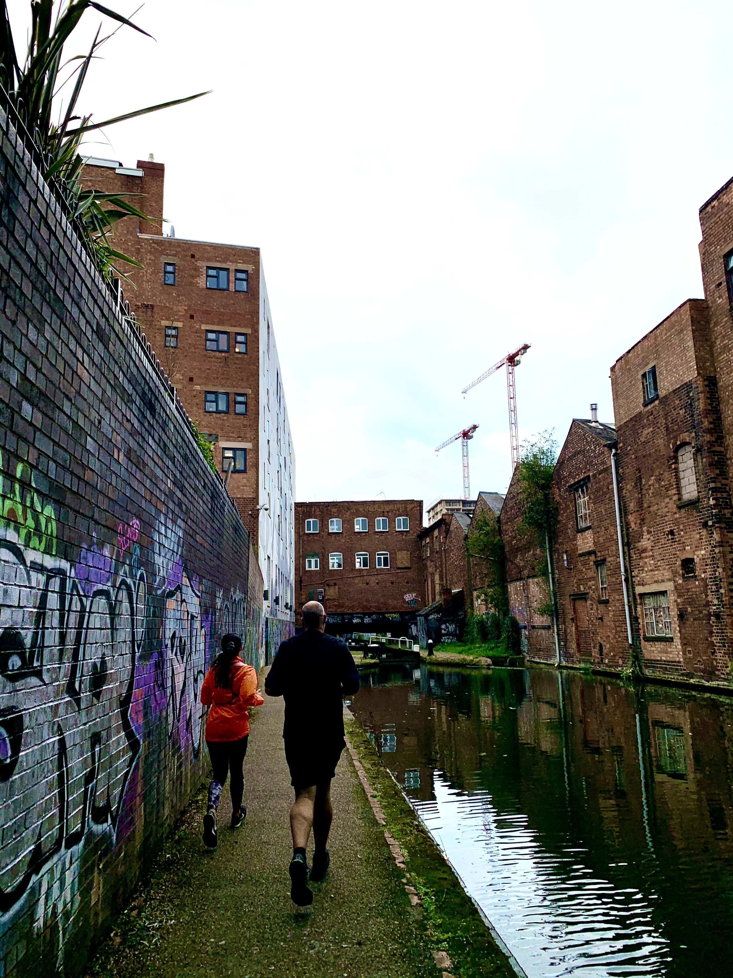 Man jogging along a canal path with a bridge, brick buildings, and boats in Birmingham, UK.