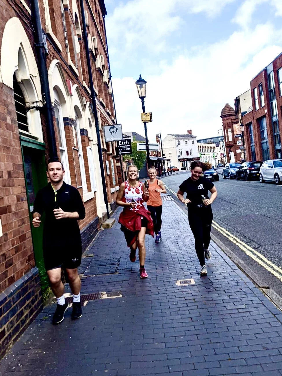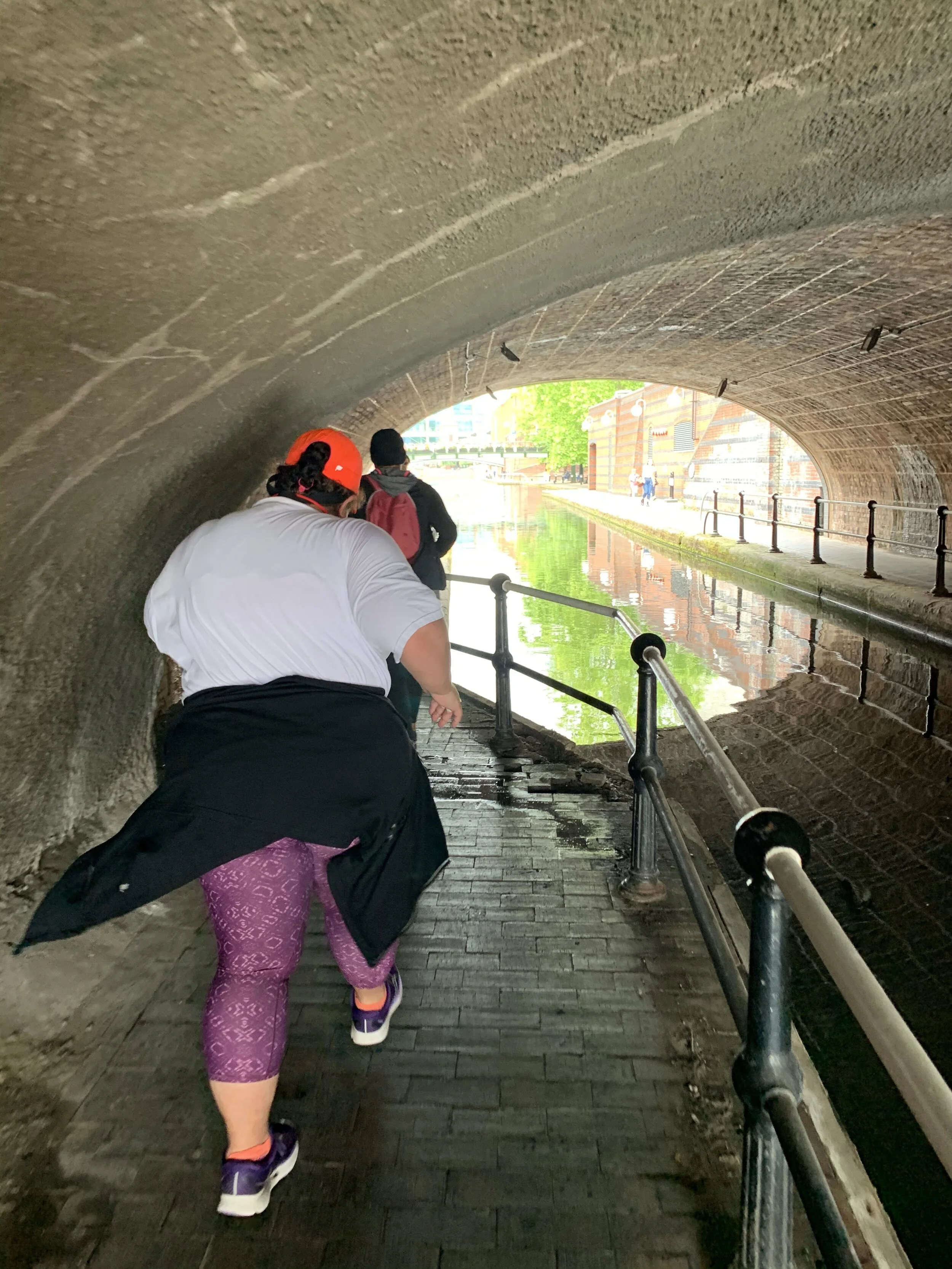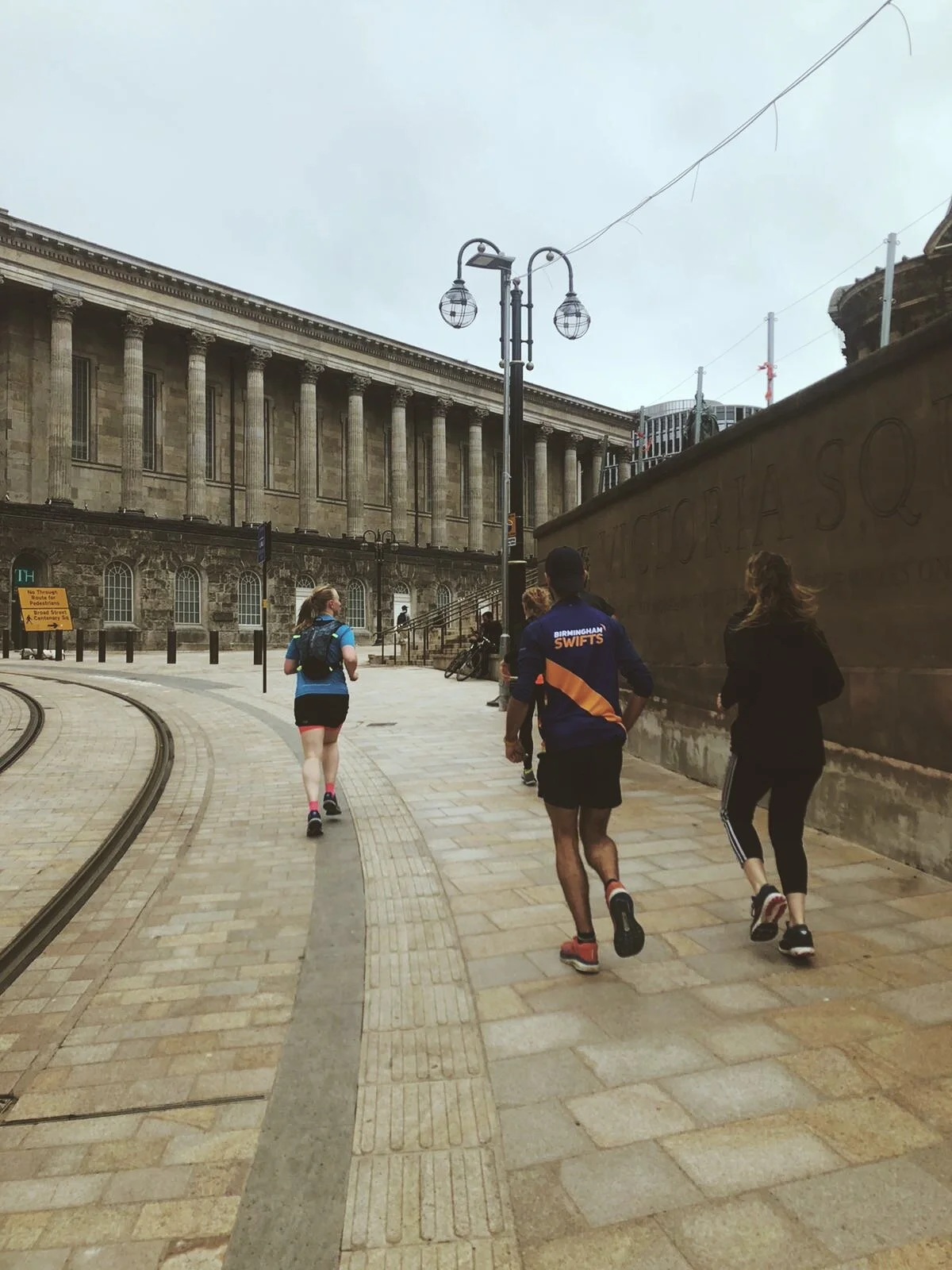Man jogging along a canal path with a bridge, brick buildings, and boats in Birmingham, UK.