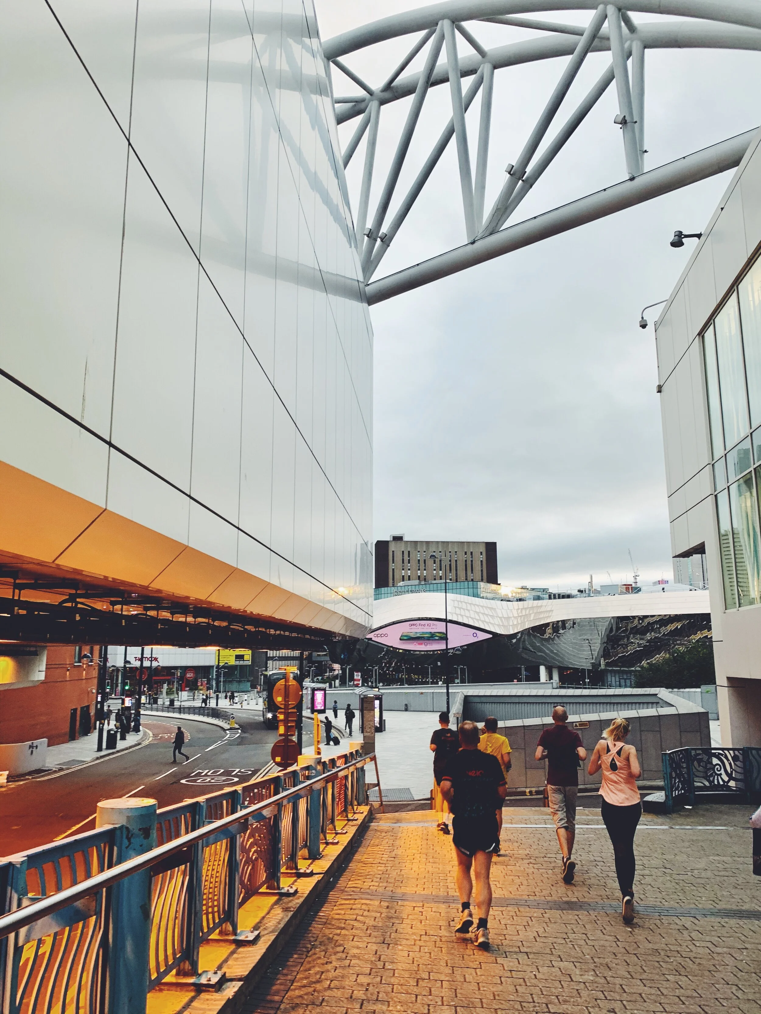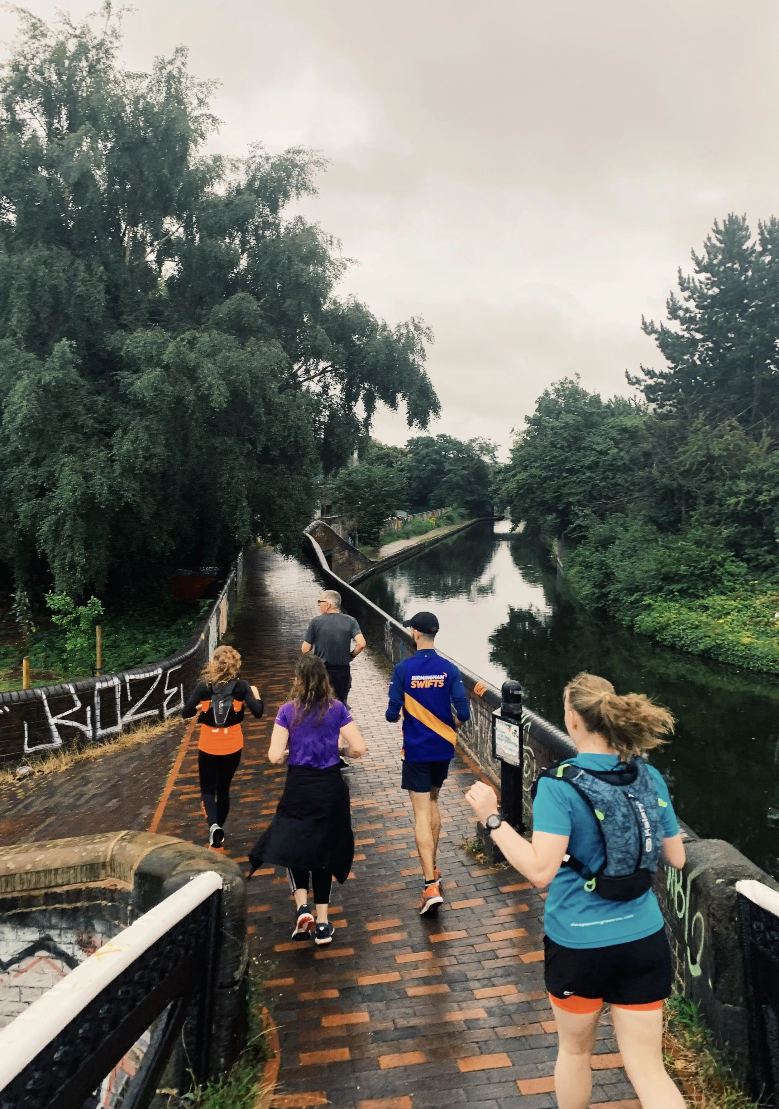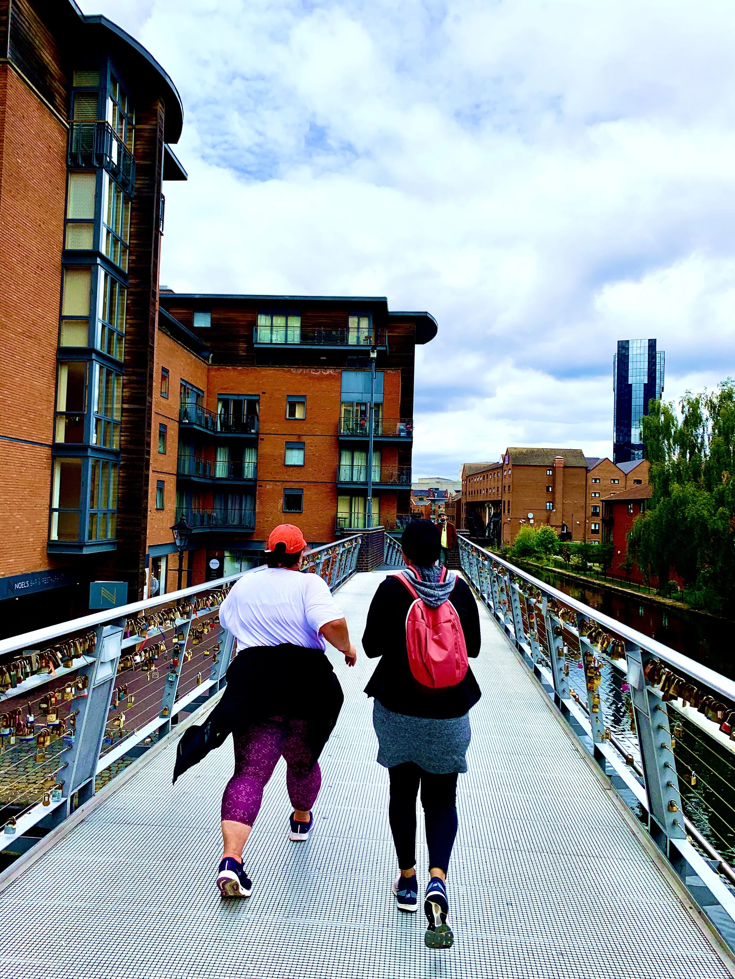 People jogging on a footbridge over a canal, surrounded by brick buildings and a modern skyscraper in the background.