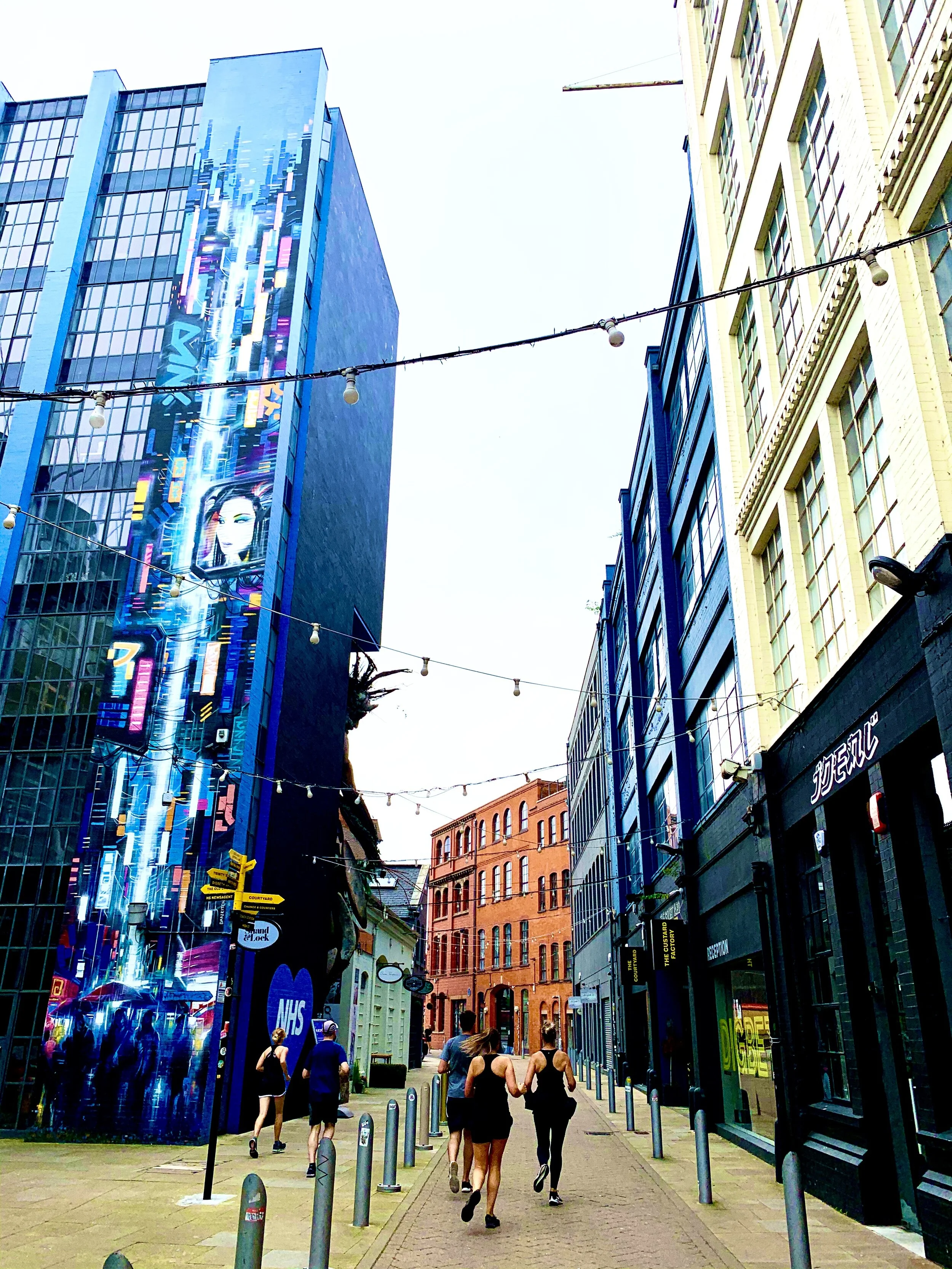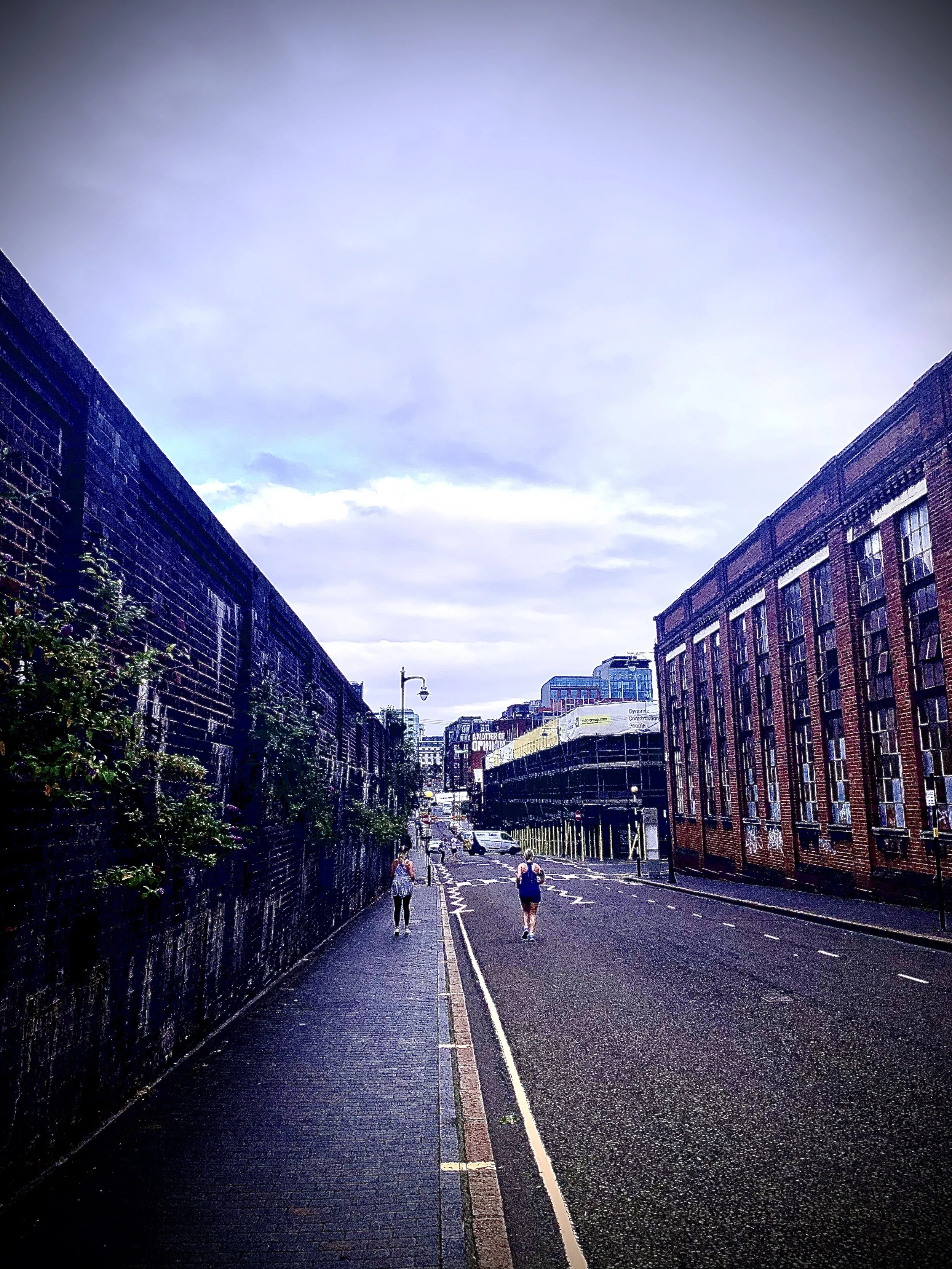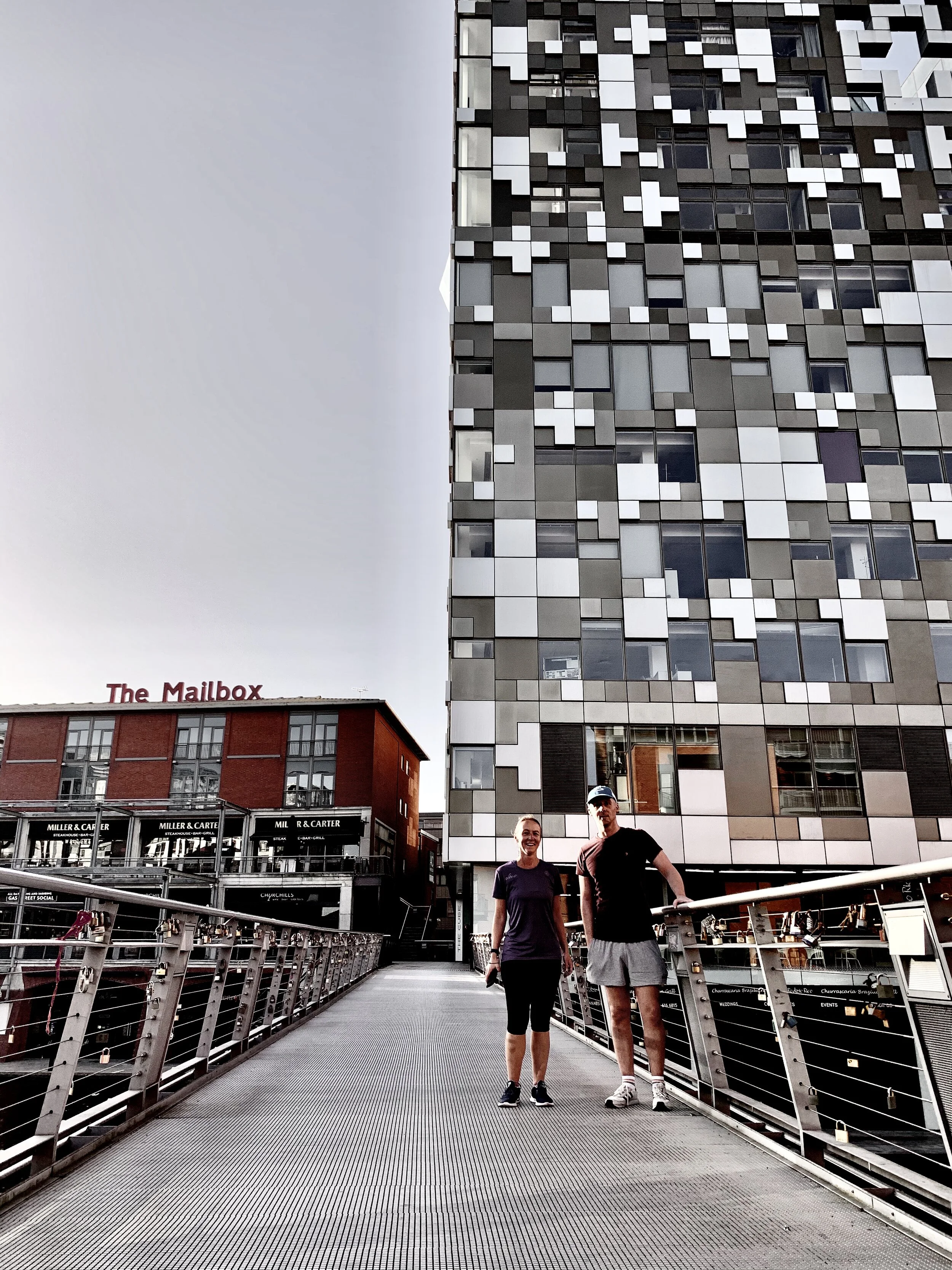 People jogging on a footbridge over a canal, surrounded by brick buildings and a modern skyscraper in the background.