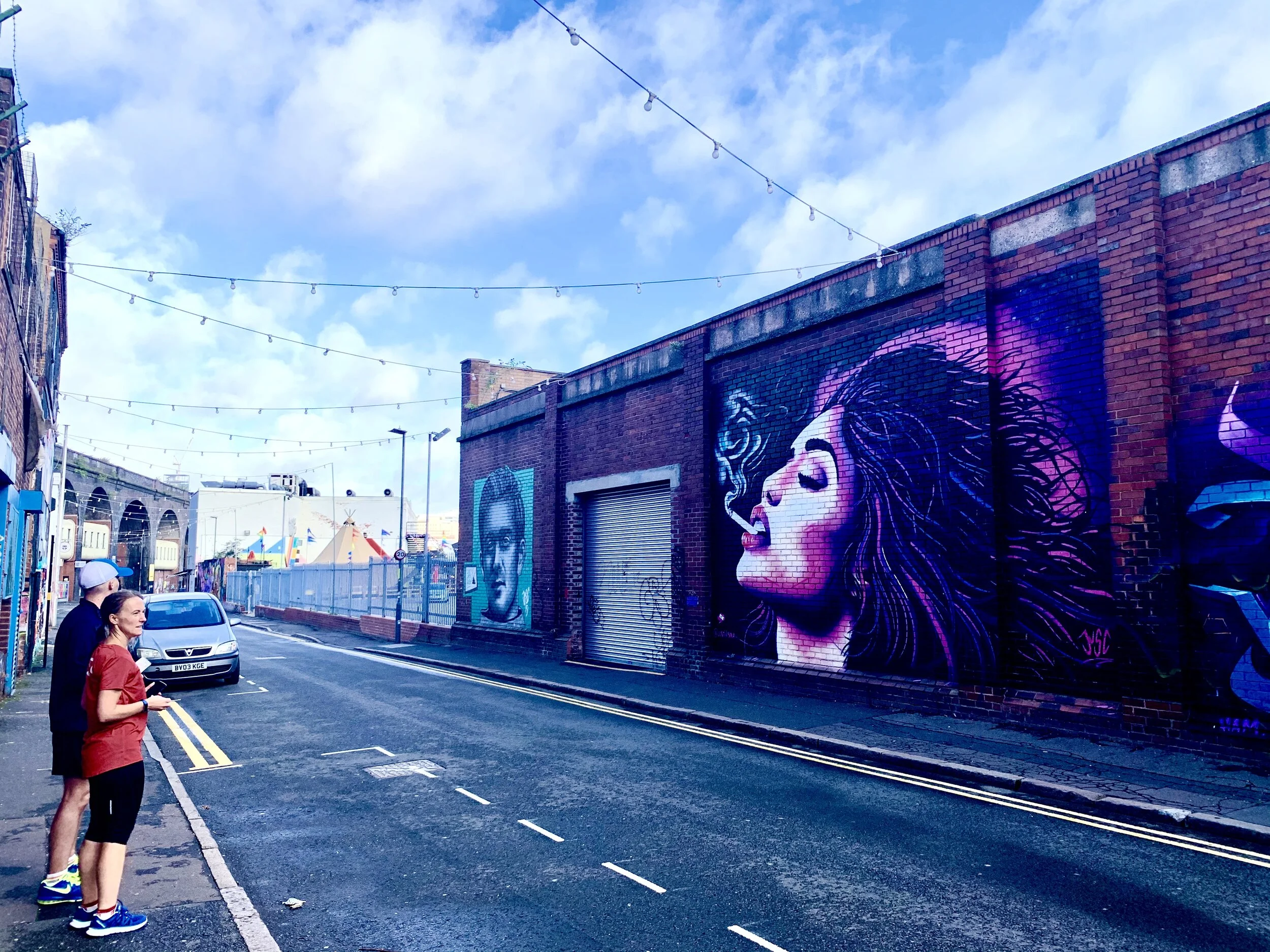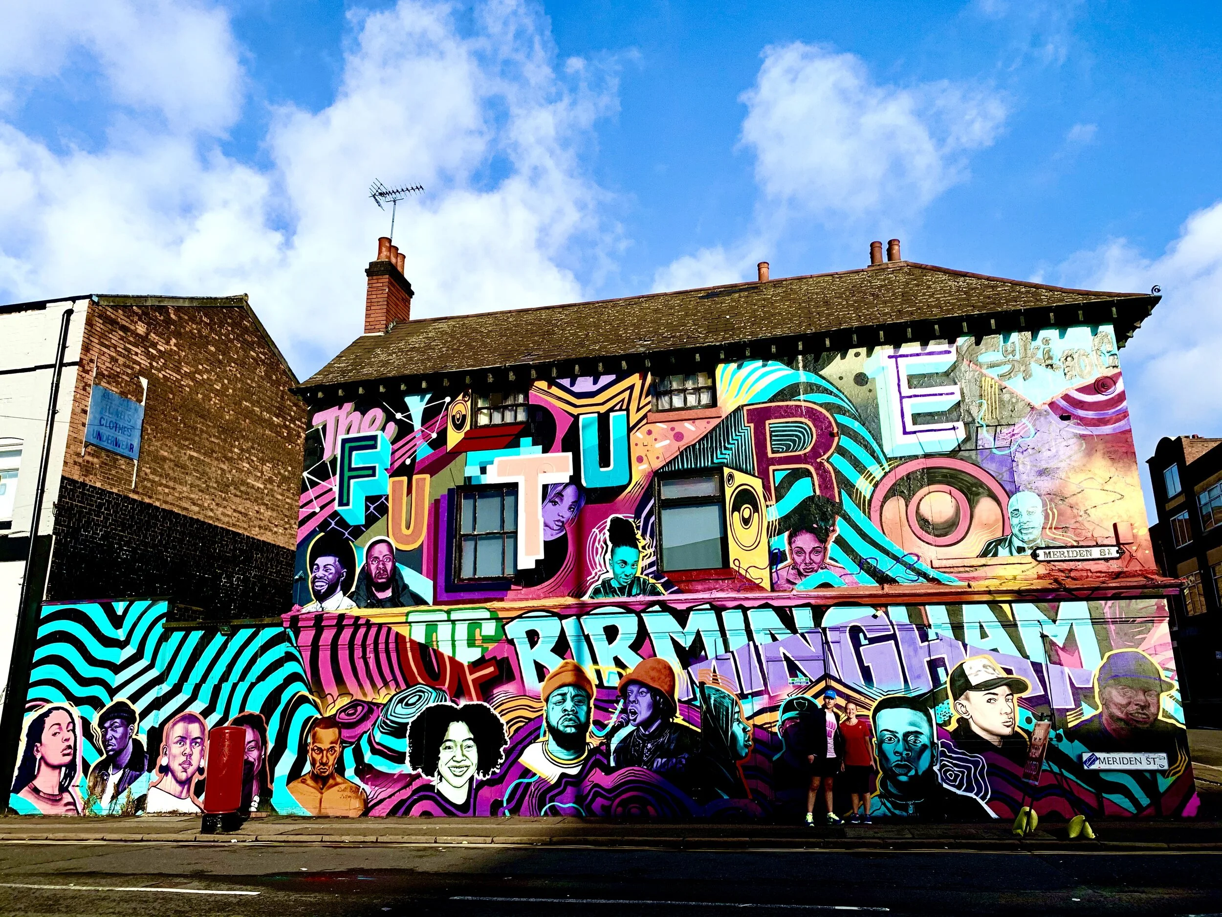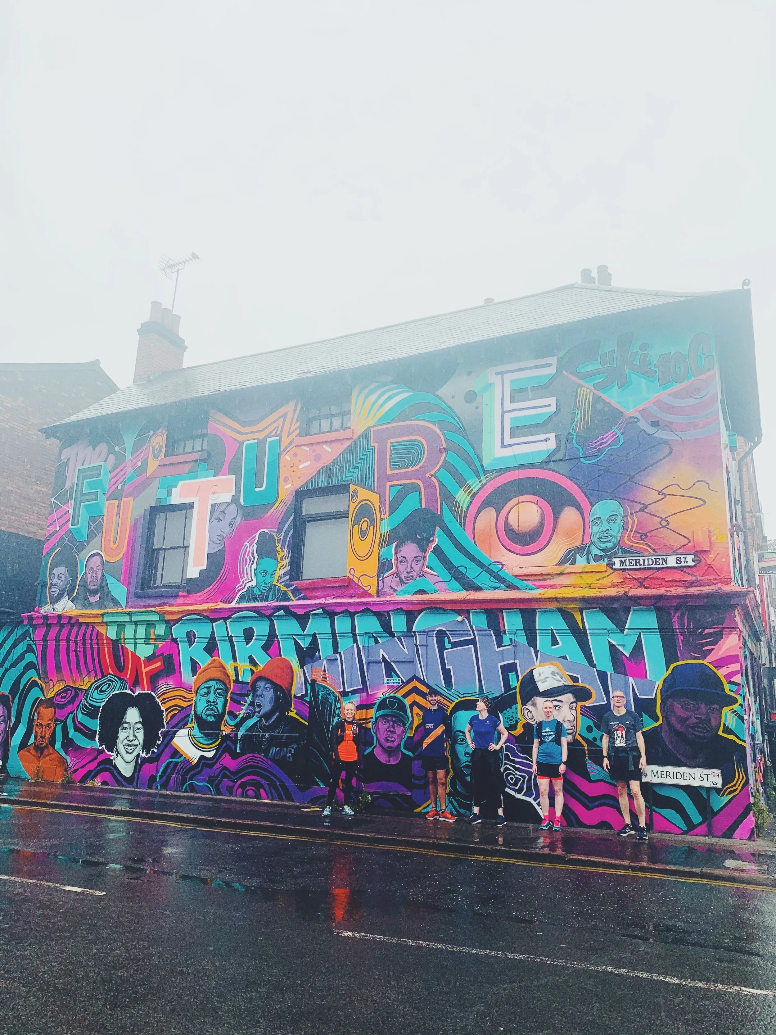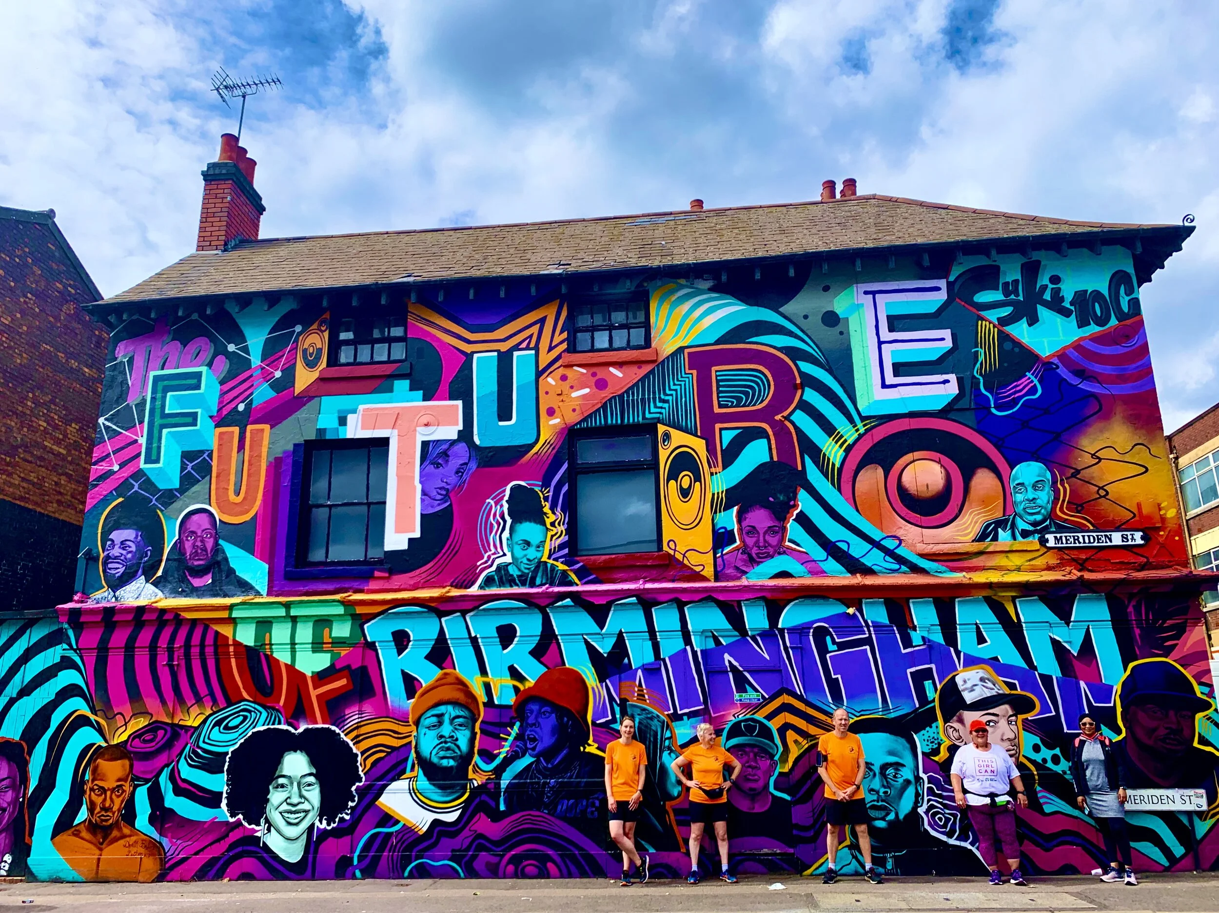 Brightly colored mural on a building wall, featuring portraits of diverse people and the words 'The Future of Birmingham' in graffiti style. Several people stand in front of the mural.