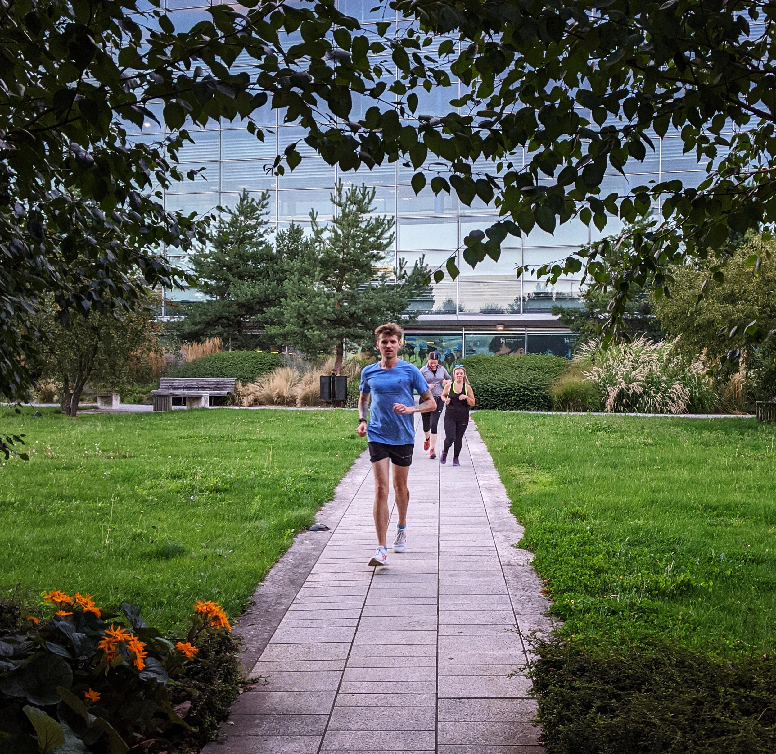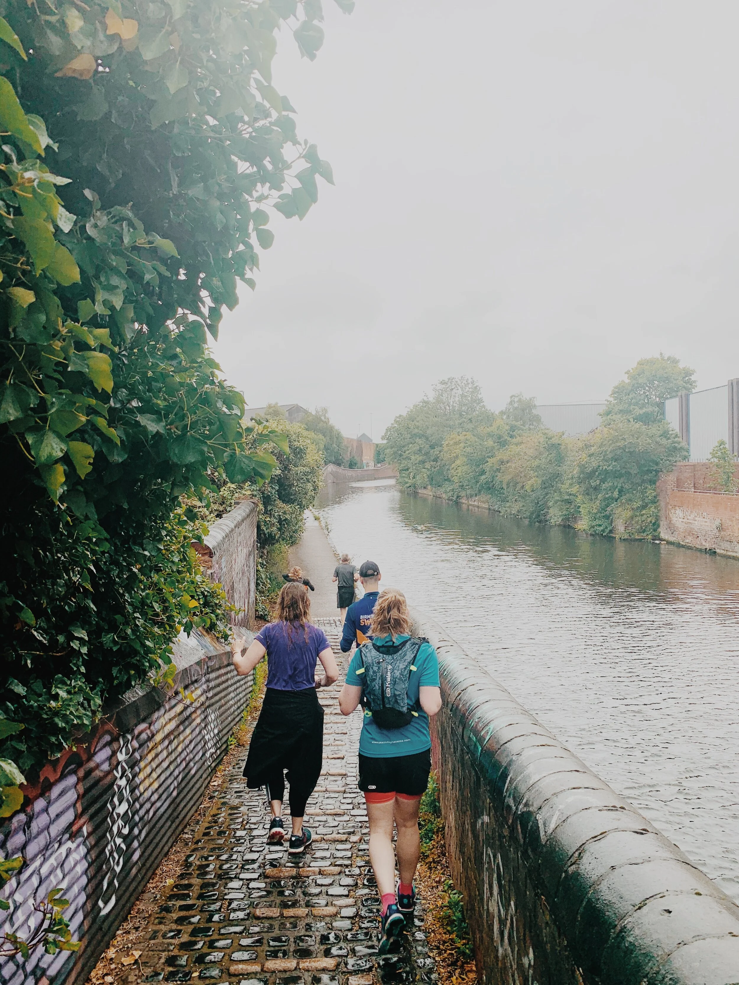 People jogging along a canal path next to a modern glass building, with a brick wall on the right side.
