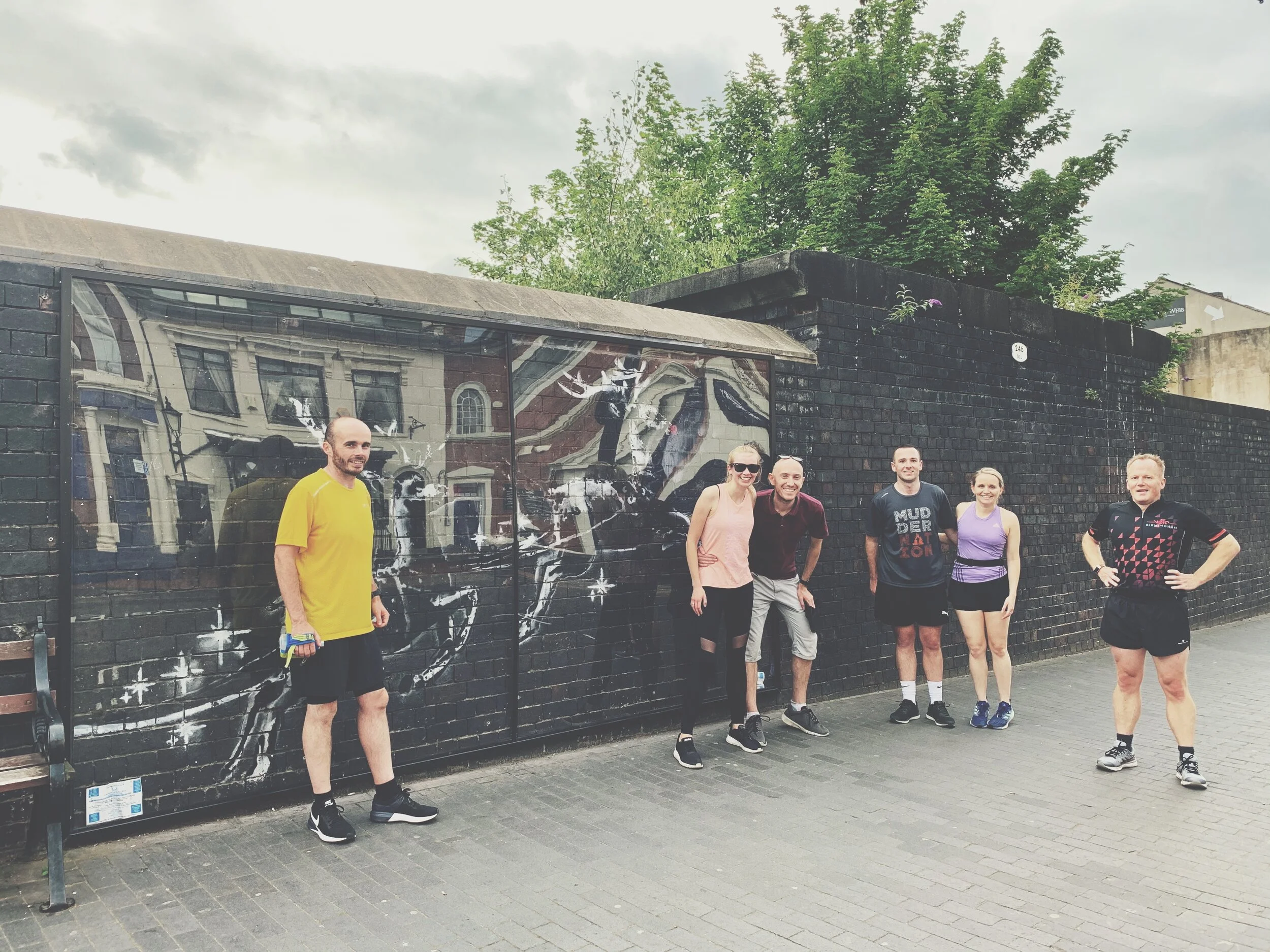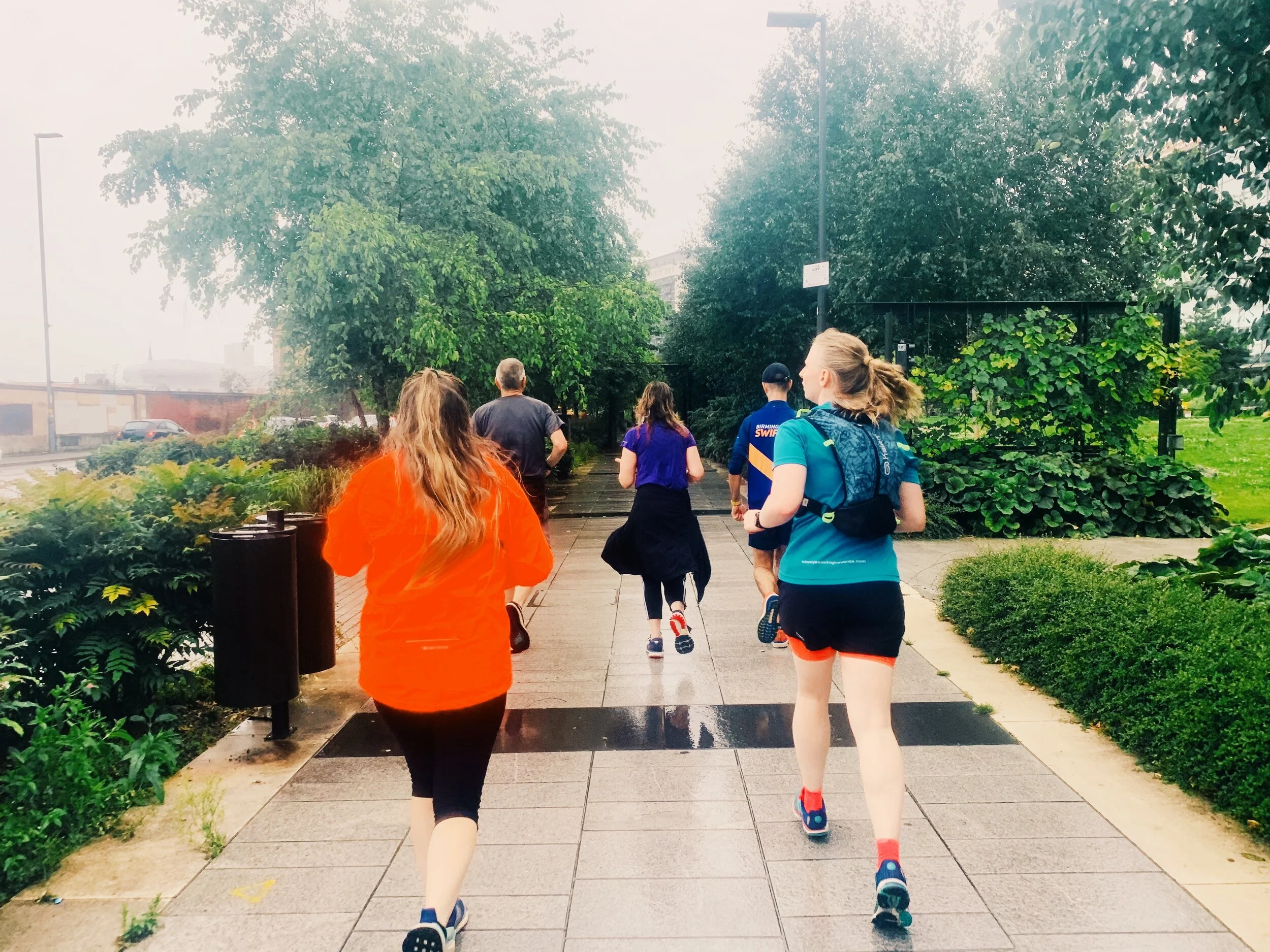 Group of runners on a brick pathway with buildings in the background, surrounded by grass and graffiti-covered barriers.