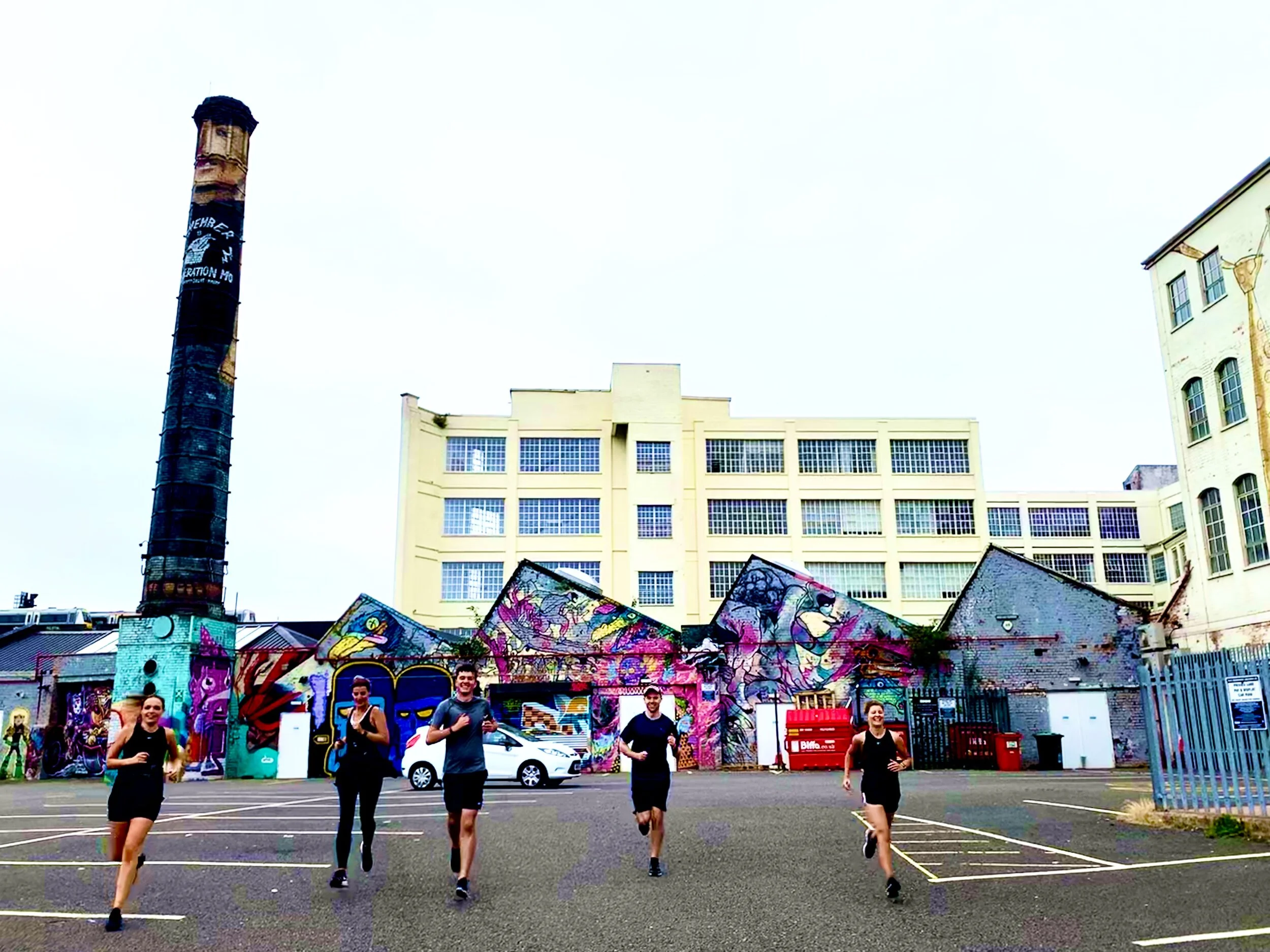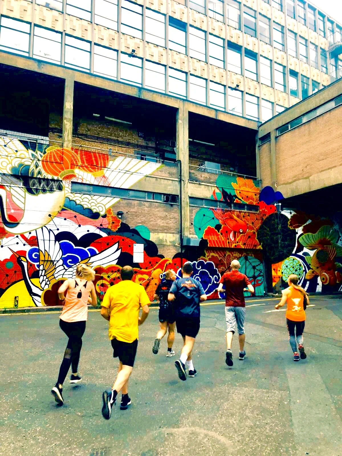 A person in an orange shirt and black leggings running on a graffiti-covered walkway beside the Custard Factory sign. The background features urban street art on brick walls.