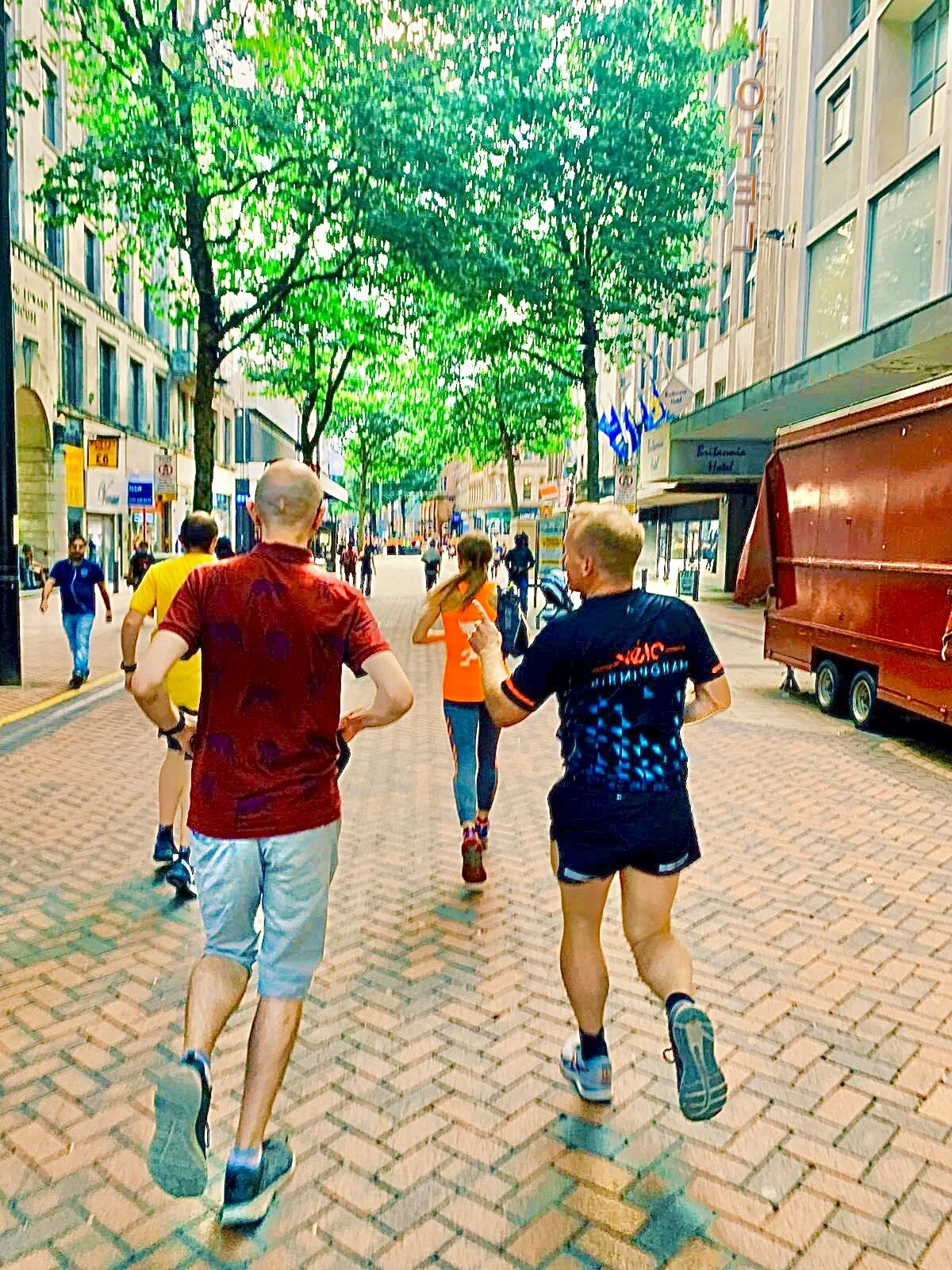 People jogging on a tree-lined pedestrian street in a city, with shops and buildings visible on both sides.