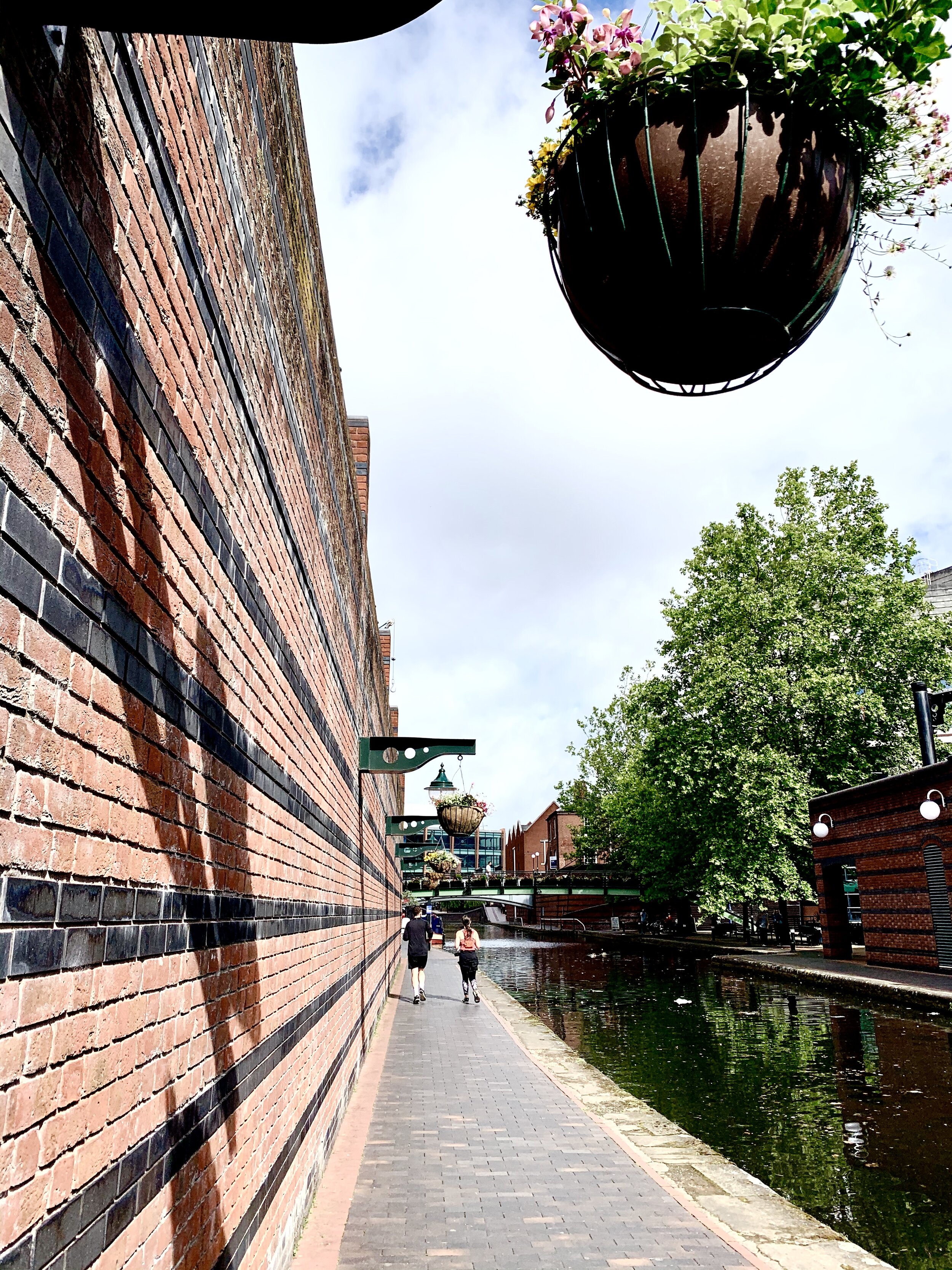 Brick pathway alongside a canal with two people walking, lined with tall brick buildings and lush greenery. Hanging flower basket in the foreground and a clear sky above.