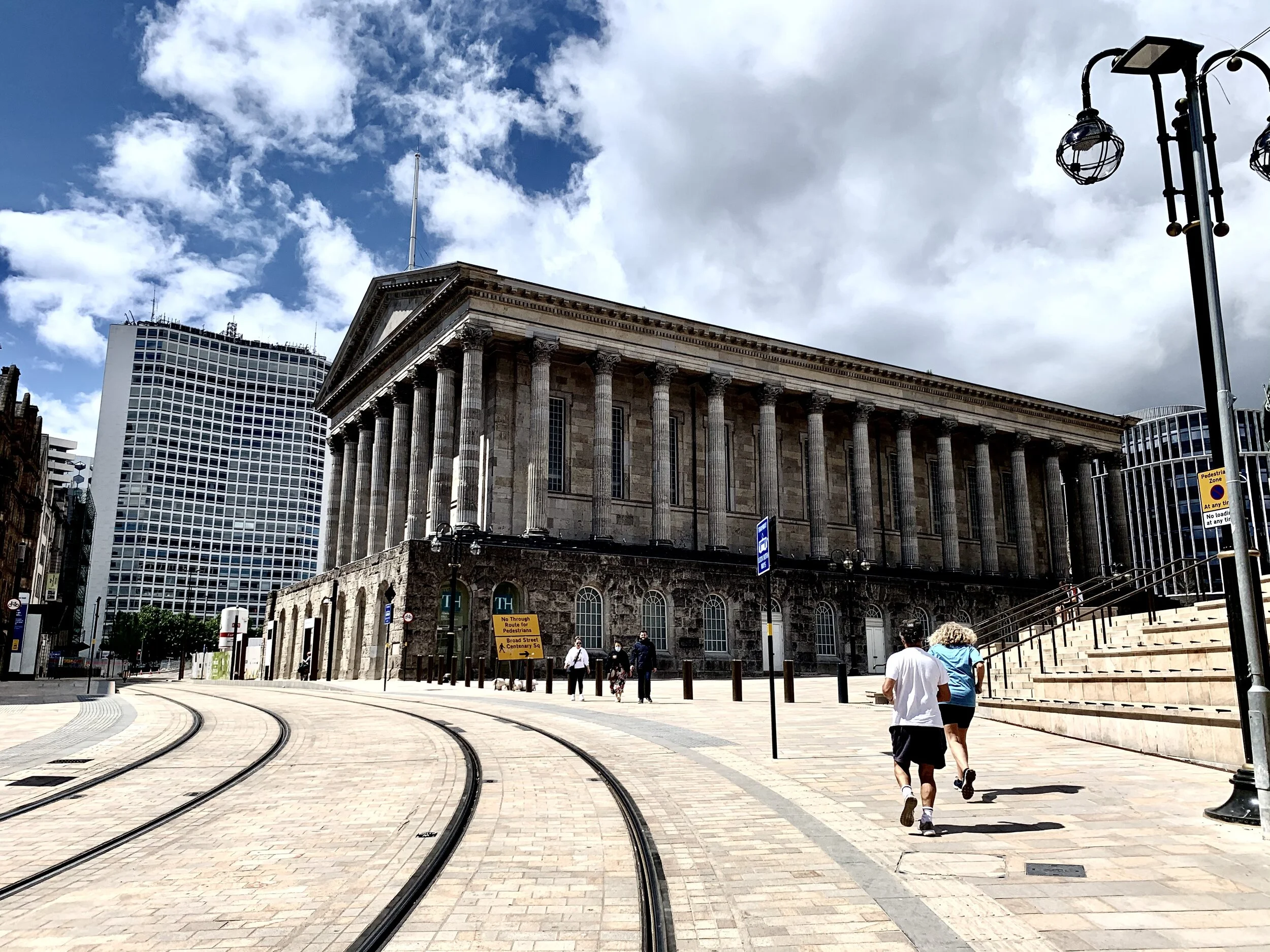People walking near Birmingham Town Hall, a historic building with columns, modern buildings in the background, and tram tracks in the foreground.