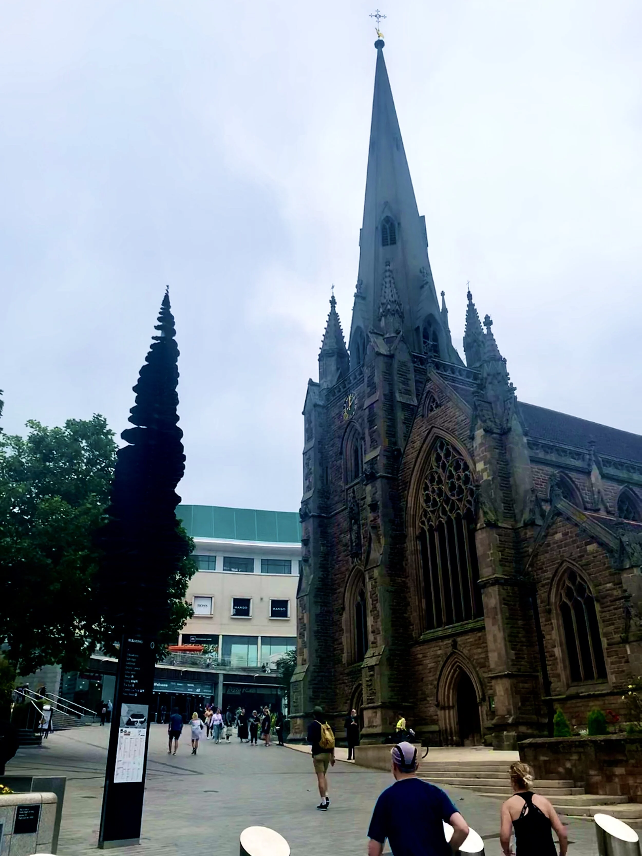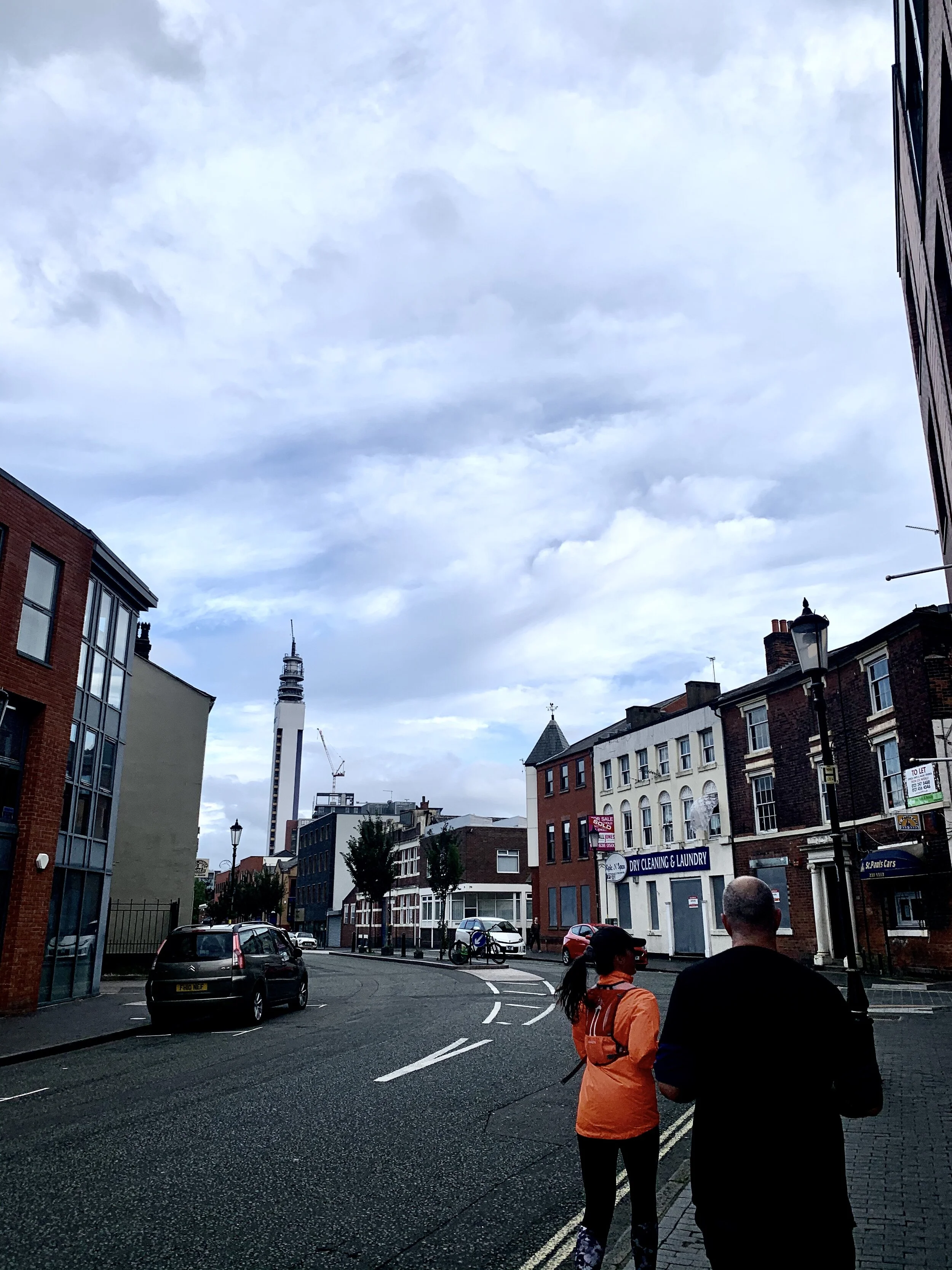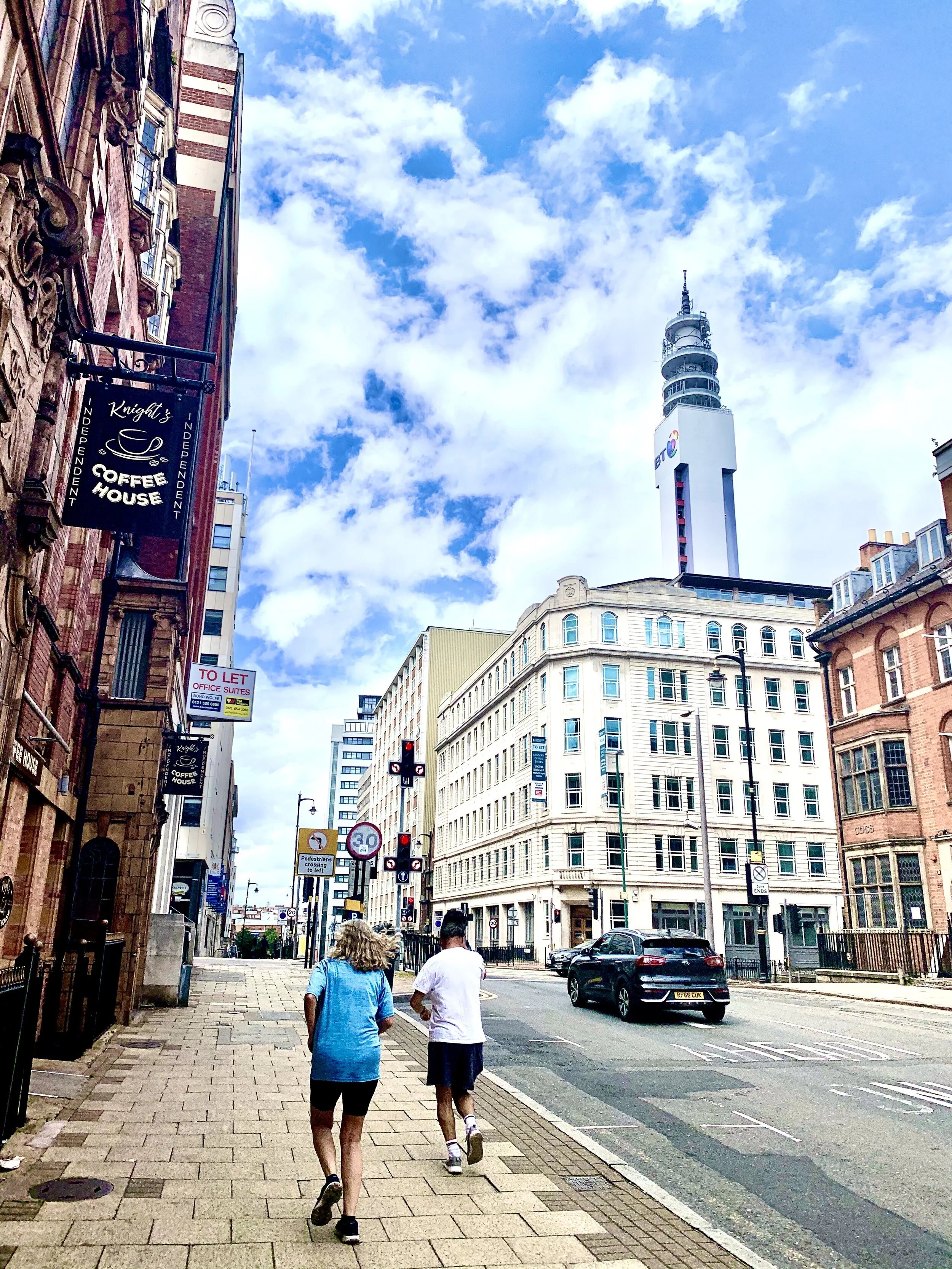 Two people walking near a road with The Mailbox building and Atkins building in the background.