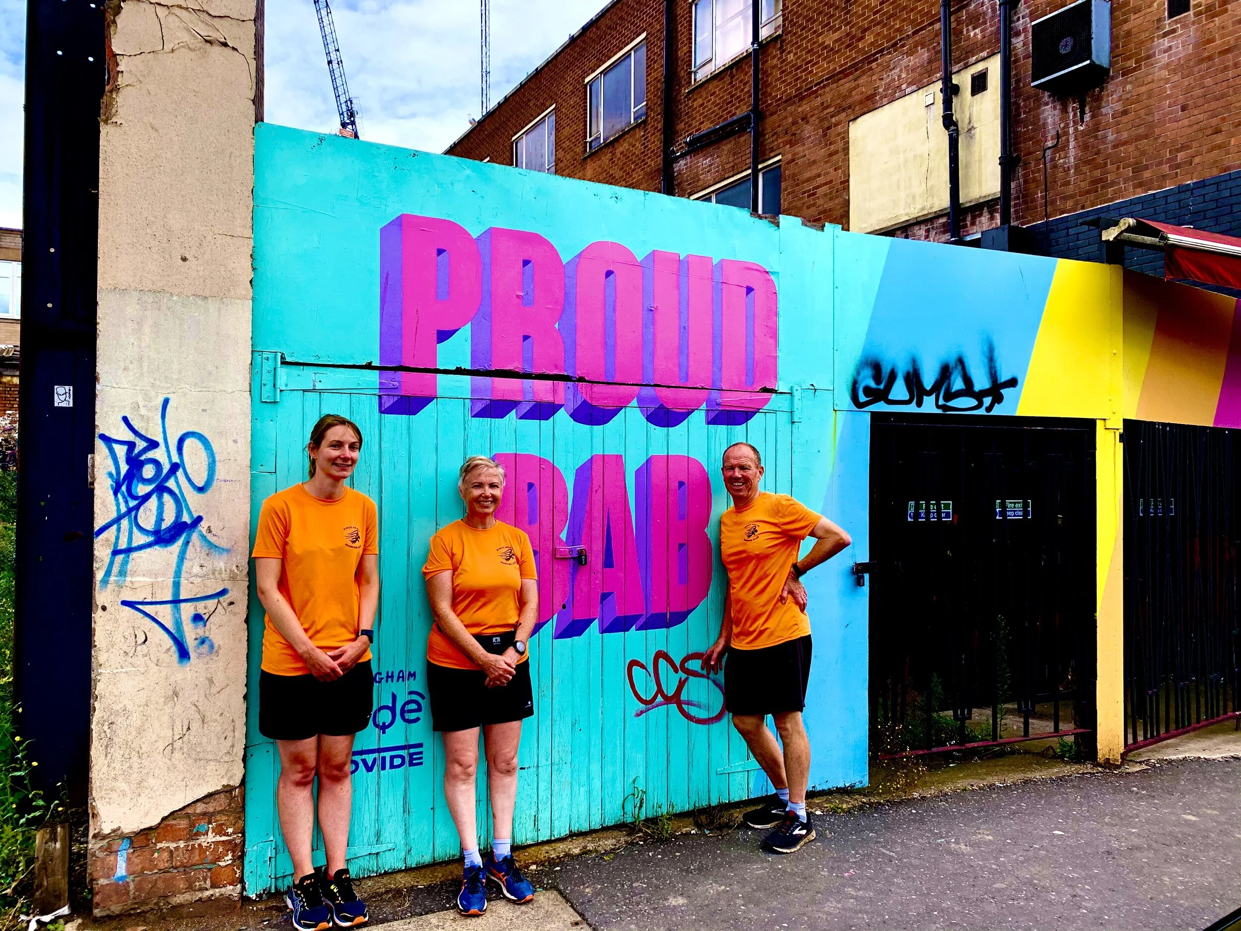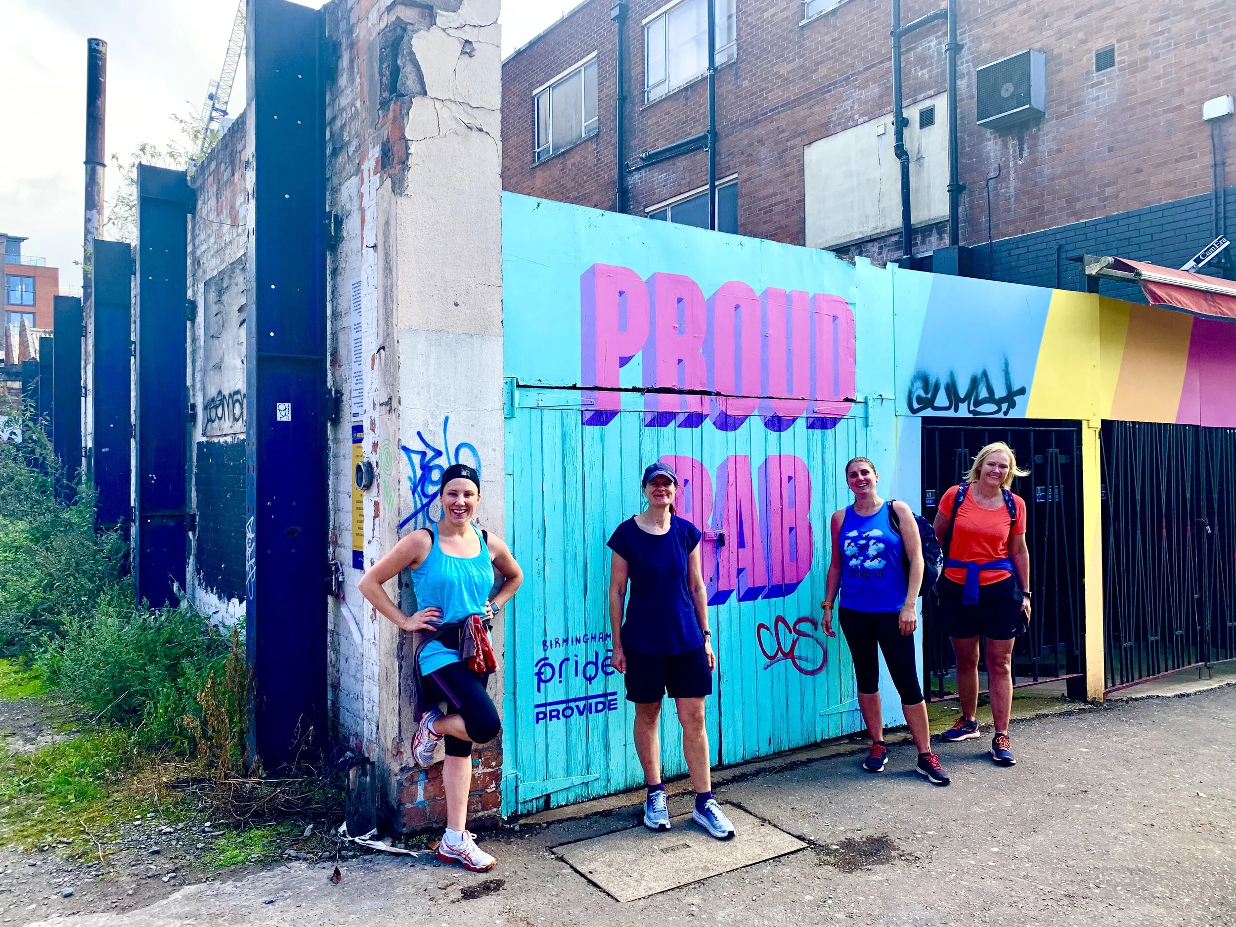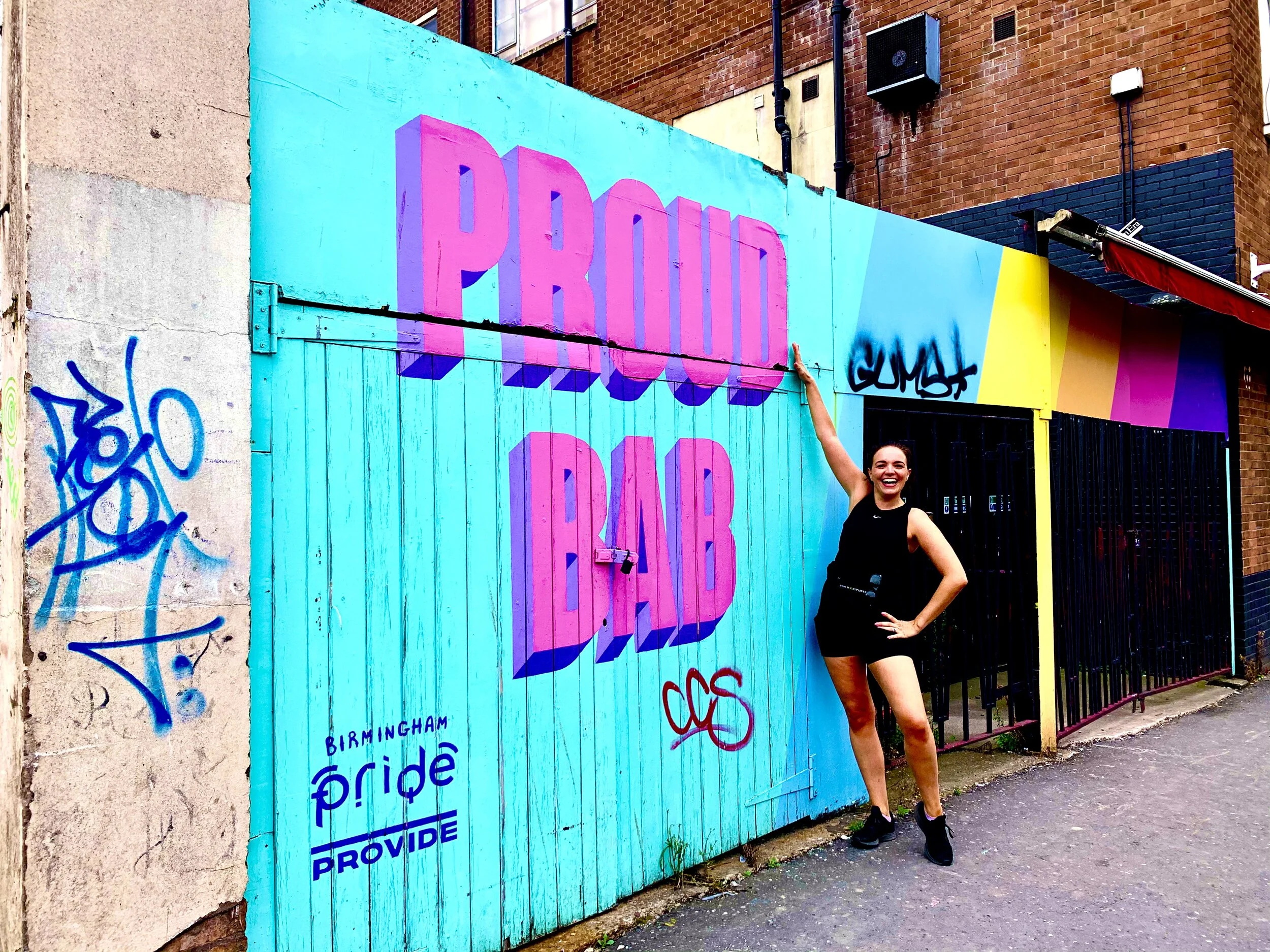Mural with bold pink text "PROUD BAB" on a teal background, "Birmingham Pride" written in smaller text below.