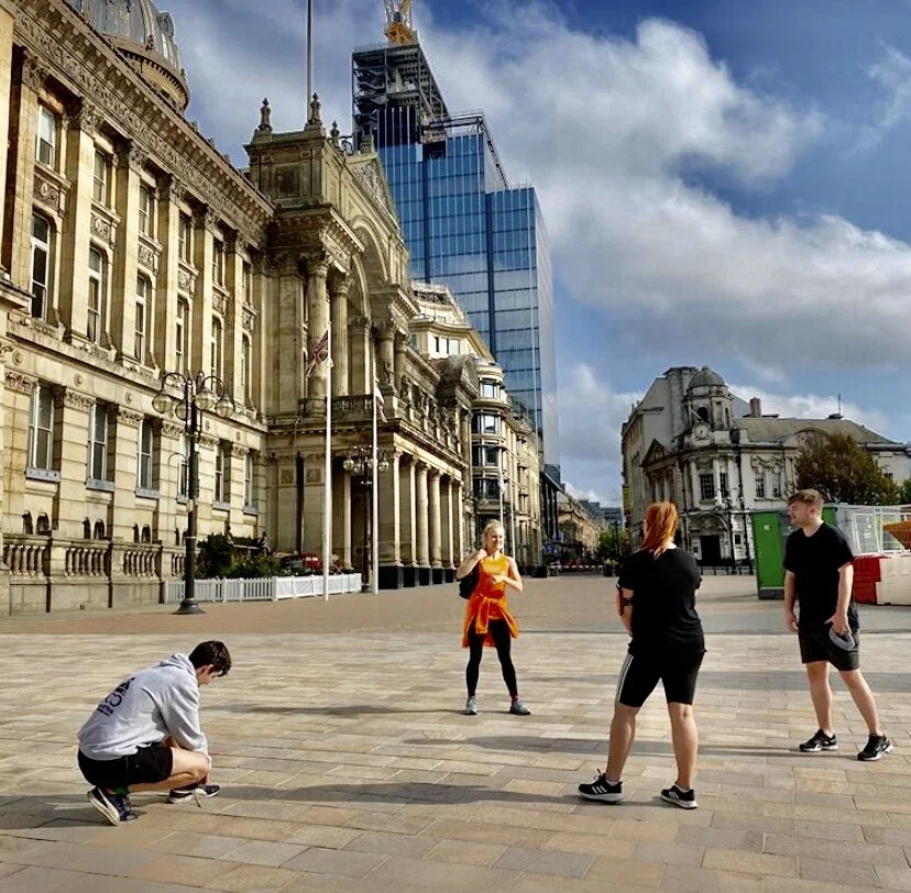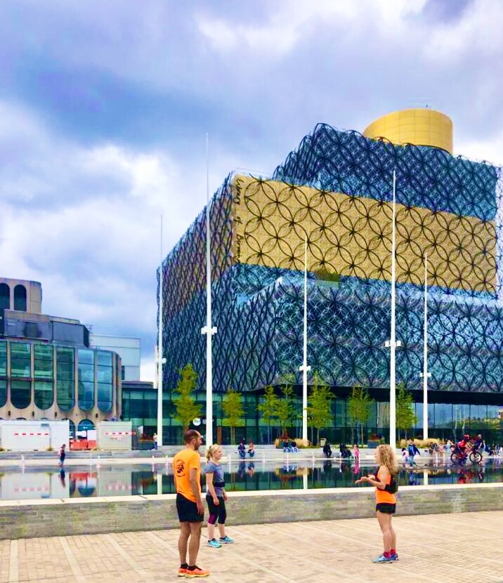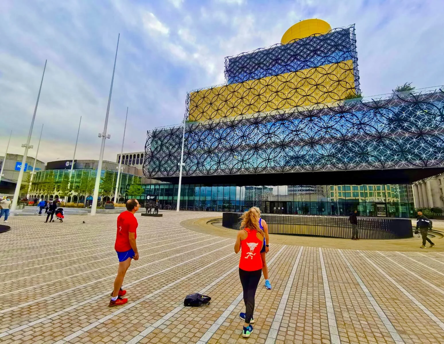 People posing in front of the Library of Birmingham, UK, with geometric outdoor art structure.