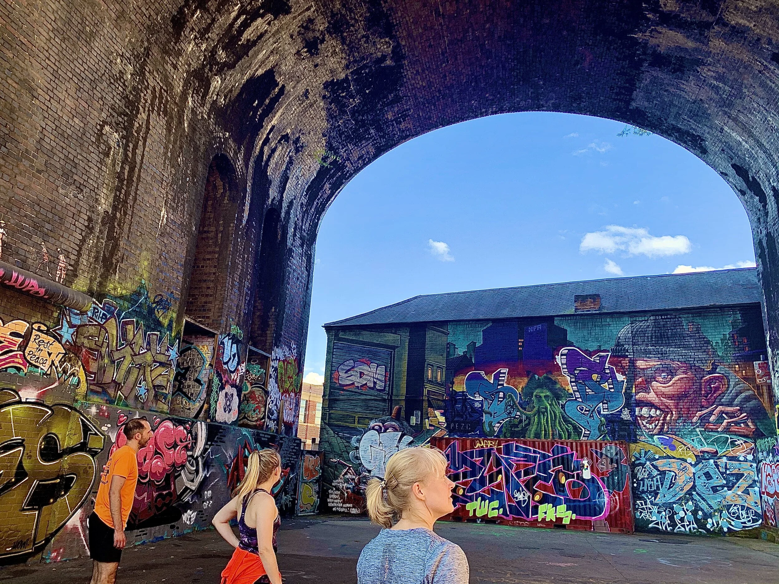 Four people standing on a street near a colorful graffiti mural and a brick archway on a sunny day.
