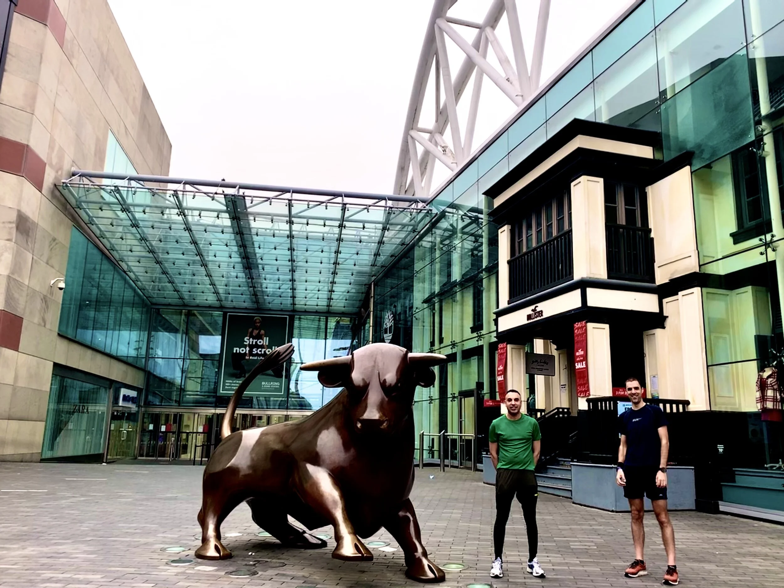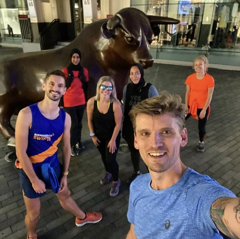 Group of runners posing near a bull statue in a modern outdoor plaza with glass architecture.