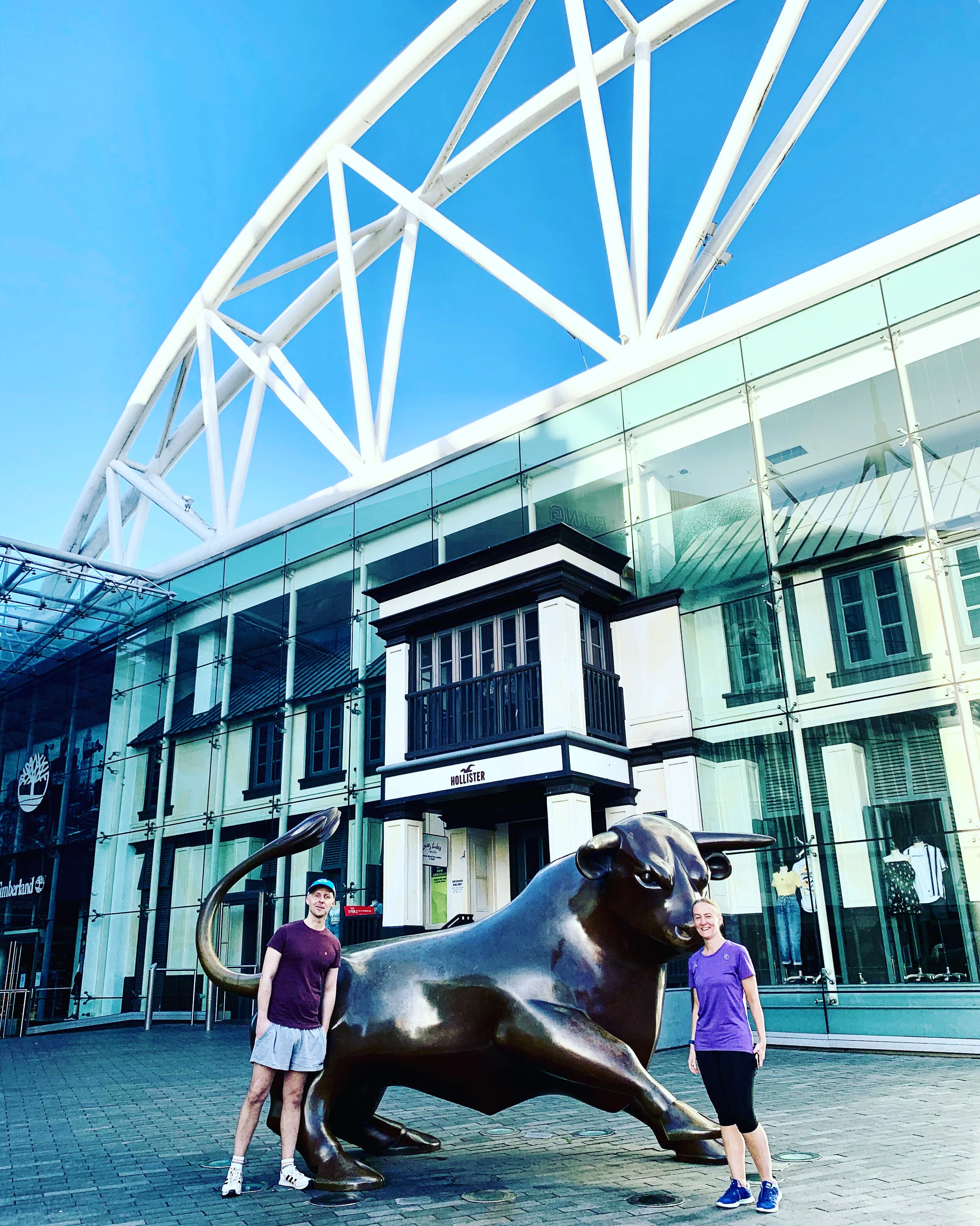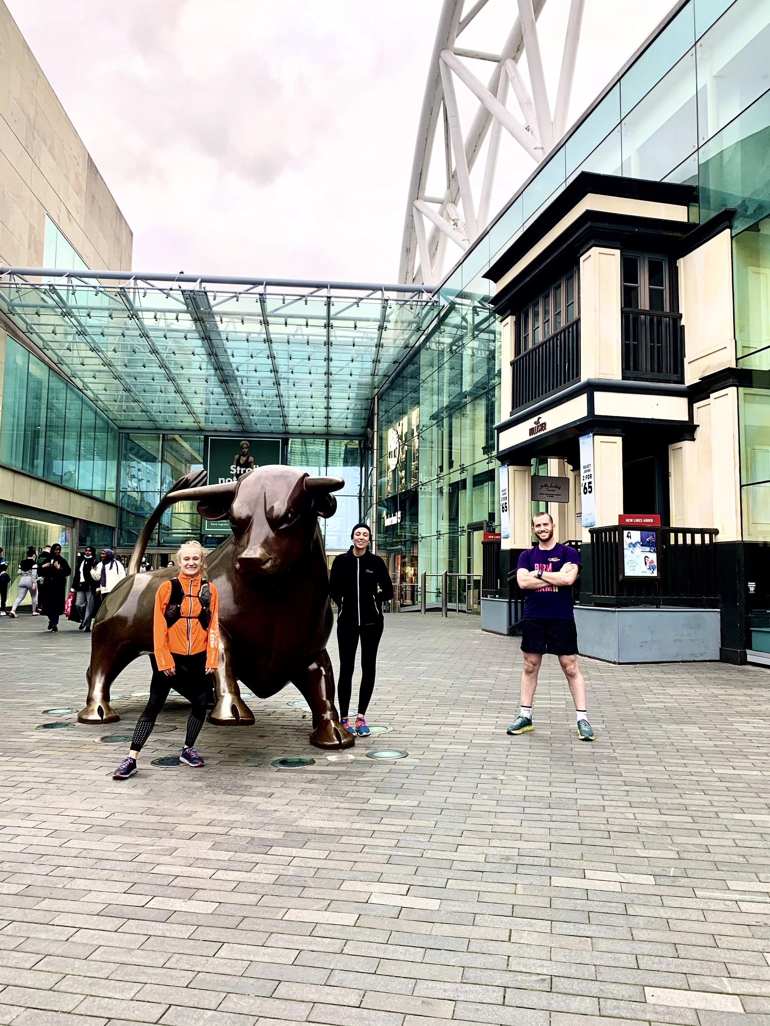 A group of five people posing in front of a decorated bull statue at Bullring & Grand Central in Birmingham. The bull is wearing red glasses and a blue jacket. The area is an outdoor shopping center.
