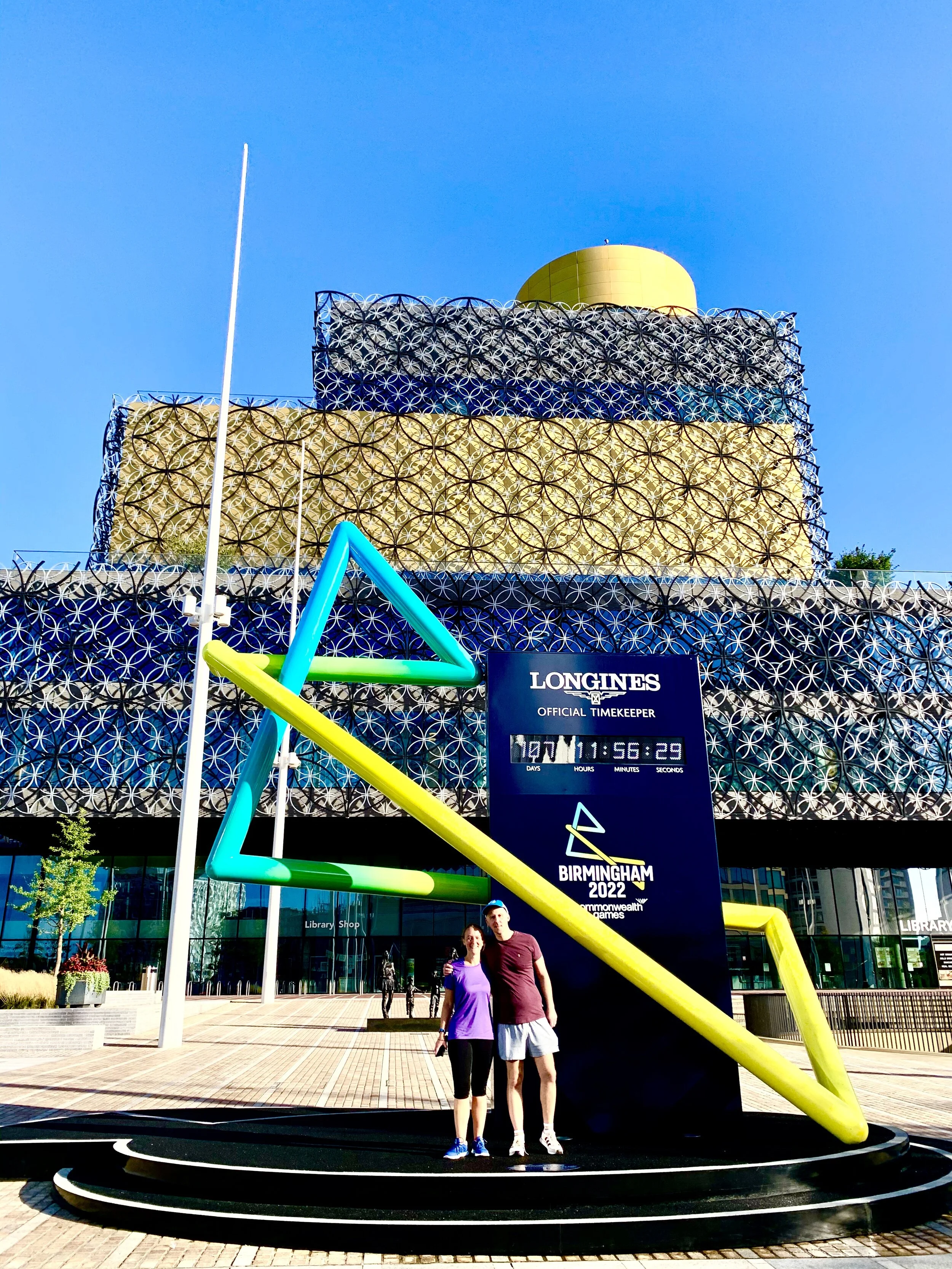 Two people talking in an outdoor urban plaza with modern buildings and a large countdown clock display featuring the Birmingham 2022 Commonwealth Games logo.