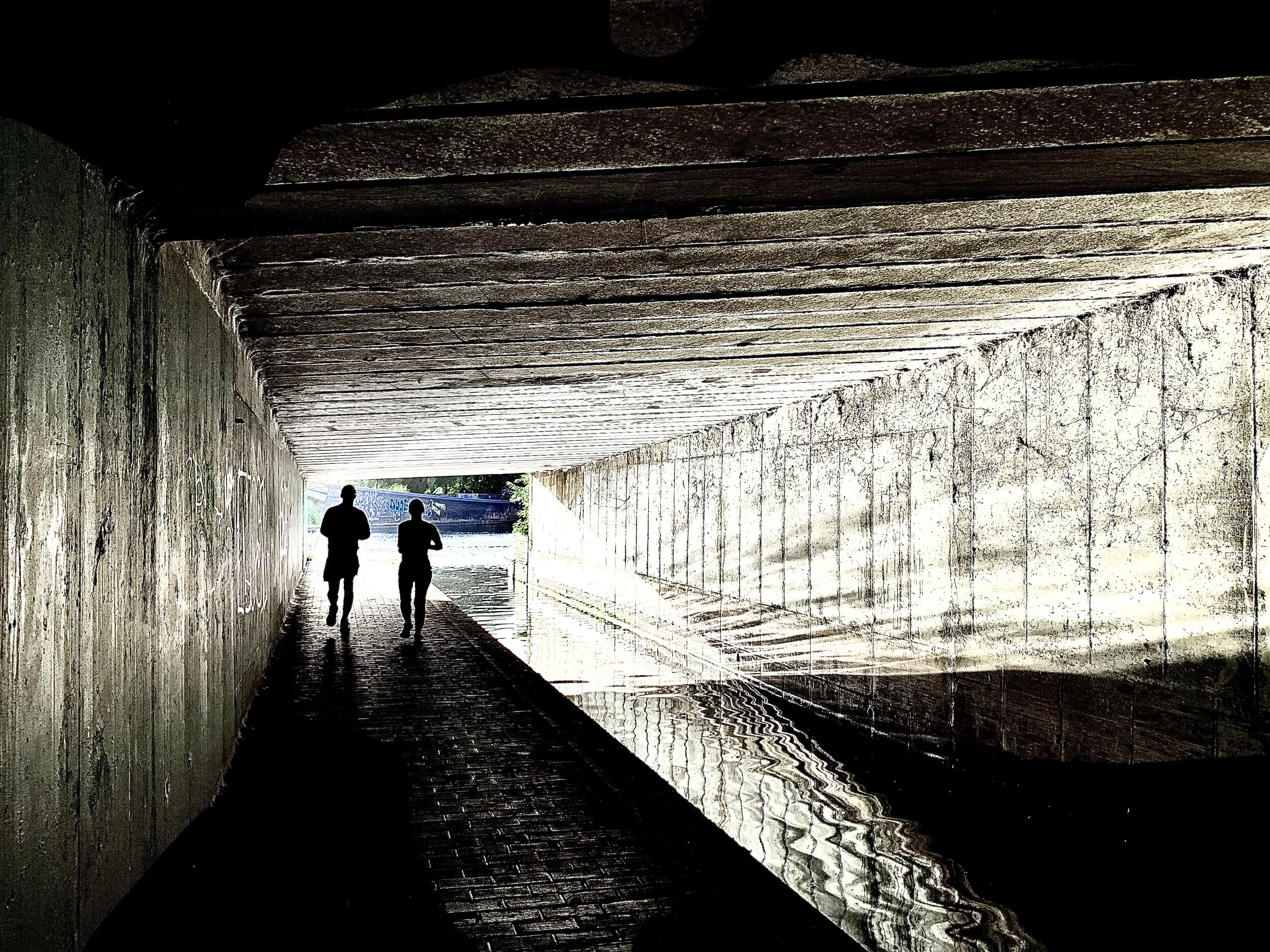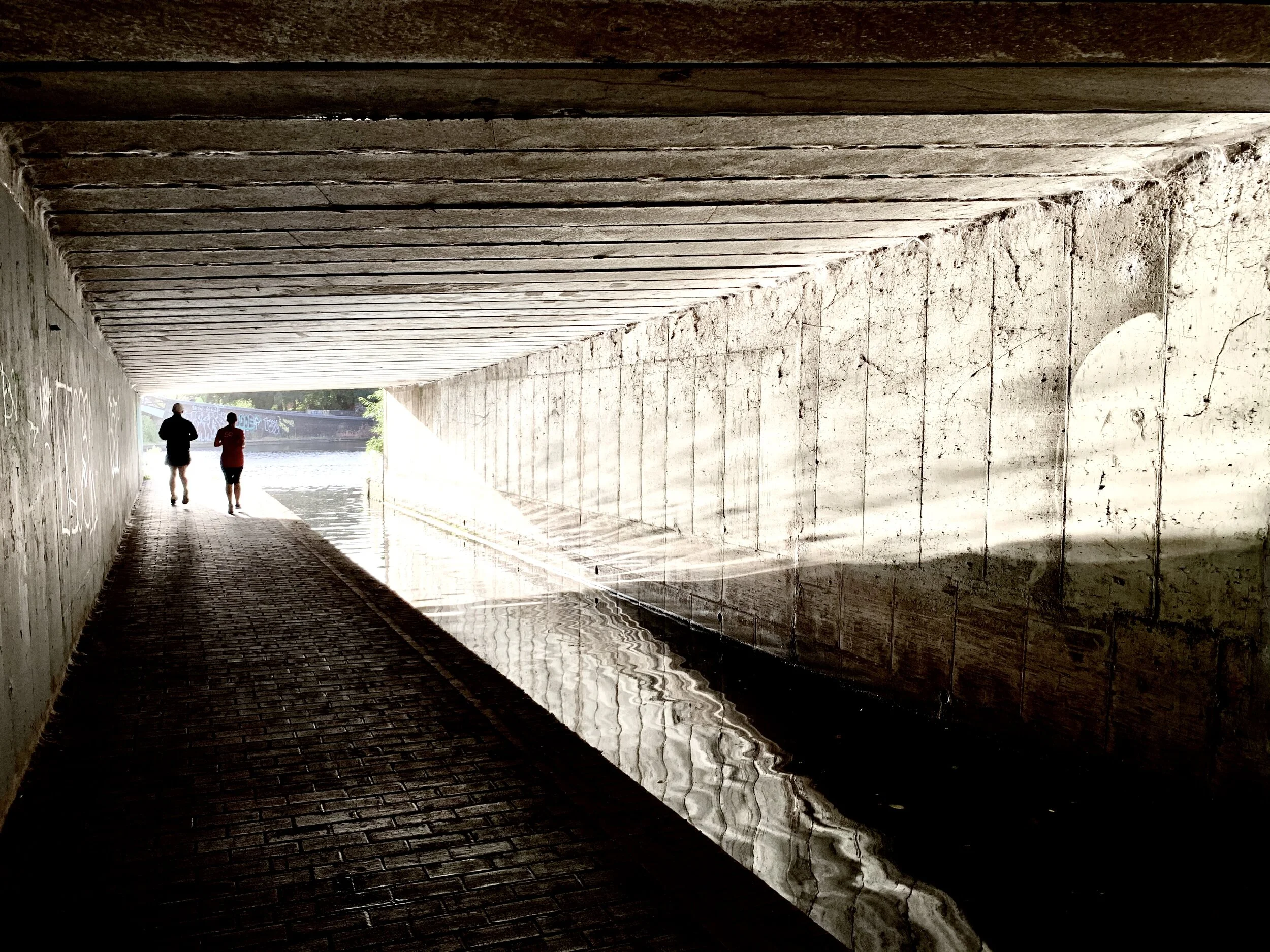 People walking under a brick railway bridge beside a canal in an urban area, with graffiti on the walls and buildings in the background on a sunny day.
