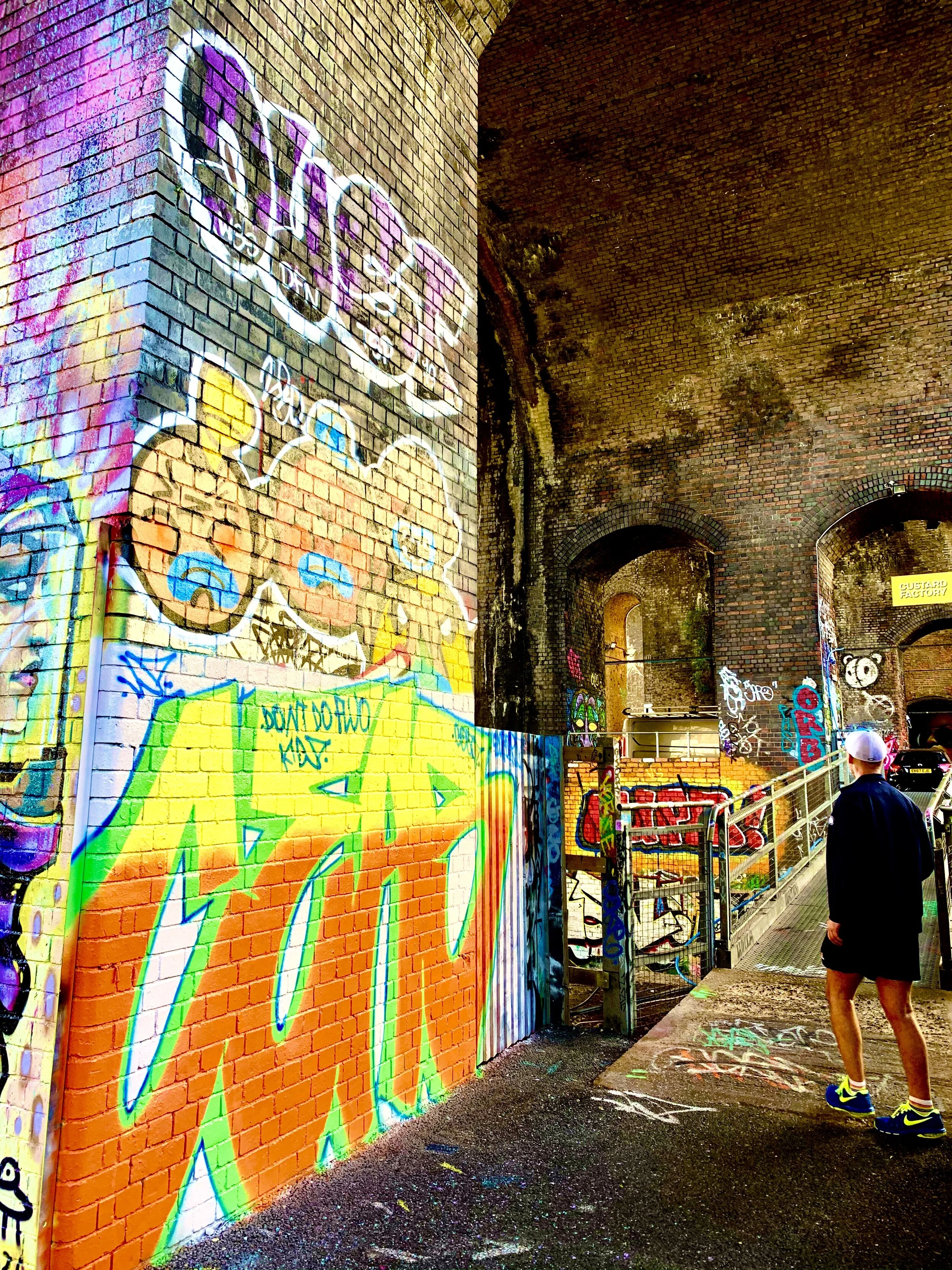 Person walking along a graffiti-covered canal pathway with red brick buildings, a modern white building, and cranes in the background.
