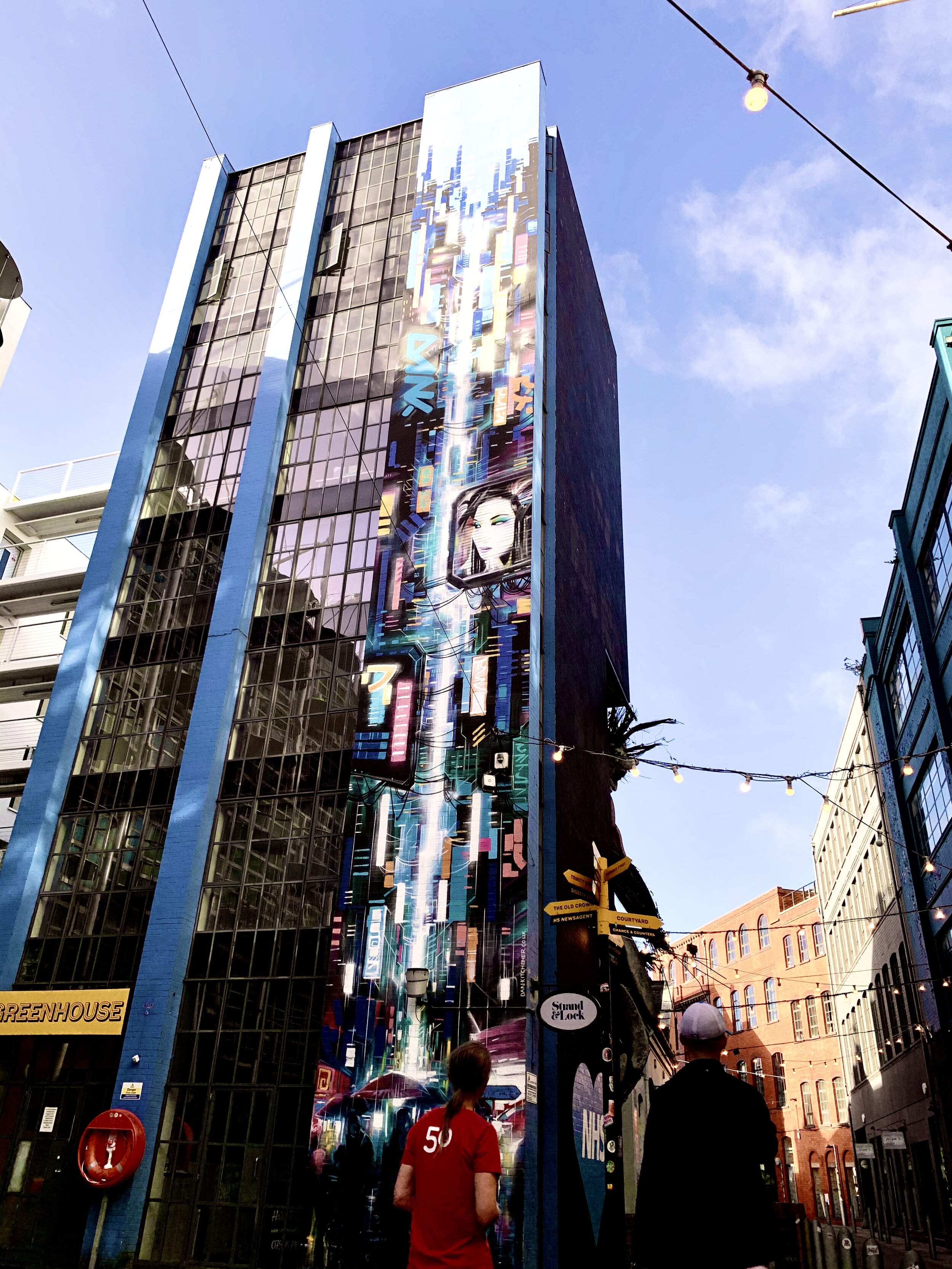 Two people viewing a colorful street mural featuring a purple monster, various characters, and vibrant designs on an outdoor wall, with string lights above and a cloudy sky in the background.