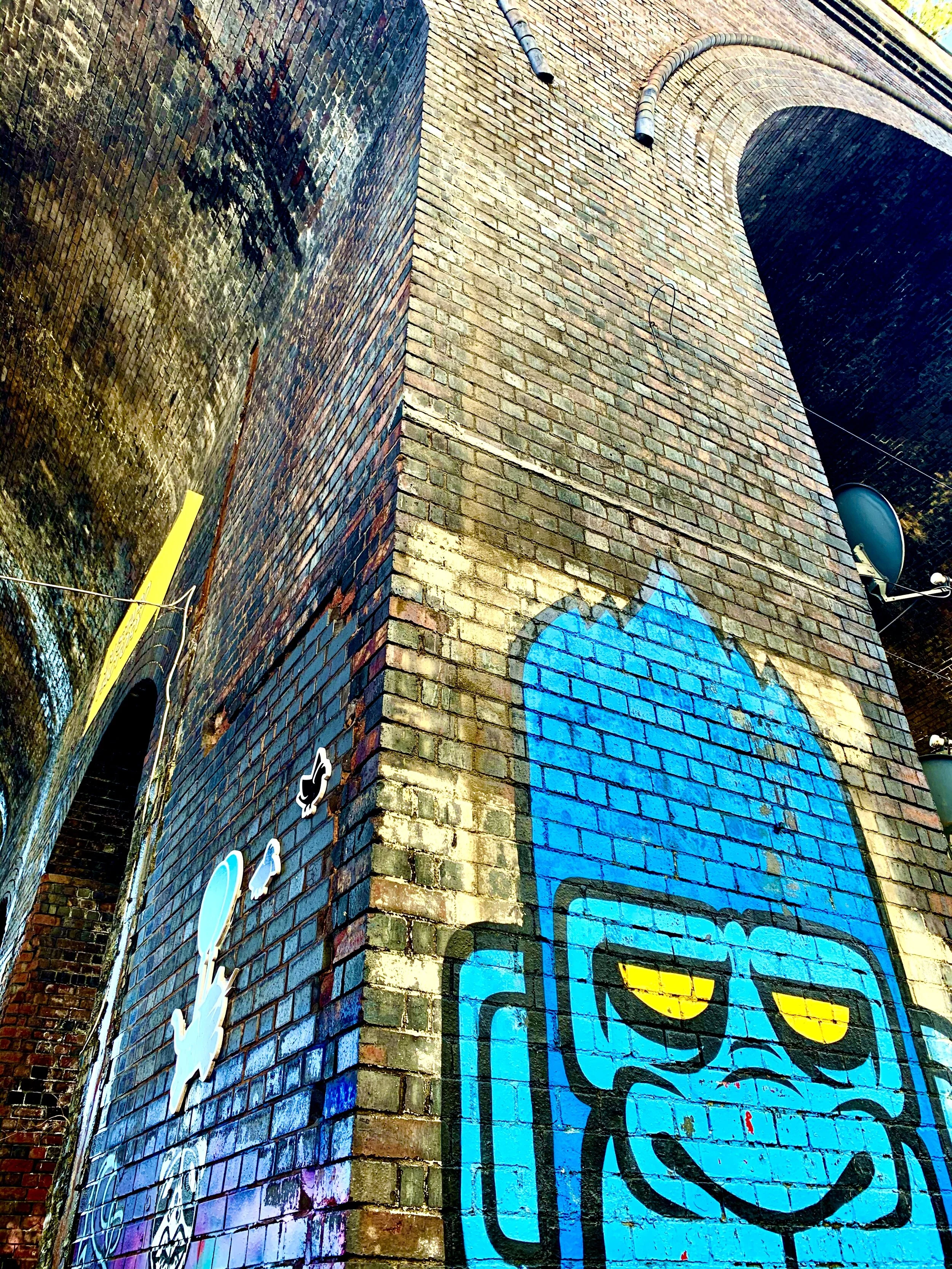 Brick walls covered with colorful graffiti, including abstract designs and cartoon-style artwork, in an urban setting.
