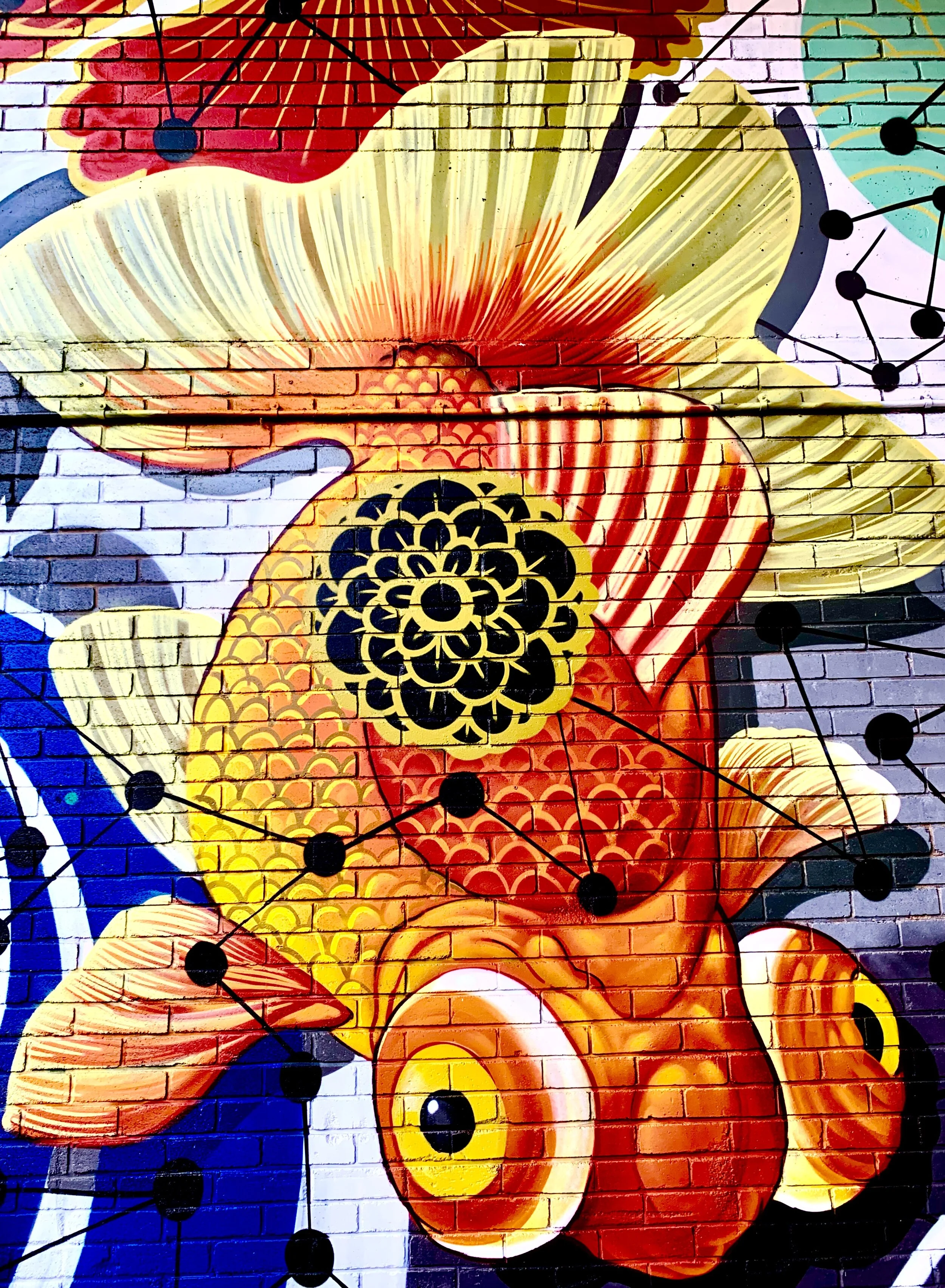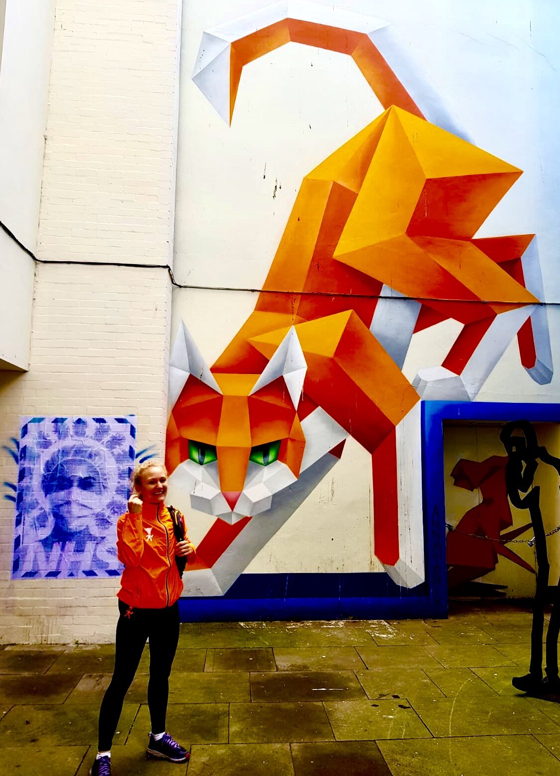A person in orange and black athletic attire stands in front of a colorful street art mural. The mural features a geometric, orange cat with green eyes on a white wall.