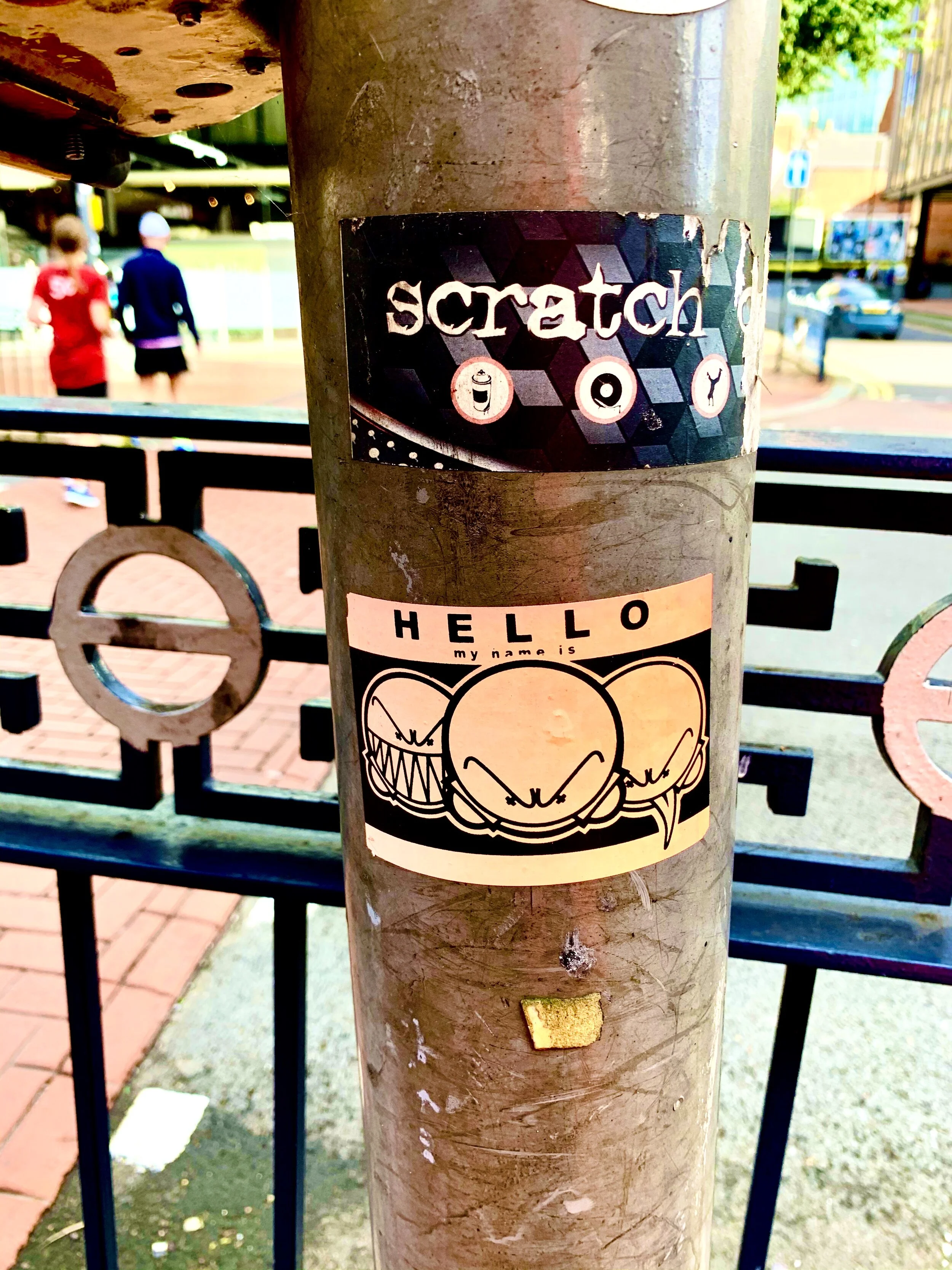Two people conversing near a modern building in an urban setting. One person is wearing a black T-shirt with the text "2020 Stephen King." The other is in an orange jacket. The building has prominent glass windows and is labeled "Harvey Nichols."