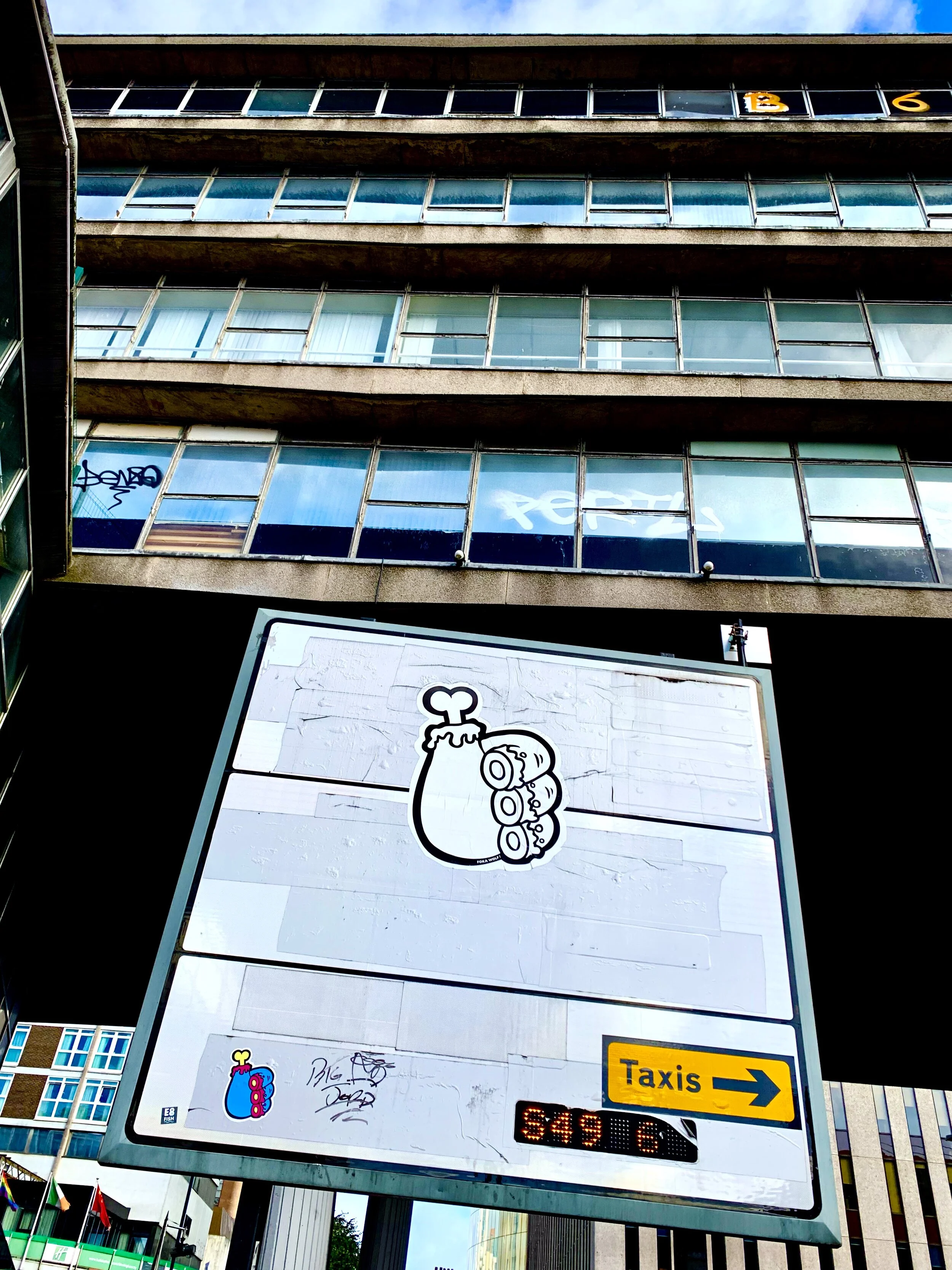 Two people stand next to a bright turquoise wall with "Proud Bab" painted in large pink letters. The wall is part of an urban street scene with visible graffiti, against a backdrop of brick buildings and construction cranes in the background.