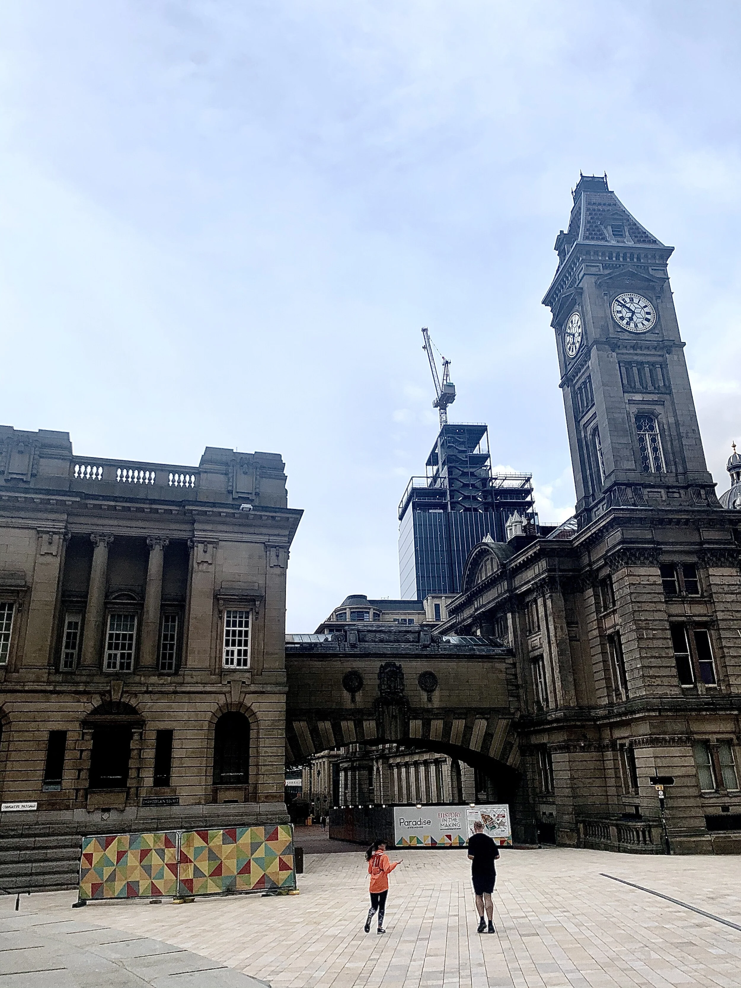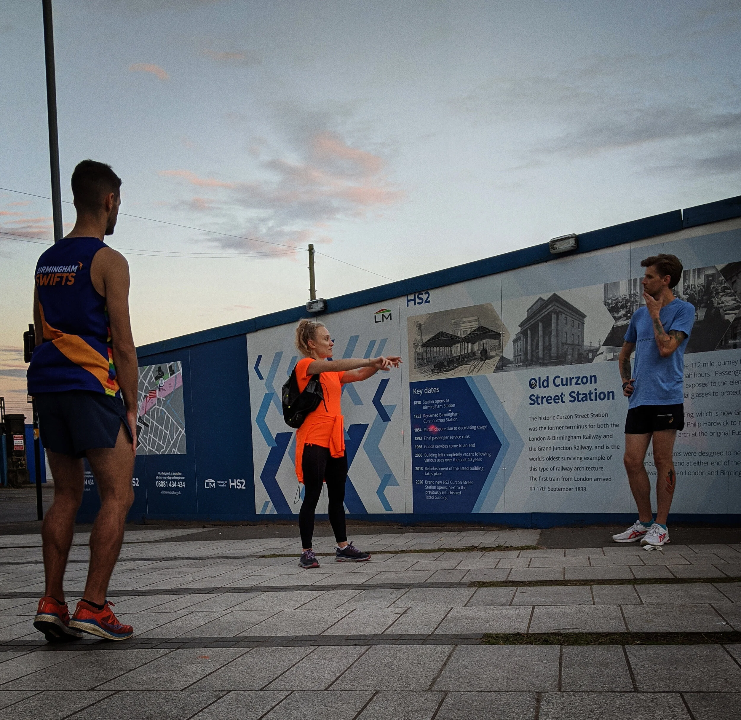 Three people in athletic wear standing in front of a construction site for Old Curzon Street Station, Birmingham, with informational signs on the wall.