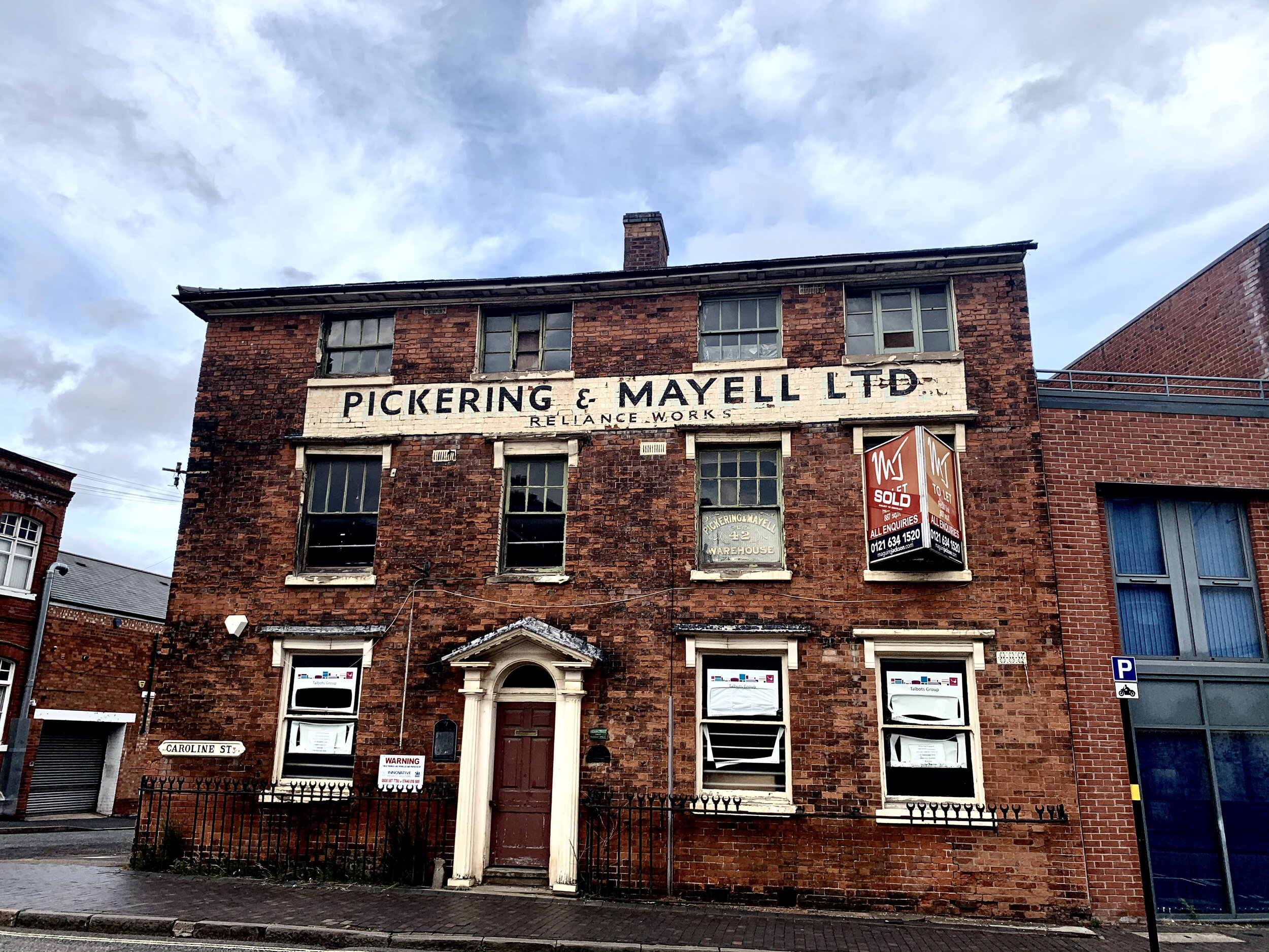 Historic brick building with "Pickering & Mayell Ltd." sign, windows, door, and "Sold" signage.