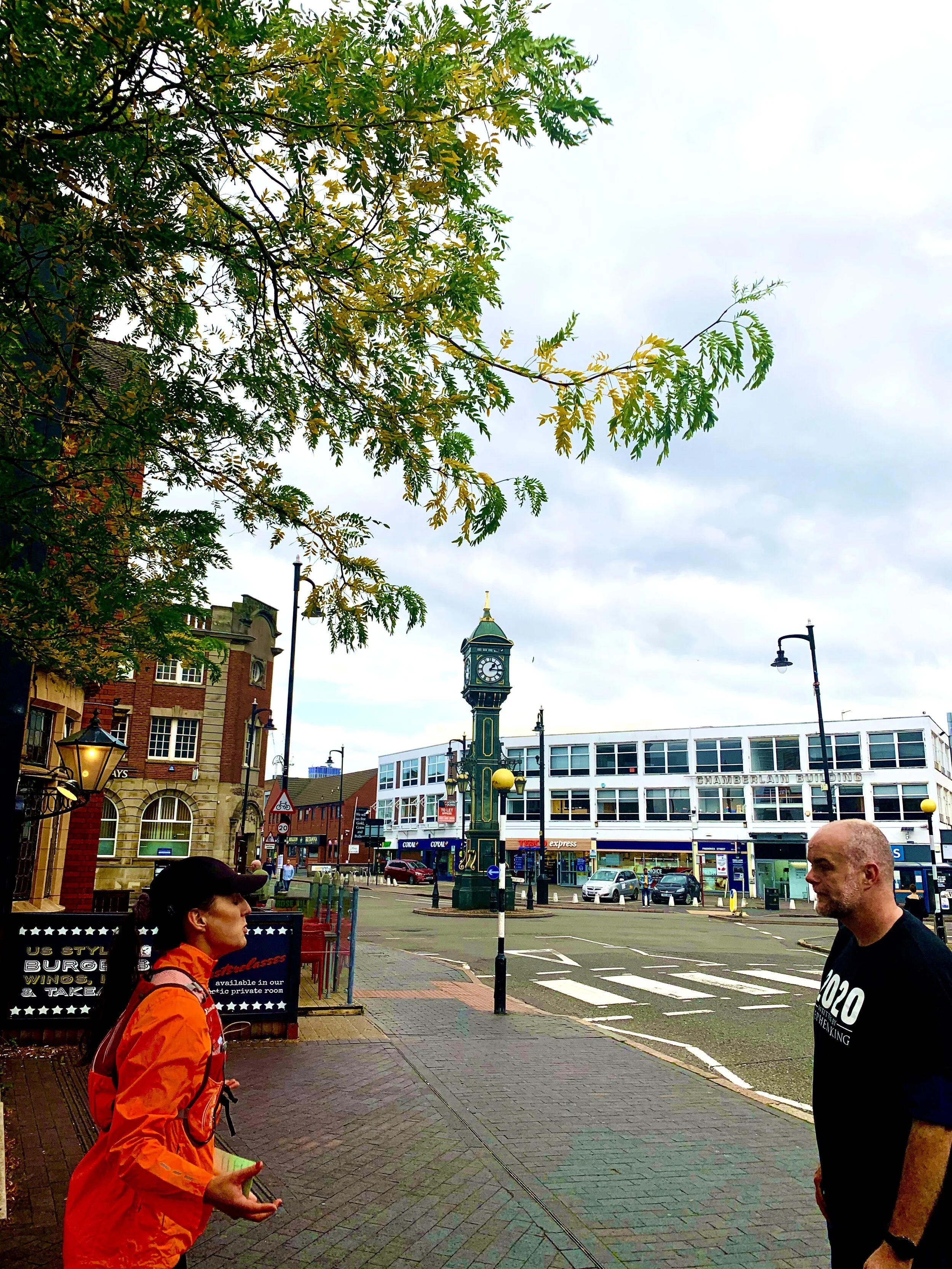 Two people conversing on a street with a clock tower in the background and buildings lining the road. Green trees and a cloudy sky above.
