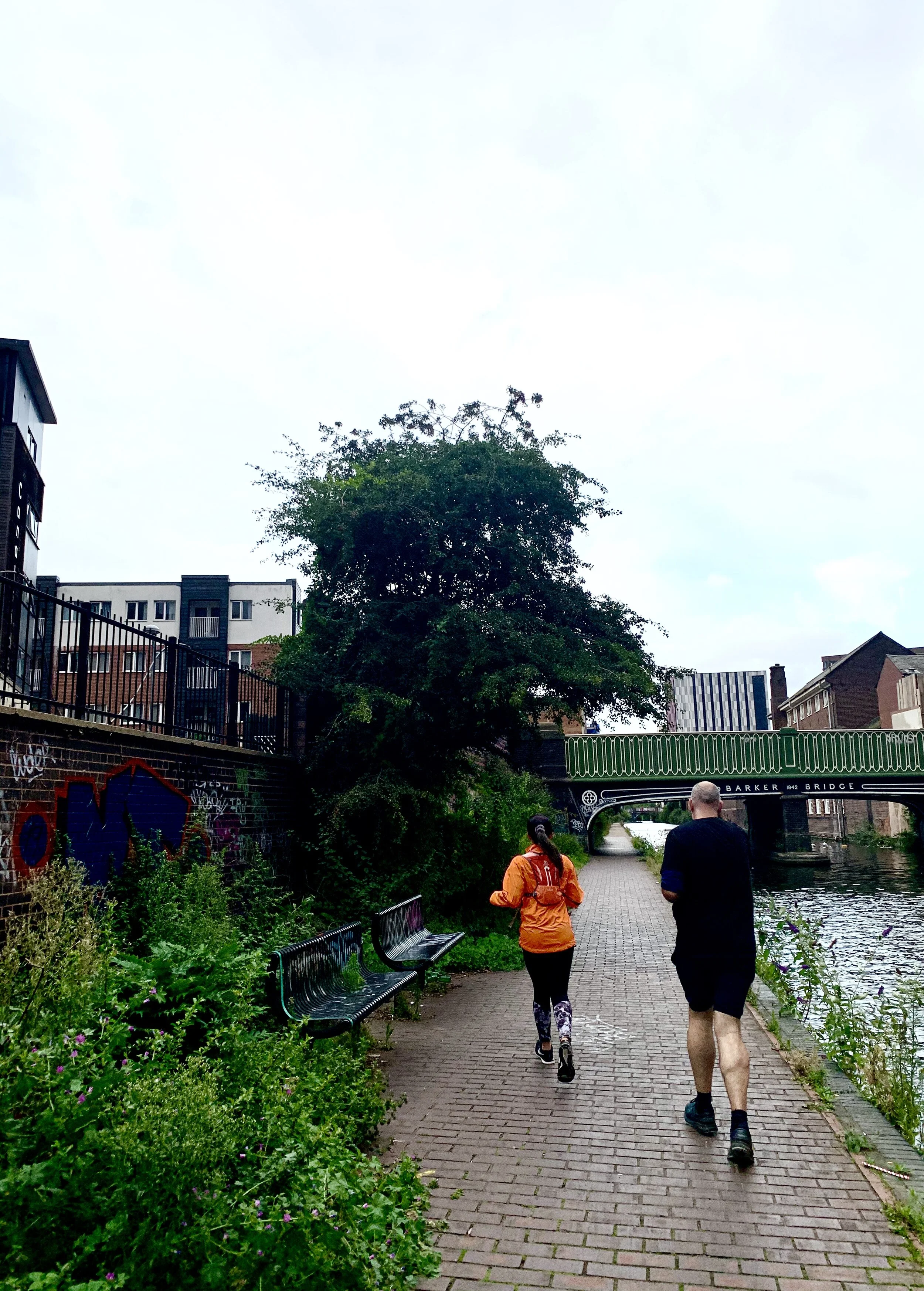 Two people jogging along a canal path with modern buildings and industrial structures in the background; overcast sky.