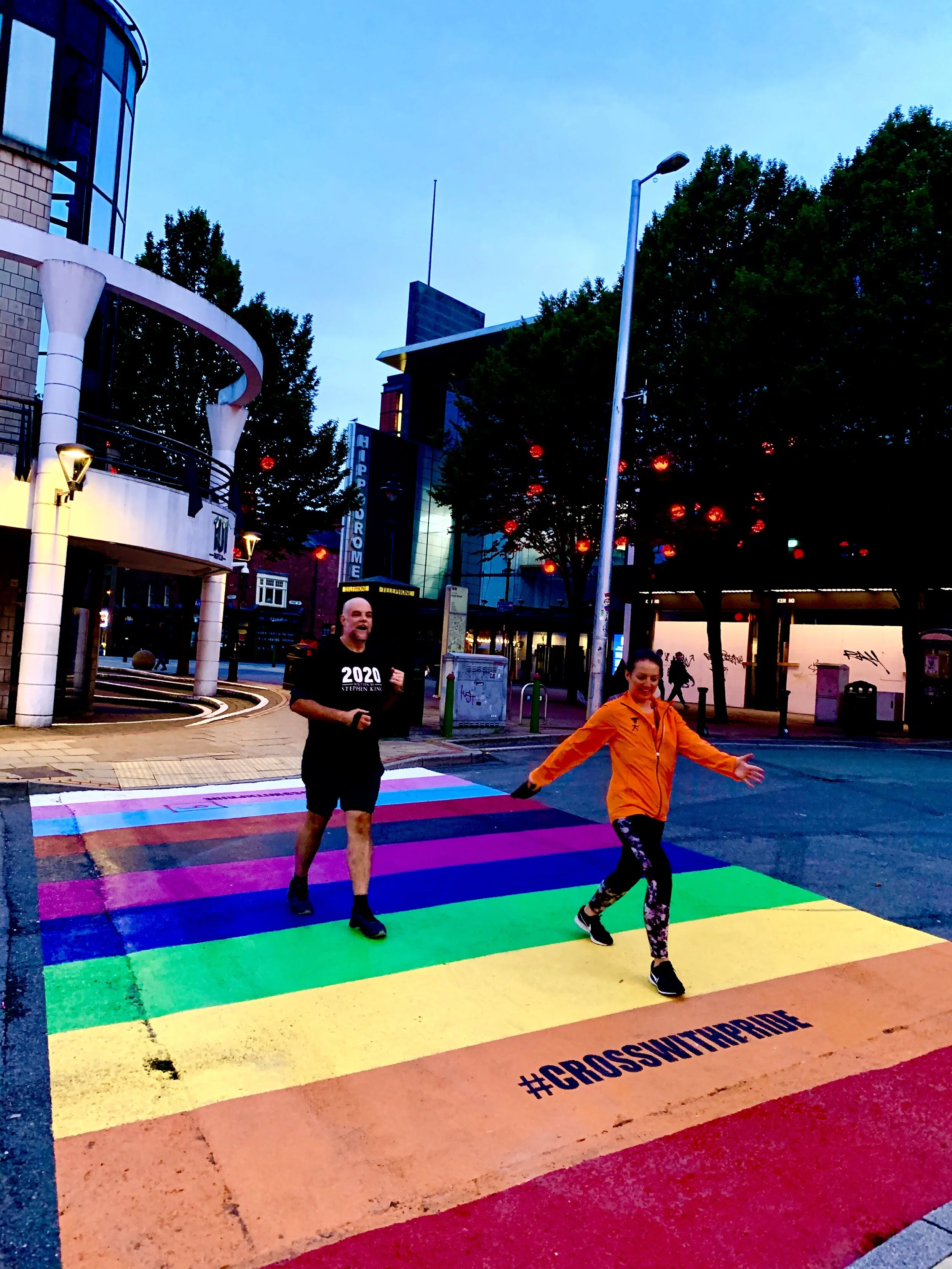 A person running across a brightly lit urban crosswalk painted with rainbow colors at night, with the hashtag #CrossWithPride visible. The background features illuminated buildings and a cyclist.
