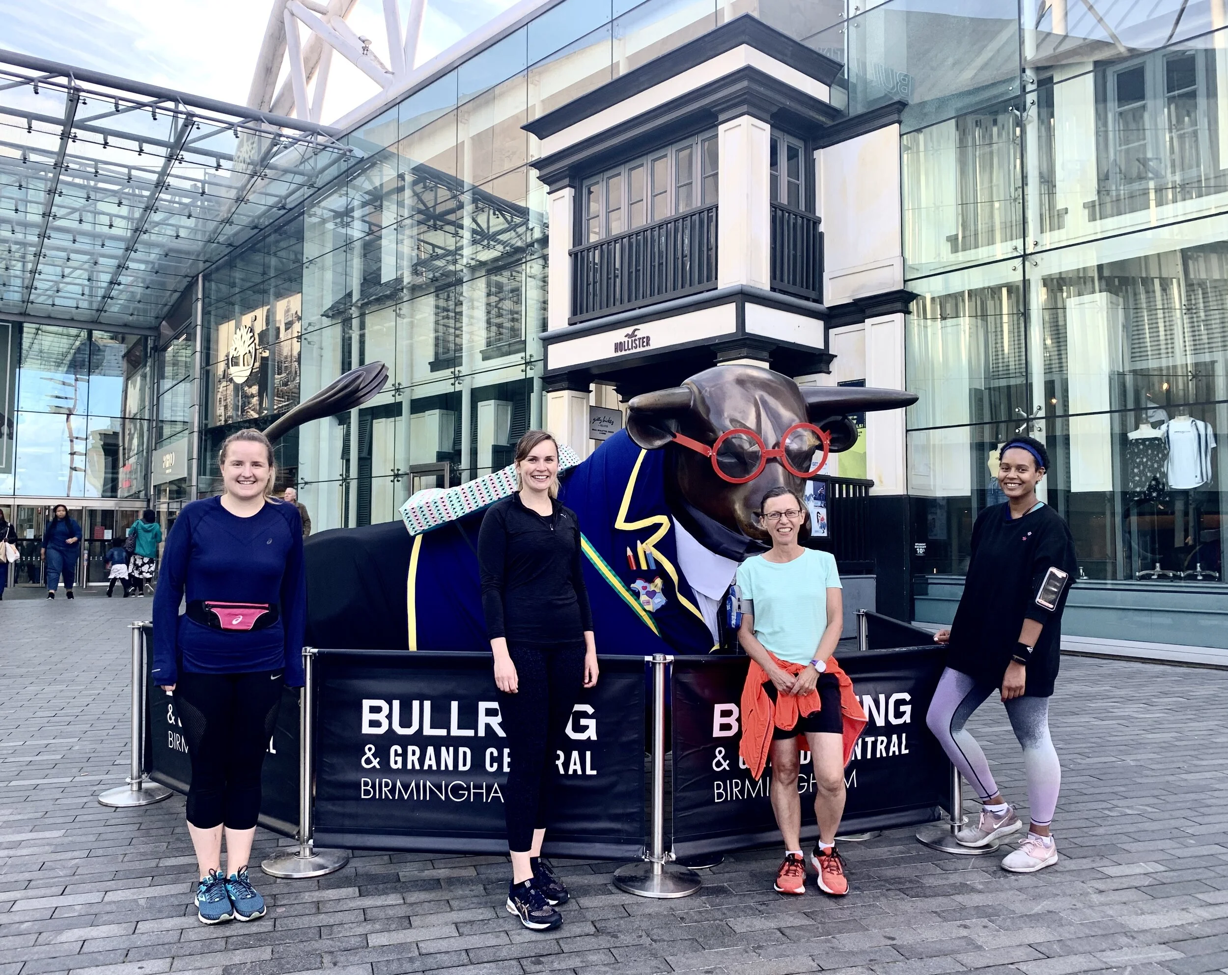 Four people posing with a statue of a bull wearing a suit and large red glasses in front of a shopping center, labeled Bullring & Grand Central Birmingham.