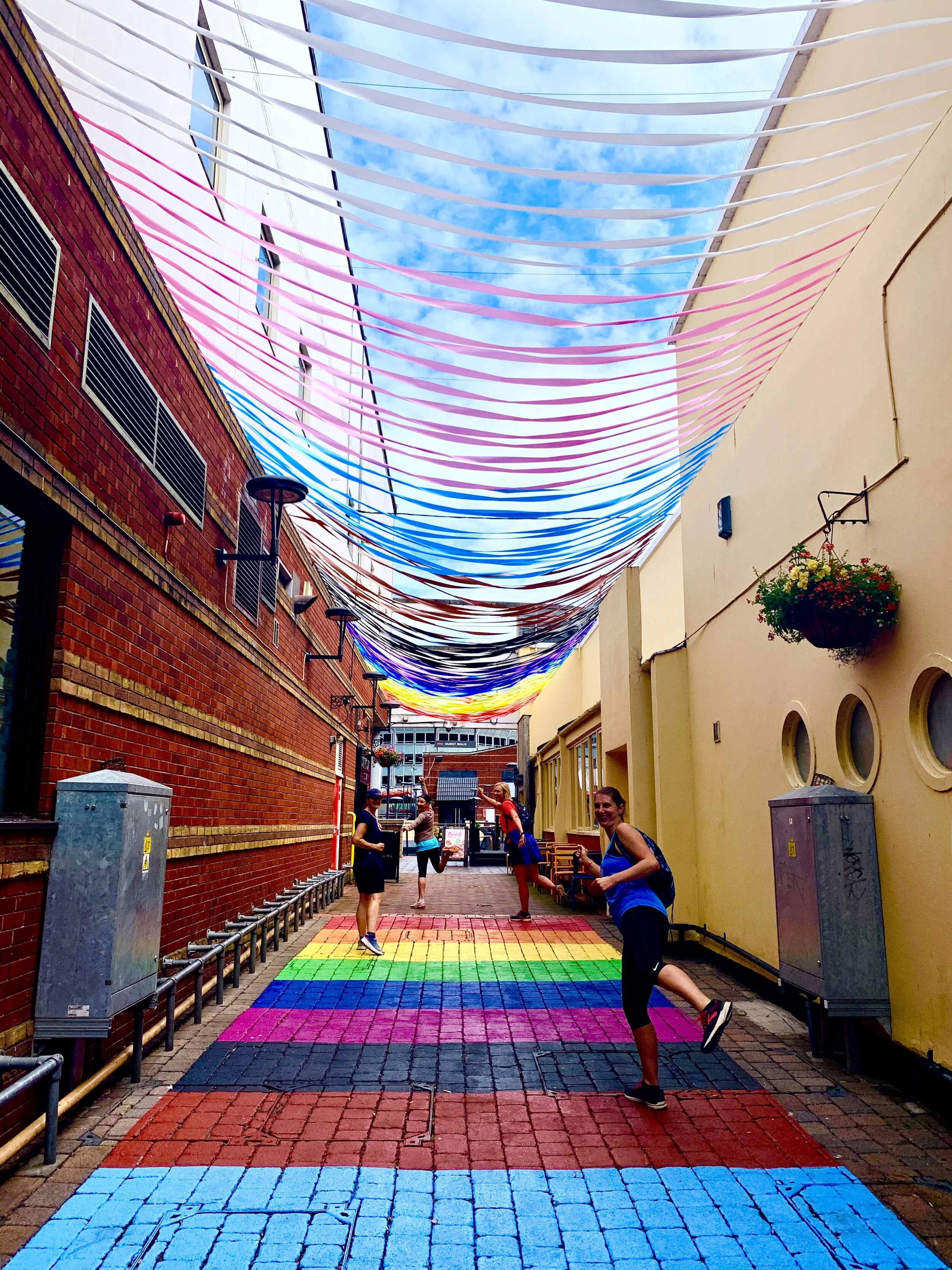 Two people walking through a colorful alley with overhead ribbons and a rainbow striped pathway.