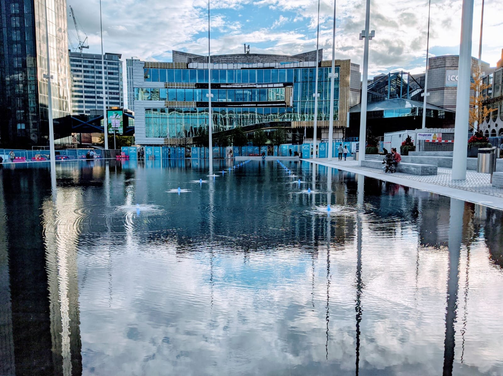 Modern cityscape reflecting in a water feature with buildings and a construction crane in the background, people walking and sitting nearby.