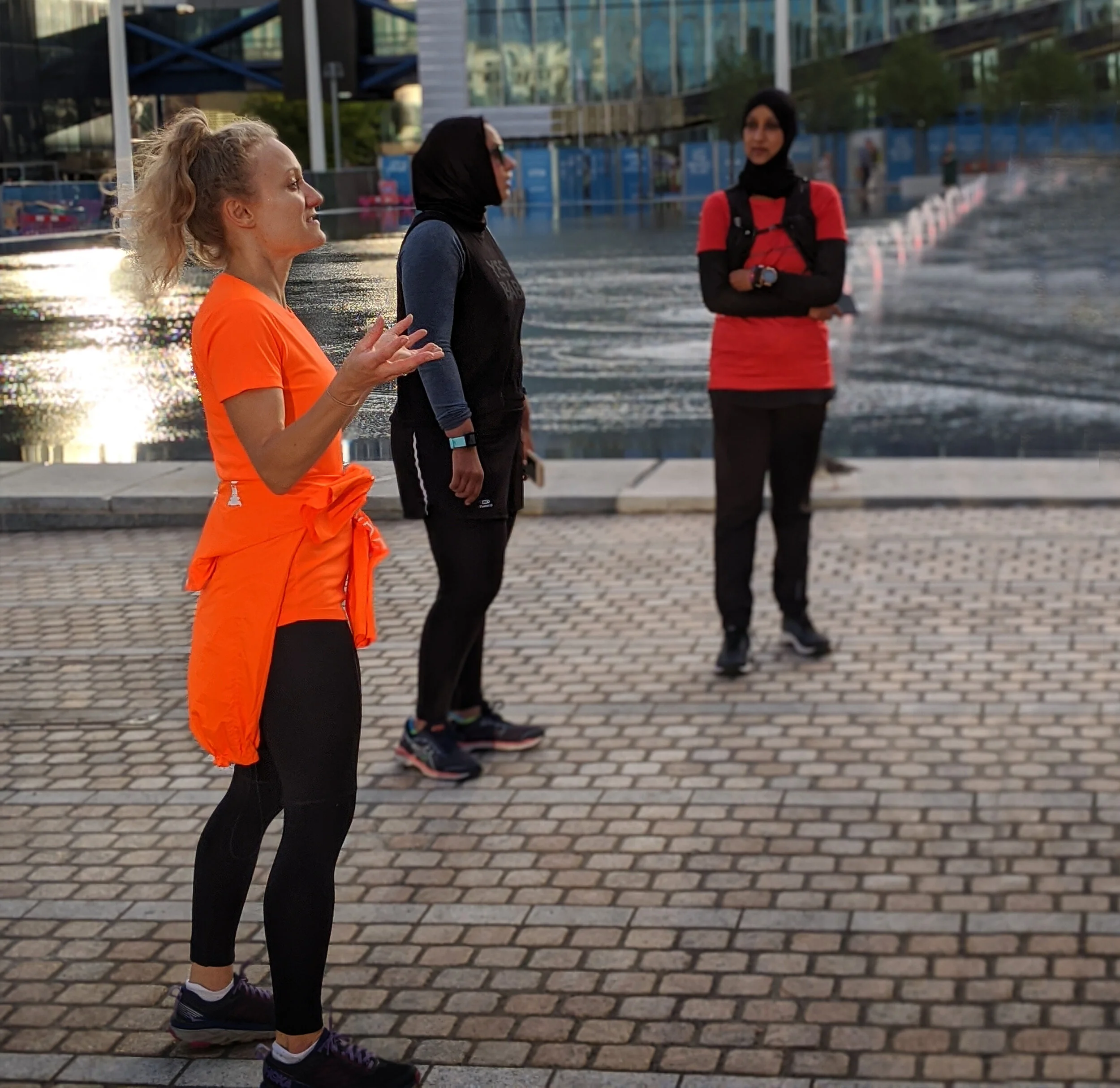 Group of women in athletic wear having a conversation outdoors on a paved walkway near water and modern buildings.