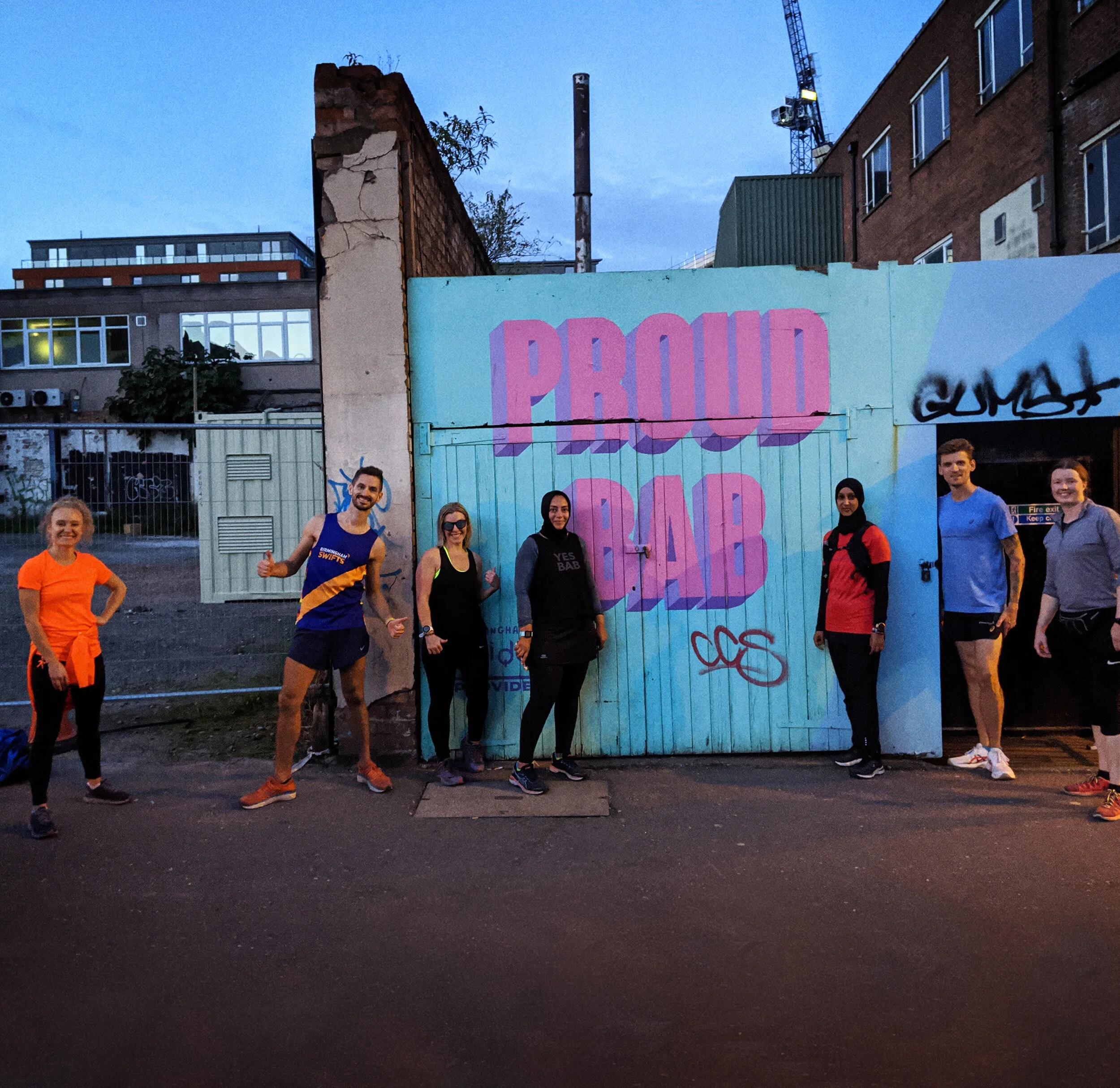 Group of five people in athletic wear standing on a wet street in front of a colorful mural with the words 'PROUD BAR' on a urban background with cranes and an industrial building.