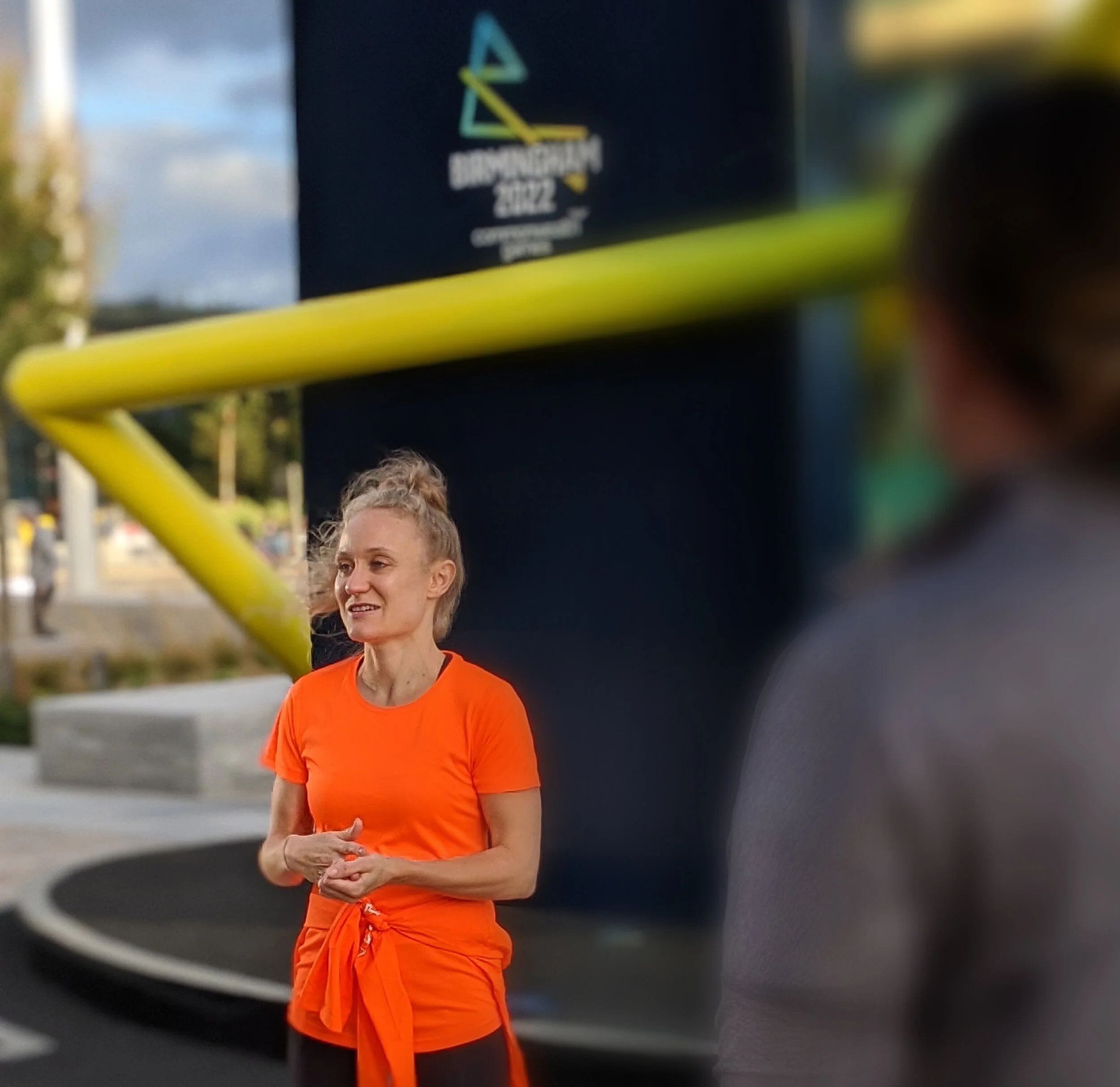 Person in an orange shirt standing outdoors with Birmingham 2022 Commonwealth Games sign in the background.