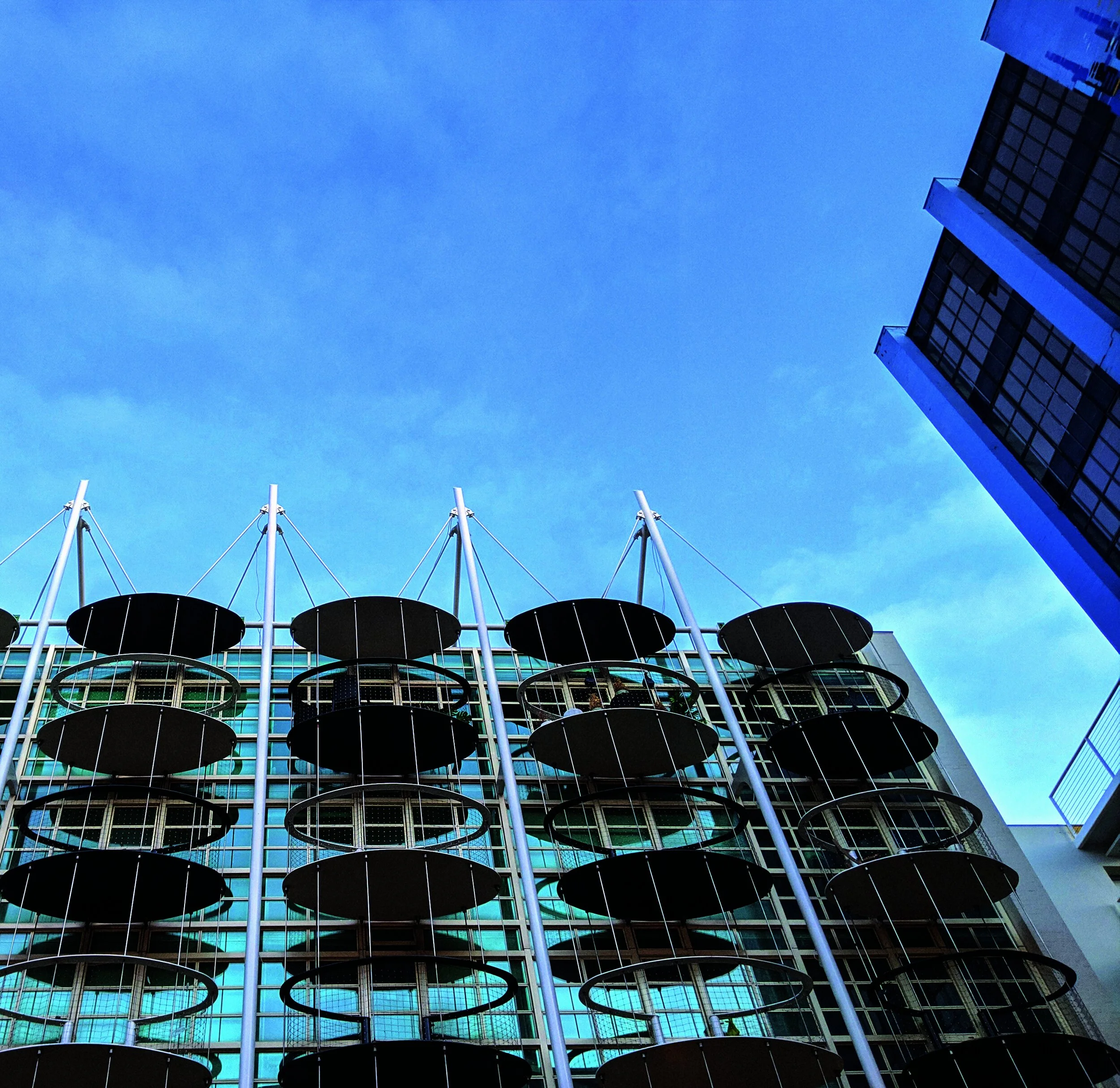 Reflection of a modern building with geometric patterns in a glass facade, under a blue sky.