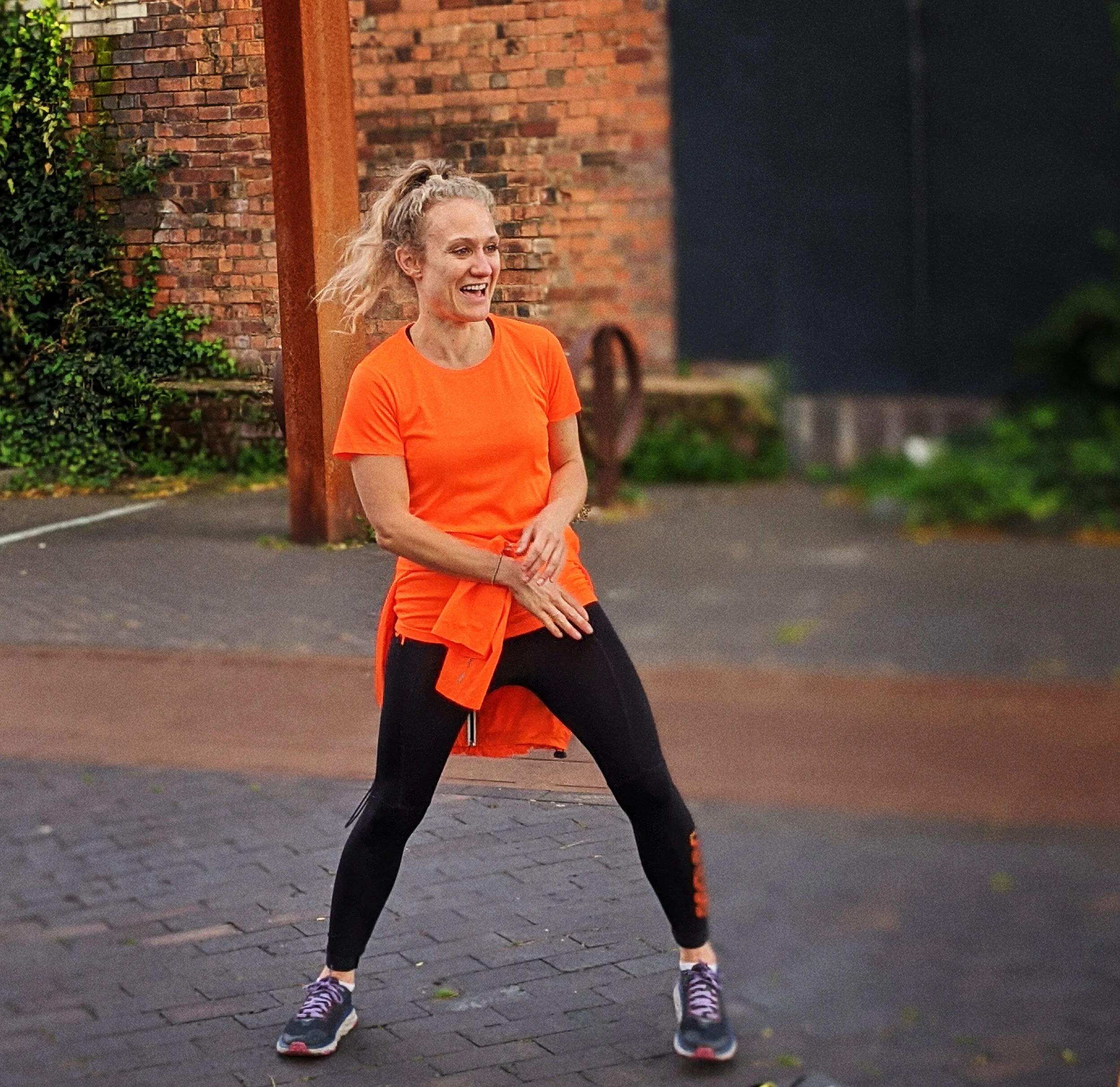 Person in an orange shirt and black leggings exercising outdoors on a brick pavement.