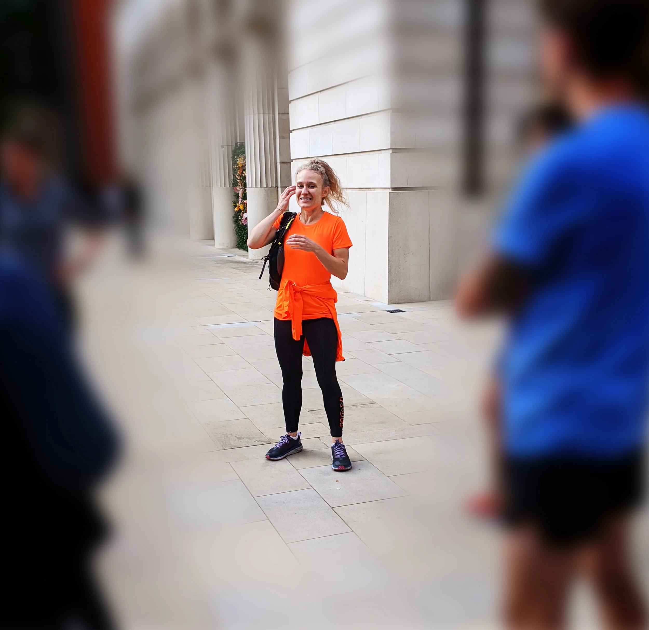 Woman in orange shirt and black leggings standing on a city sidewalk, smiling, surrounded by blurred people.