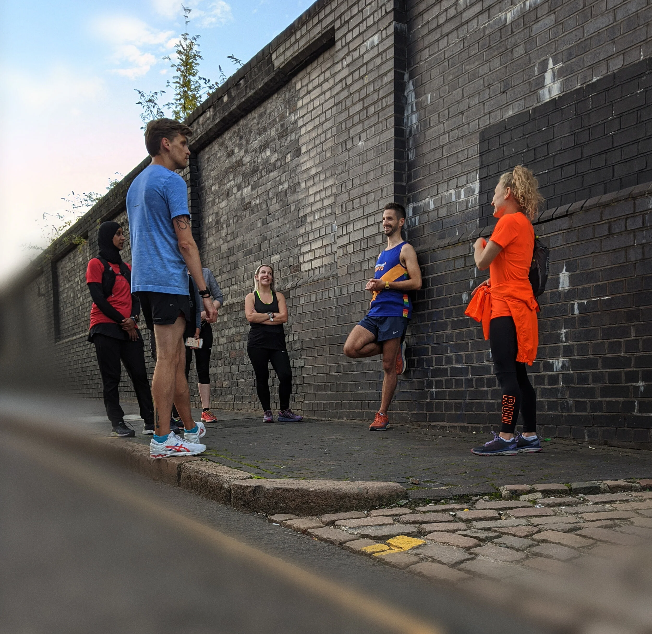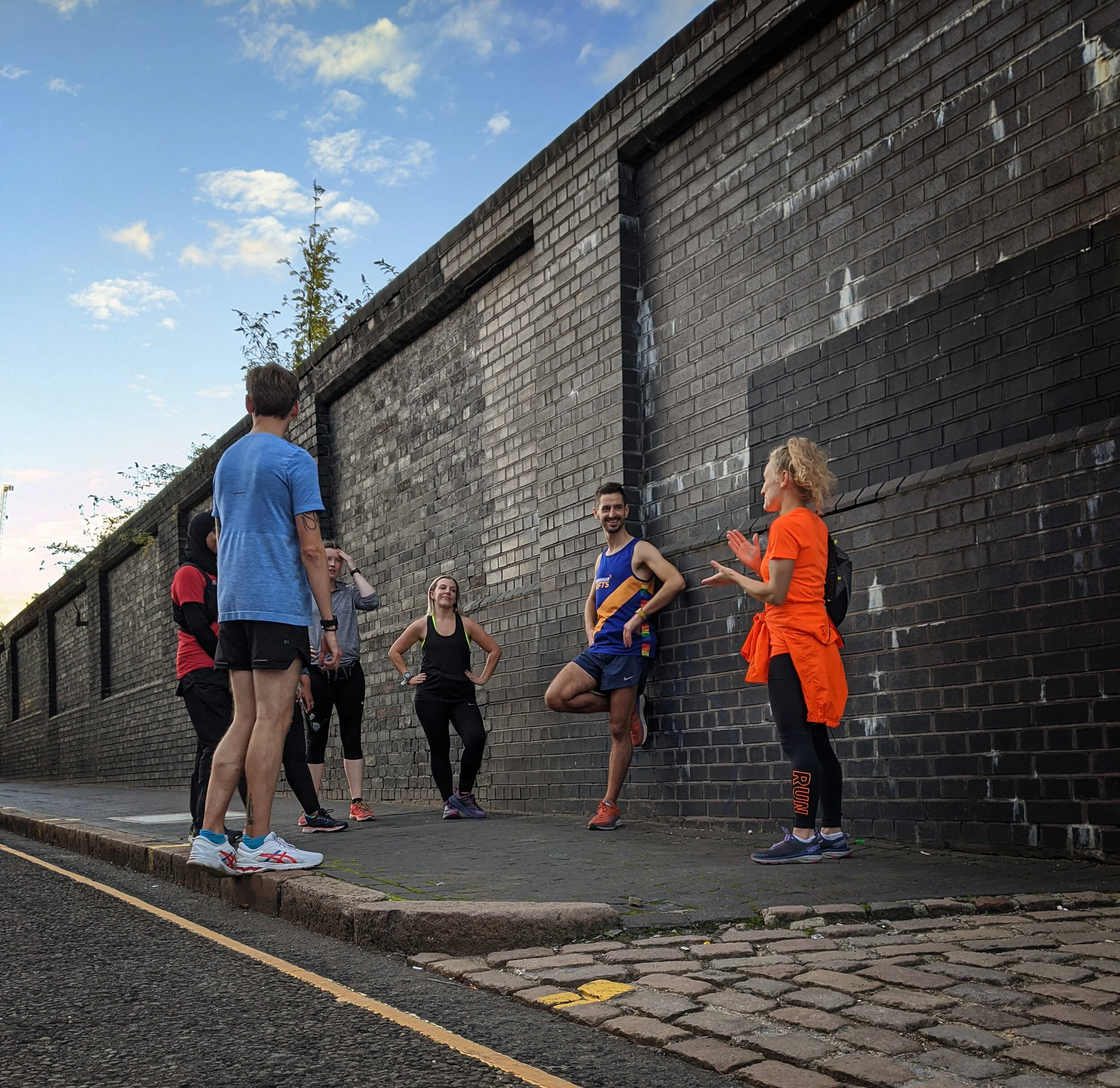 Group of people in athletic wear standing and talking by a brick wall, with a focus on casual conversation and outdoor exercise.