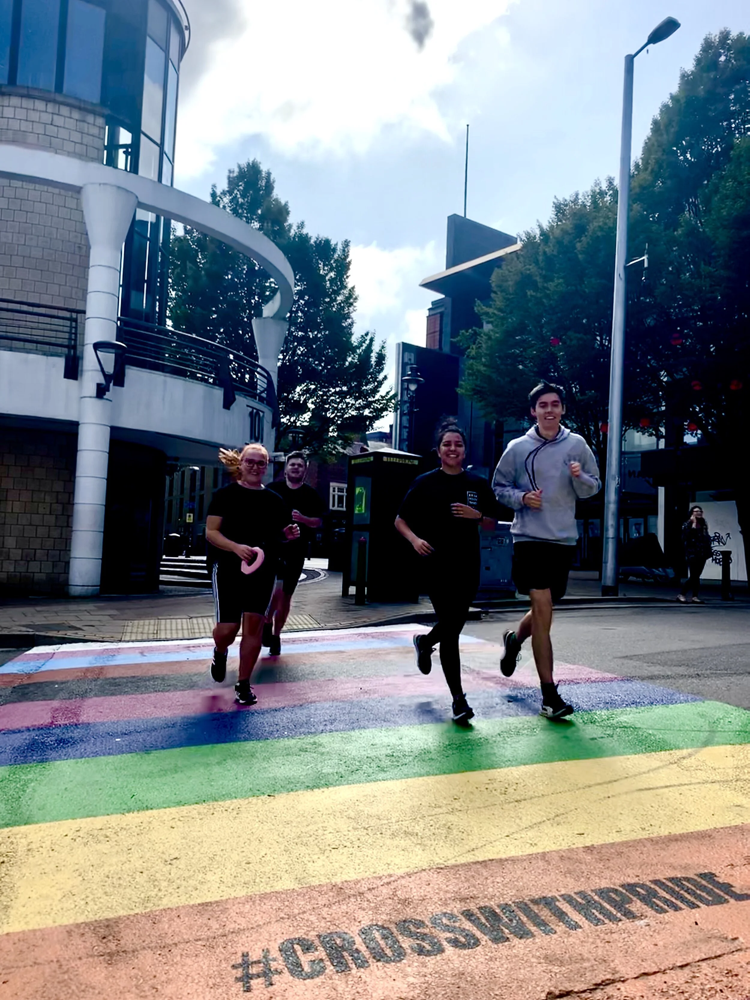 Group of people running on a rainbow crosswalk with #CROSSWITHPRIDE written on it, near buildings and trees.