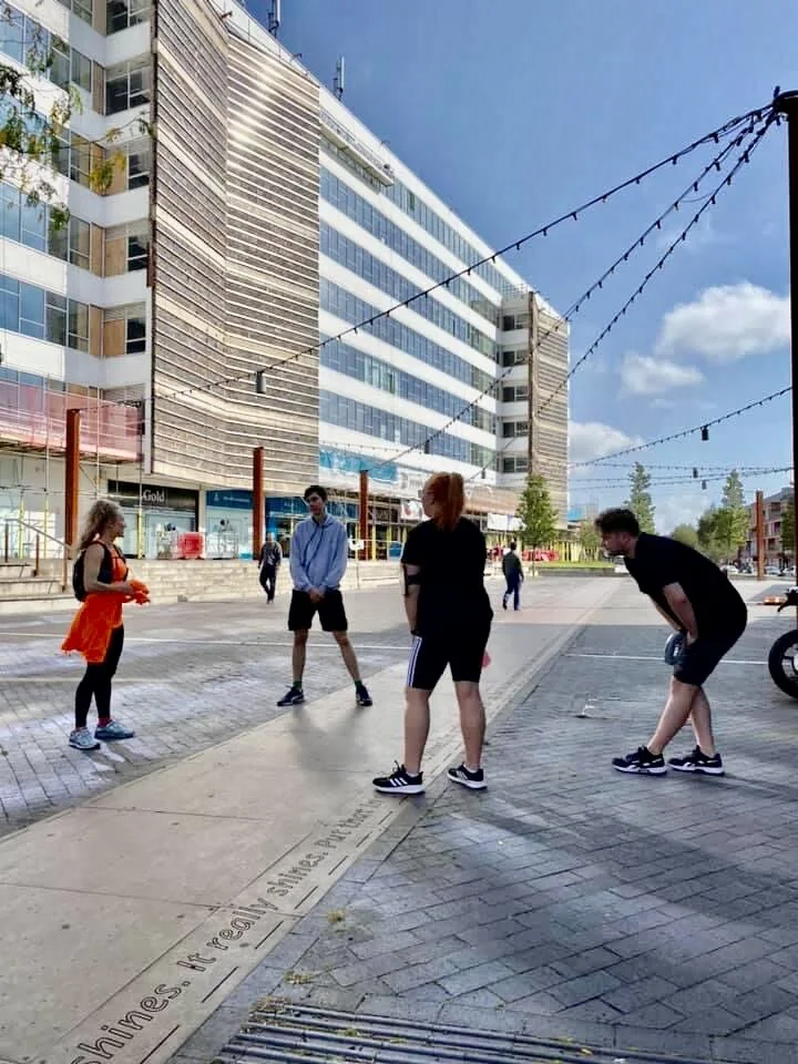 A group of people standing in a circle on a paved area outdoors, engaging in a conversation or activity. They are in athletic clothing, and there is a historic building with columns in the background. The sky is cloudy, and there are trees around the
