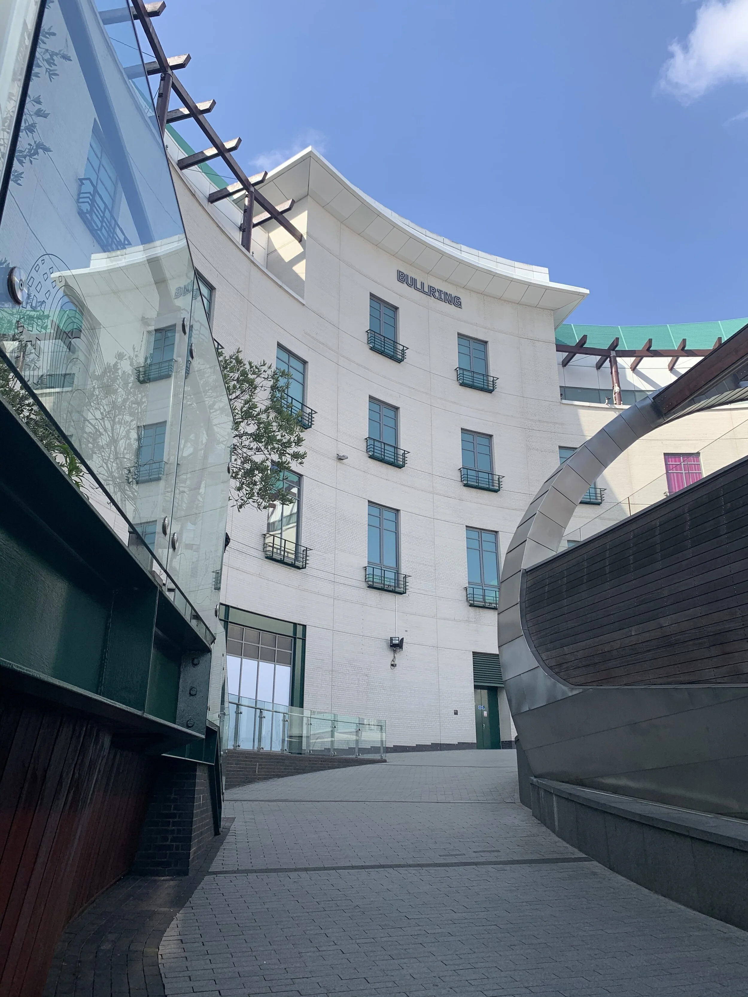 Modern building with "Bullring" sign, featuring glass and metal architectural elements, curved exterior walkway, blue sky.
