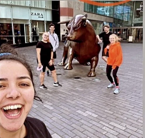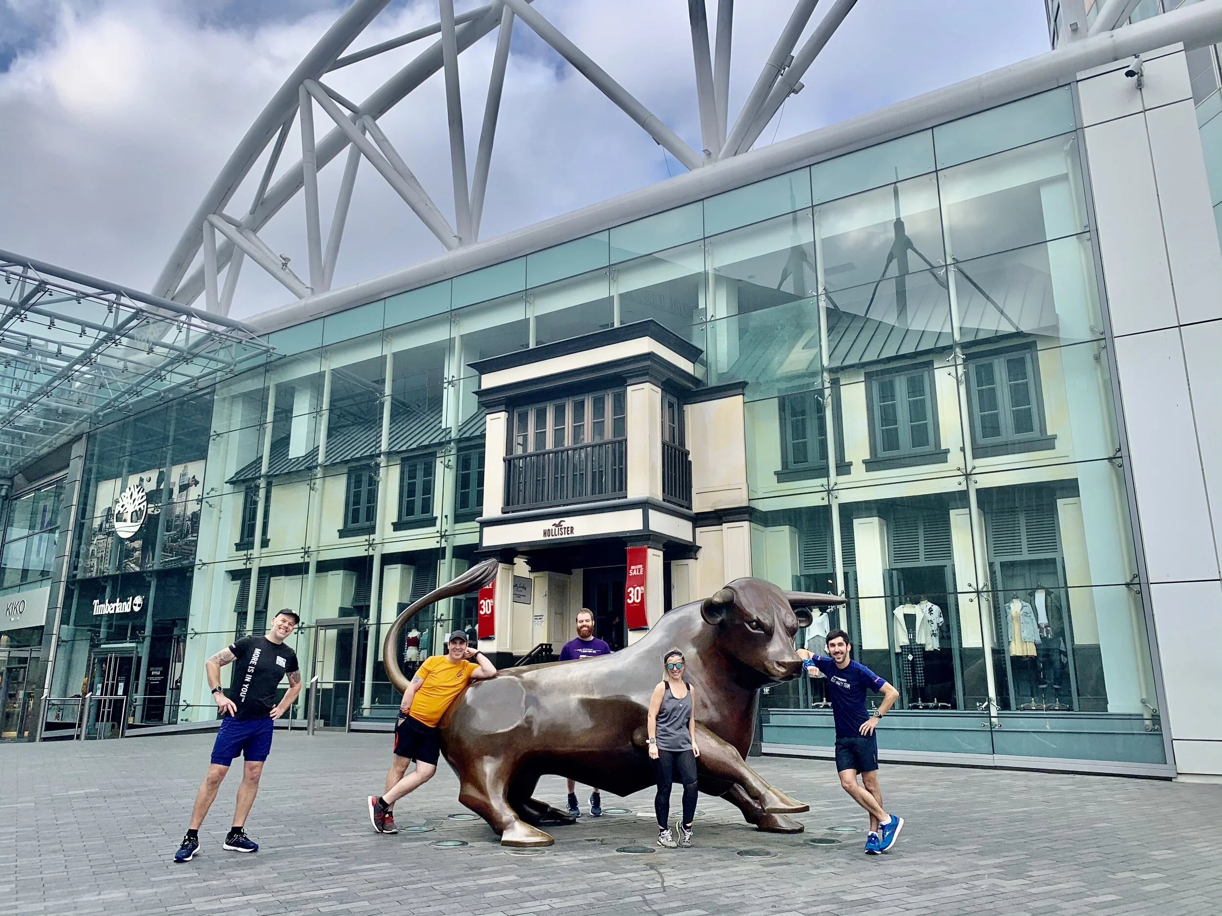 A group of people in athletic wear posing in front of a large bull sculpture in an urban area with modern glass buildings and storefronts.