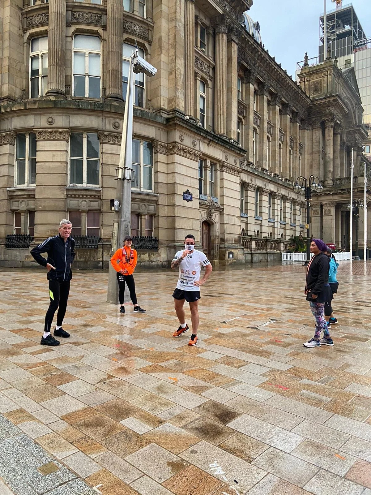 Four people exercising in front of a historic building at Victoria Square with scaffolding on one side.